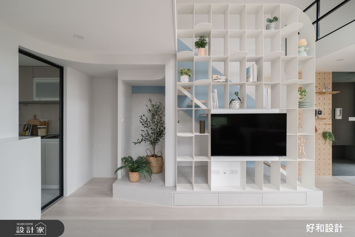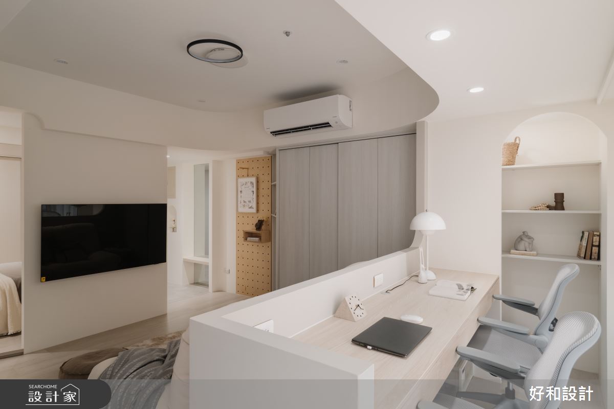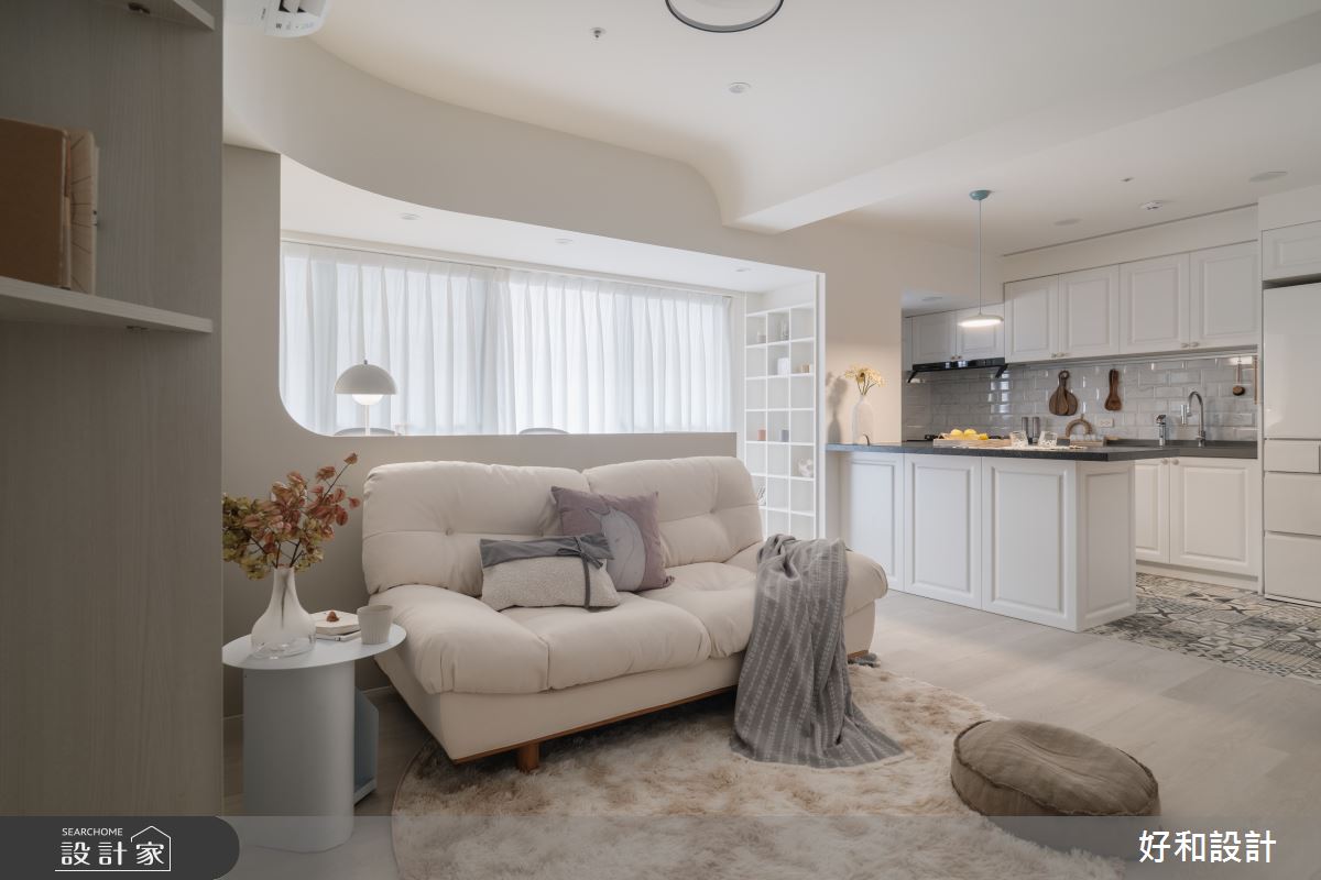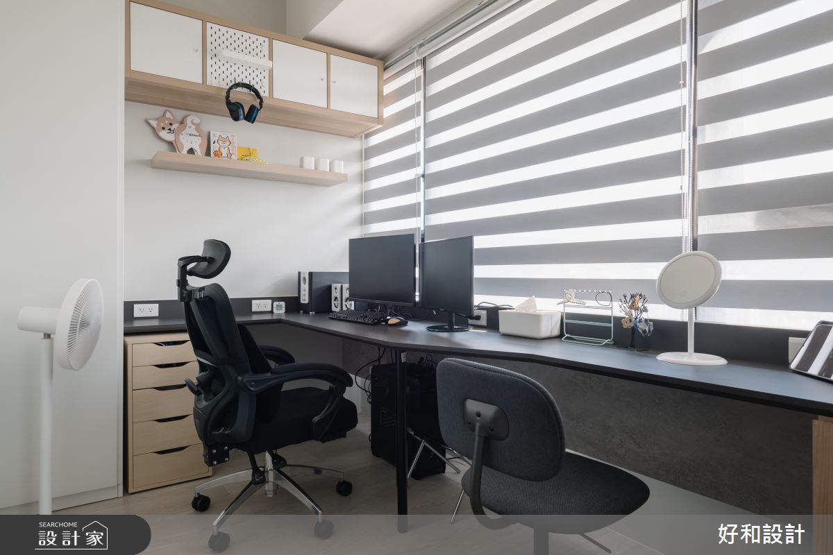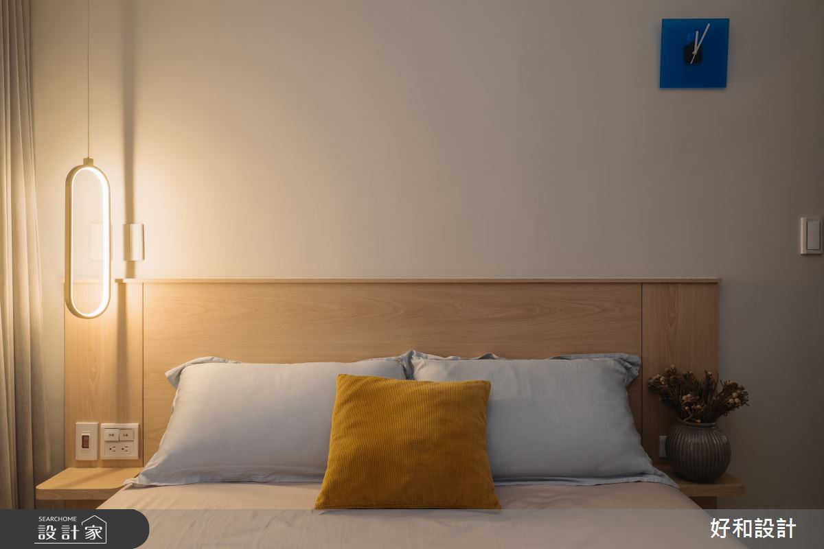 好和設計以乳膠漆、班傑明摩爾、BAUSEN超耐磨地板、人造石、長虹玻璃、類木皮科技板、格柵、浮雕科技古典橡木、風巢簾、系統板、波特蘭砂岩的搭配應用,呈現簡約風居家氛圍,將此間14坪、一房、單層、新成屋(5年以下)打造成舒適愜意的家庭空間,完成1位大人全家人的夢想之居。
