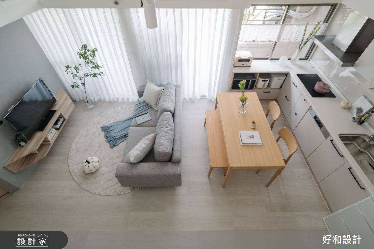 由好和設計精心規劃的17坪兩房住宅空間,家庭成員一共有2位大人、1位小孩。因應屋主需求,設計師運用北歐風作為主軸,搭配乳膠漆、鐵道磚、花磚、超耐磨木地板、鐵件、烤玻、木作貼皮、木百葉、人造石、軌道燈,打造全家人的夢想家居。
