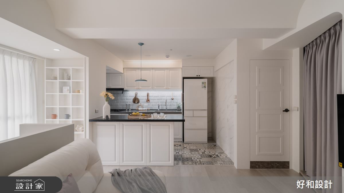 好和設計以油漆、乳膠漆、花磚、超耐磨木地板、鐵件、灰鏡、烤玻、木作貼皮、系統板材、人造石的搭配應用,呈現北歐侘寂風居家氛圍,將此間16坪、兩房、單層、預售屋打造成舒適愜意的家庭空間,完成2位大人、1位小孩全家人的夢想之居。