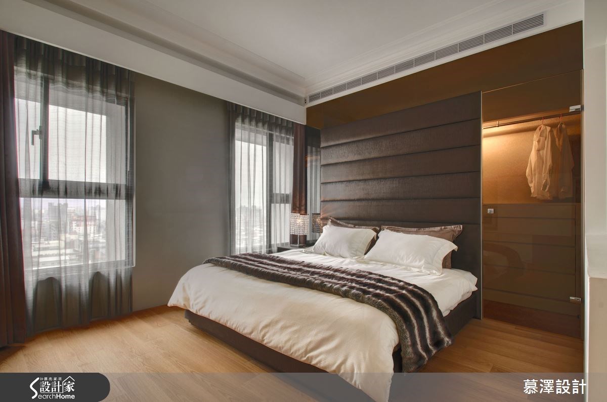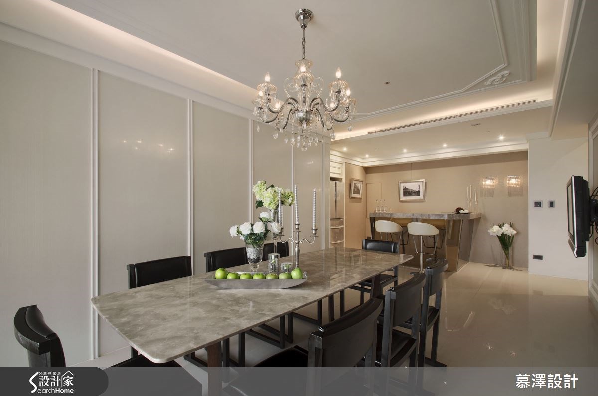 提到豪宅,你會先想到什麼?這次我們將造訪位於新北市新莊區的案例空間,坪數就達 108 坪,在這個房價高居不下的時代,真是貨真價實的豪宅等級。房屋三面採光視野佳,基本條件十分優良,但缺點是樑位過低,加上動線規畫不佳,並不適合屋主的居住習慣。慕澤設計團隊進行勘查後,利用精湛的設計技法,打造出帶有新古典奢華迷人的氣韻空間,成就出精品感的豪宅氣勢,一同來看看慕澤設計是怎麼做到的! 好的空間除了採光要好,也應注意視覺的延伸感,因此慕澤設計團隊特別提出了以空間帶動延伸感,像是和室書房就是客廳的延伸,在沙發背牆後方規劃出和室書房,架高的設計,讓空間設計更具層次感。另外也在餐廳前方的走道空間,設置一組挑高的時尚吧檯,使吧檯成為餐廳空間的延伸,讓屋主二人在此度過浪漫的小酌時刻。針對樑柱過低的惱人問題,設計團隊則利用收納櫃來包覆樑柱的聰明辦法,不僅增加了收納機能,也能美化樑柱,酒櫃下方,則是沉穩灰色的壁爐意象,使新古典的風格,顯得完整而點題。此外,像是依據客房空間的轉折,重新規畫動線,增設了休閒室,讓家的機能更豐沛。 由於屋主本身喜好閱讀、品酒,為建構出與屋主風格相映襯的優雅空間,設計團隊選用了古典線板、主人單椅、皮質沙發、造型燈飾、大理石建材等元素,使古典雅致的空間線條,瀰漫著一股濃厚的人文氣息感。透過慕澤設計,以俐落大方的線條勾勒空間,適時為空間留白,選用白色雋永為主視覺色調,讓寬敞的豪宅空間,烘托出經典迷人的新古典豪宅。 小編的最愛 客廳是家的靈魂,設計團隊在客廳天花板,以多層次的簡約線板堆疊的手法,讓天花板富有設計感且簡潔不繁複。同樣的精湛技法,也應用在電視背牆上,多層次的線板,彷彿就像是立體的巨型畫框,框住了進口板岩磚所構件的壁面,板岩磚的特殊自然紋理,使壁面帶有歐風的氣息,激盪出豪宅獨有的氣派低奢感。