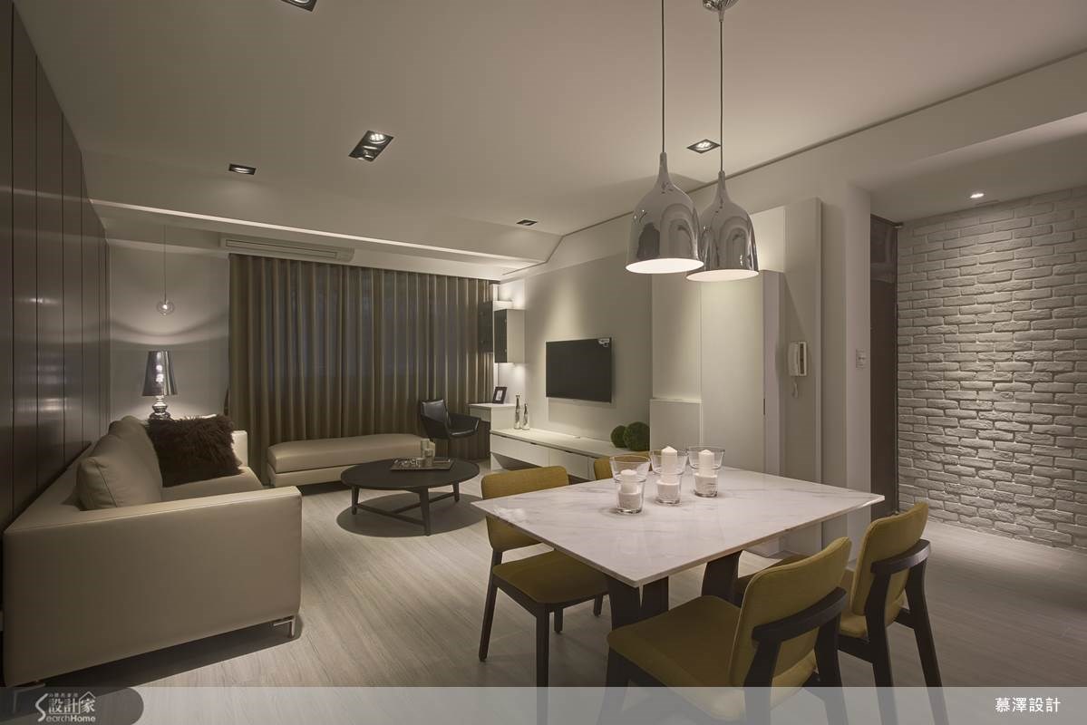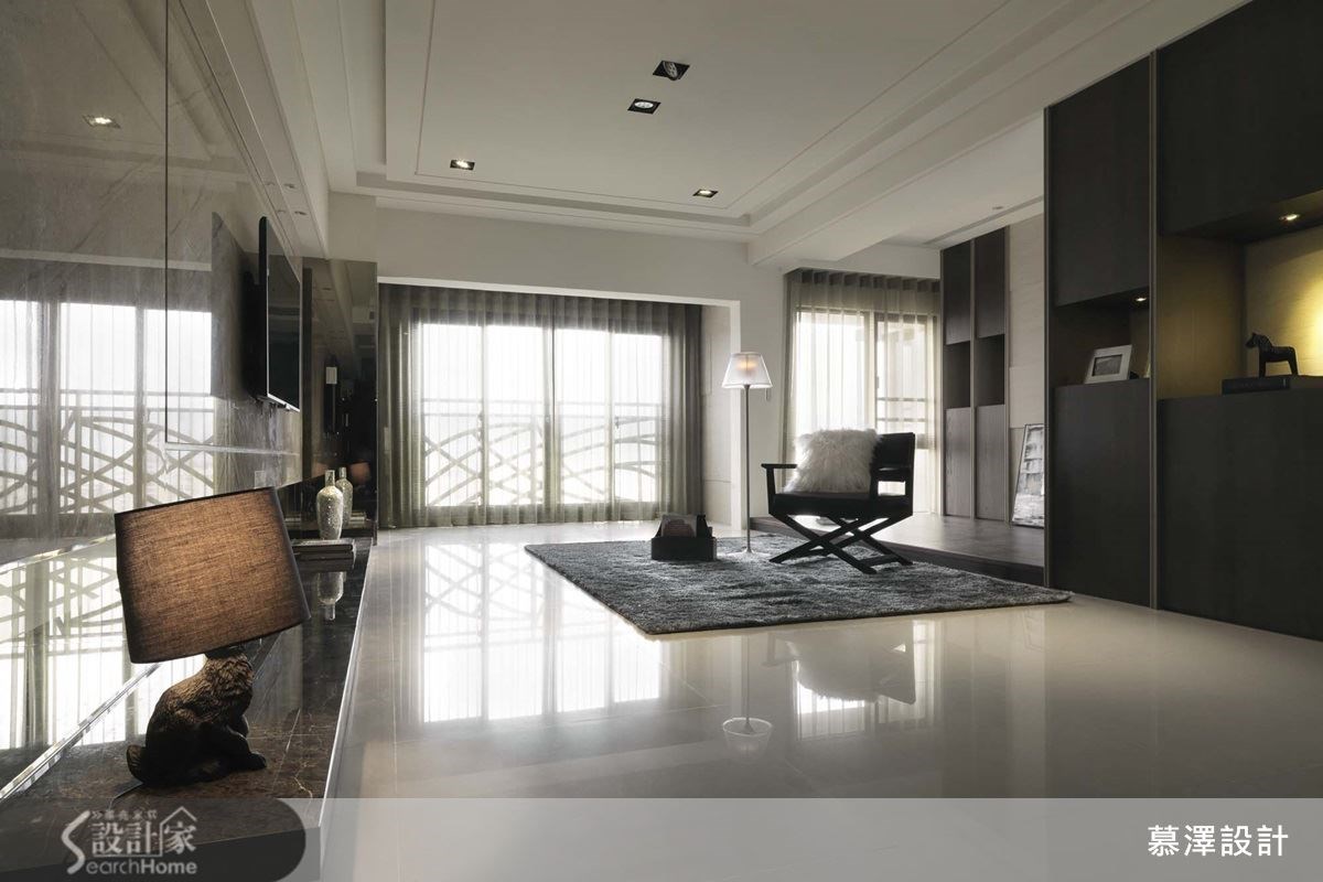 身處繁忙大都會的上班族們,若是下班時刻能慵懶地坐臥在沙發上,啜飲一杯微酸的 White Lady 白色佳人雞尾酒,想必擁有無比的好心情,生活如渡假般永不收心。 擅長營造精品質感的慕澤設計團隊,這次以時尚白色作為主基調,就像啜飲調酒一般,讓整體空間充滿優雅又浪漫的細膩美學氛圍。位於台北市都會區的 60 坪單層空間,共規劃了偌大的公領域客餐廳、與足夠的三間臥房、一間書房、一間多功能遊戲間,主臥室則留有男女主人充足的衣帽空間,並將全室以淡雅的現代新古典作為風格定義。 從玄關進入客廳動線後,公領域立即感受溫暖與沉穩的白色浪漫,從白色系古典風的收納牆,延伸到大理石電視牆崁入的白色系櫃體,與一大片落地窗透出光亮的白色紗簾,再加上點綴角落的白色系大型攝影棚傘燈與桌燈,再深入瀏覽到餐廳的白色吧台,和室內其他空間立面也多以白作為主色系,整體可見設計師透過白色的多層次,堆疊出屬於屋主獨特的精品居家美學。