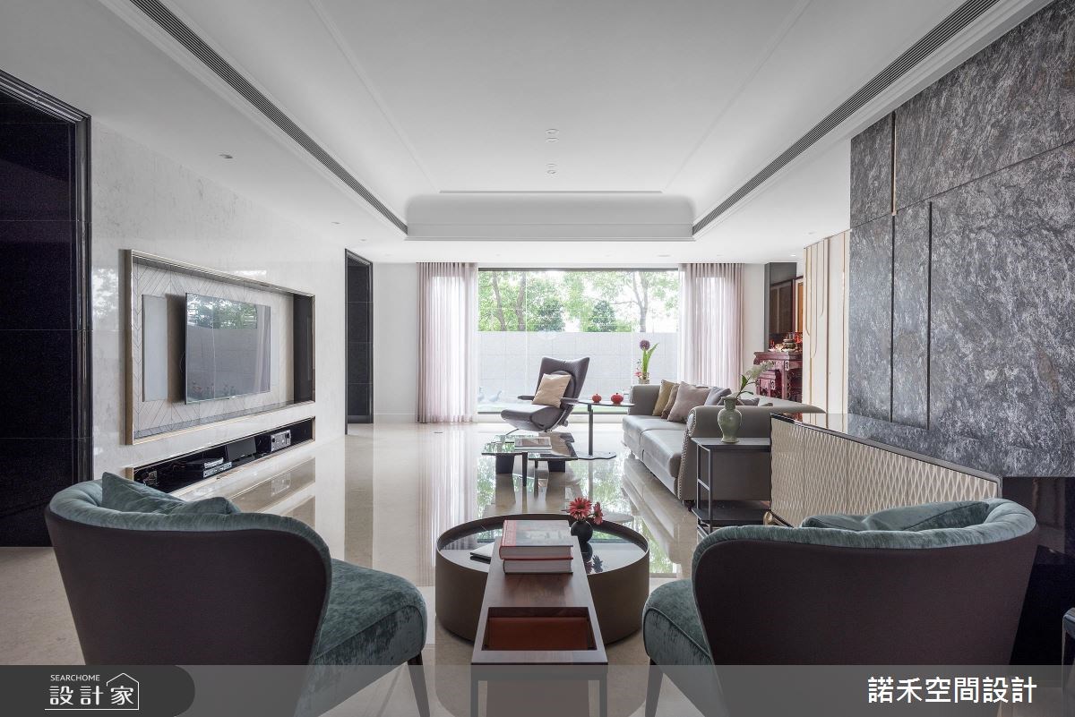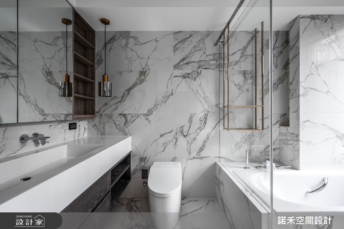 由諾禾空間設計 上碩設計精心規劃的72坪三房住宅空間。因應屋主需求,設計師運用混搭風作為主軸,搭配大理石、木皮美耐版、人字拼木地板、特殊塗料、水波紋玻璃磚,打造全家人的夢想家居。