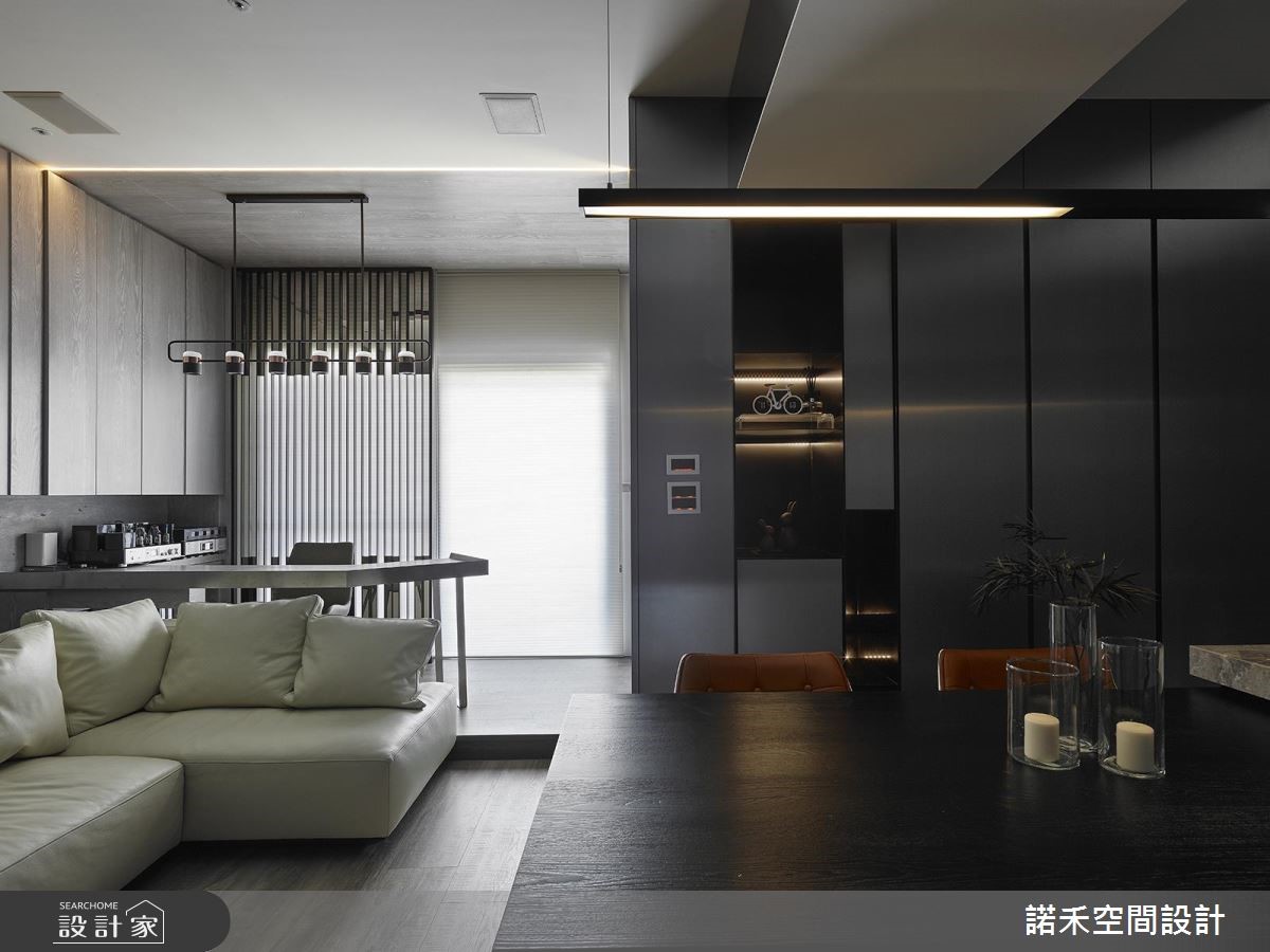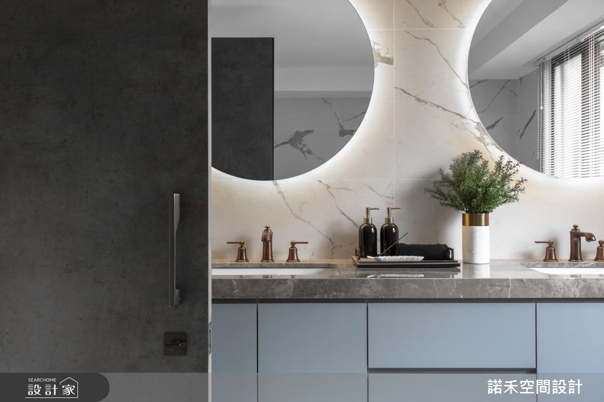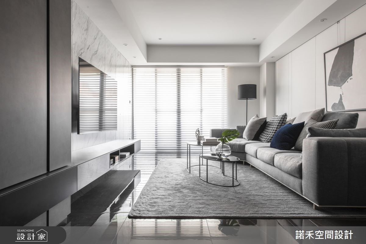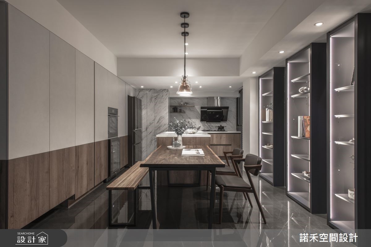 這間歷經多年的老房子,伴隨著男屋主一路成長,充滿著生活的點滴回憶。原本空間雖找到設計師規劃,但因為某些原因中止合作,最後終於找到諾禾設計接續操刀,翻轉老屋、打造一處高質感的迷人新婚宅。 乾淨線條刻劃出簡約的空間感受,敞朗日光隨著落地窗引入室內,灑落滿地明亮、潔淨之感。以白色基底、柔和紋理的大理石打造電視牆,溝縫細節勾勒出漸層視感,深色的電視矮櫃延伸至側邊櫃體,深淺色調的安排下,鮮明的視覺烘托屋主的獨特性格;沙發背牆以白色為底,表面的溝縫細節呼應電視牆的俐落、明快風情,現代感的畫作與沙發上的跳色抱枕,融化簡約色調堆疊的寂靜氣息,多了一股活潑感;餐廚空間相融為一,中島與餐桌並列的方式,拉出兩側行走動線,深色木紋的餐桌椅替現代感的空間挹注溫潤情懷,牆面藉由開放書櫃讓屋主的藏書與收藏品得以收納,櫃體結合內嵌照明,讓陳列其中的物件彷彿精品般,流露出非凡質感。 小編的最愛 將客廳、餐廳、廚房安排在同一軸線上,整體空間完全敞開來、更顯開闊;也實現了女屋主渴望的更衣室與大浴缸的夢想,不僅兼具視覺美感,讓家的機能臻於完善。