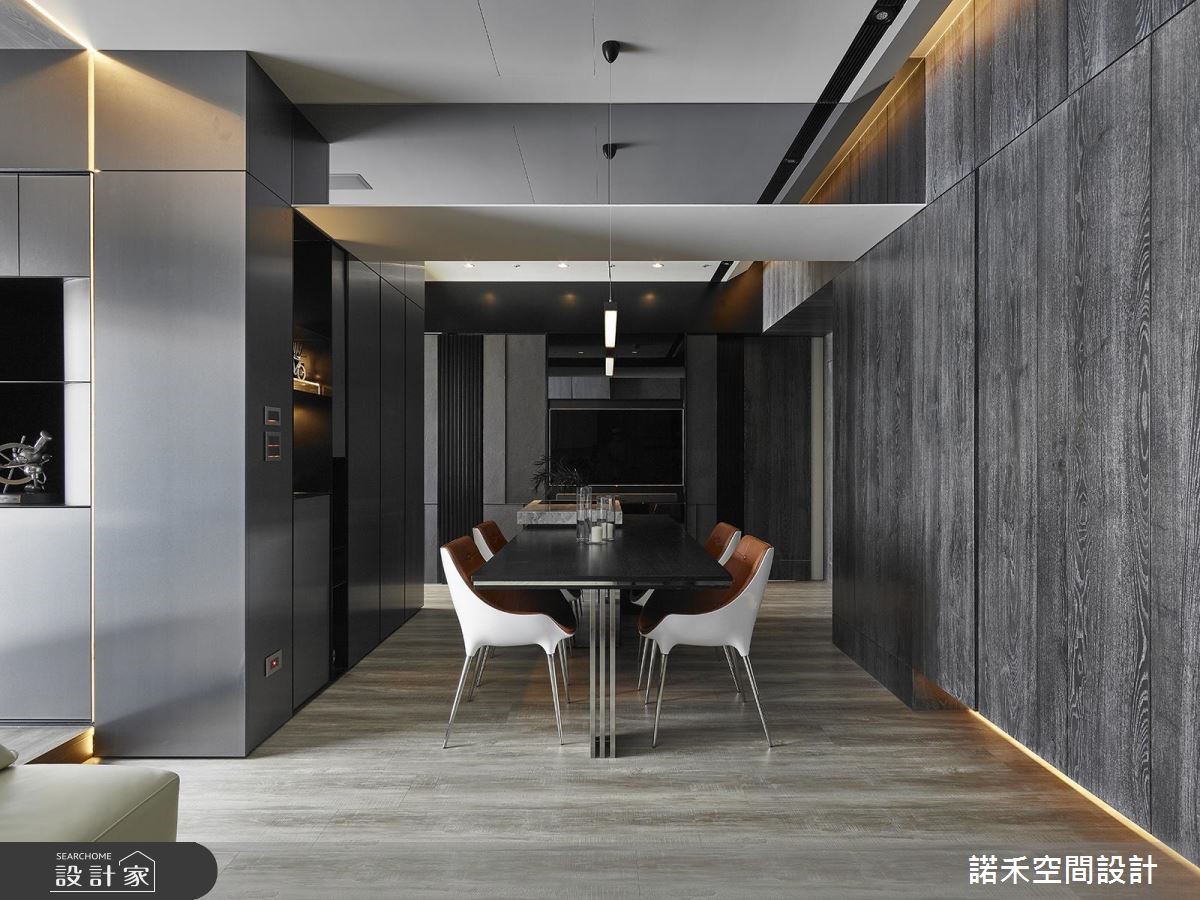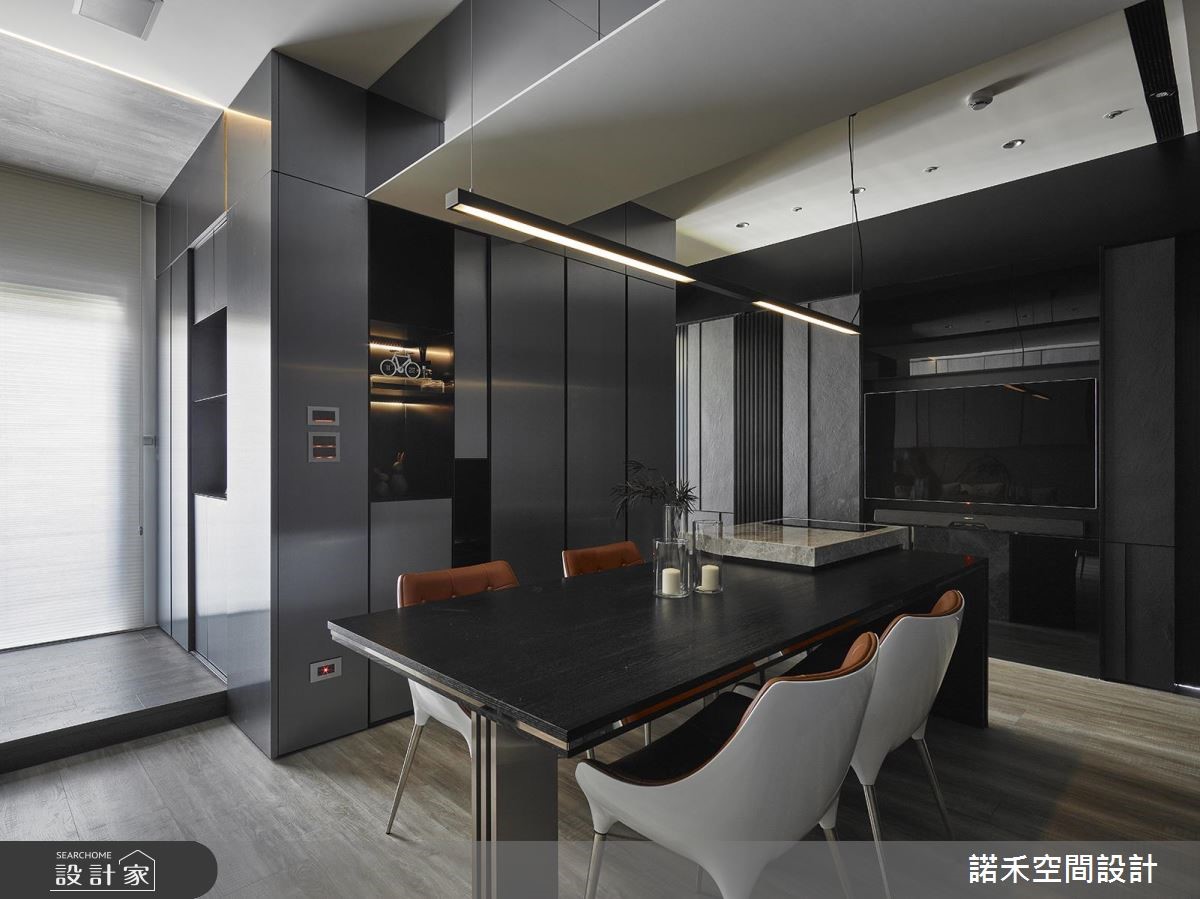 25 坪的現代風居宅,設計師考究細節及材質,採以沉穩深色作為背景、締造低調中帶有奢華的味道,並呈現不同於以往的平面配置,在有限空間中,做出最貼近一家三口需求的住宅場景,快跟著小編一起來看看吧! 設計師突破常見的平面配置,犧牲一道客廳主牆,塑造開放的動線格局,將生活重心回歸家人之間的互動,同時規劃餐桌結合中島,讓此空間兼具用餐與孩子的寫作業書桌,而客廳沙發則成為家人放鬆聊天的去處;另考量到屋主所需櫃量甚多,但不希望妨礙空間感,於是盡可能將立面造型向上延伸,塑造挑高視感,並適時妝點燈光、金屬與鏡面,增加場域的延伸感;材質與色調上,則以深色為主,但穿插不同層次的木皮,以及金銀箔的特殊漆,且透過不銹鋼及鏡面妝點,加深整體的美好層次! 小編的最愛 設計師打造沒有主牆的客廳,破解傳統格局的定義,將視聽功能轉移至餐桌及中島,讓一家人在餐廳的交流時間變得更多了!