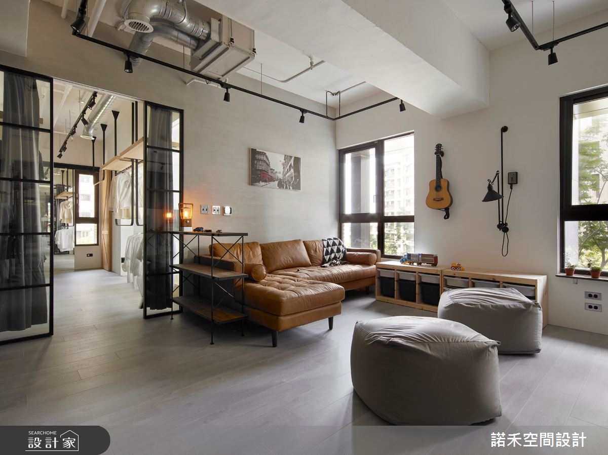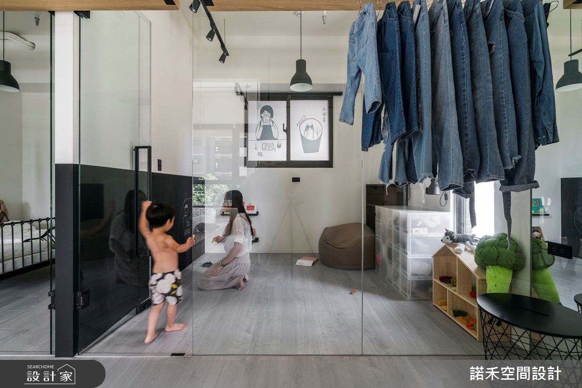 每個家庭都是獨一無二,但是新成屋格局卻總是大同小異。25坪的空間中隔了三房後變得有點擁擠,那何不把實牆變透明,讓光線照進每個空間,三間寢室不僅變得更為明亮,走道從陰暗變光明,把寢室分享出去,成為大人小孩的互動長廊。 簡單對切型式區分公共區域與私領域,為了讓僅僅13坪左右的開放式客廳區在視覺與機能上更為寬敞,L型沙發靠牆擺放,利用空間深度將電視矮牆稍微前移,預留充足的觀賞距離。客廳功能變多元,可以坐在沙發上看電視,躺在懶骨頭上放鬆閱讀,也可以變成孩子的遊戲空間。與牆面貼齊的收納設計能確保動線不受阻,電視矮牆具備雙面收納的機能,配合底端頂天立地的深色收納櫃將公共區域所需要的大量儲物需求整合在一起。為了讓孩子們能不受限制在牆面盡情作畫,設計師在餐廚區的牆面、兩寢室間的隔牆都以黑板漆作為裝潢材料,在形塑風格同時也用簡單的設計創造更適合孩子的生活空間。 磚牆換成玻璃隔間後,三間寢室變得格外寬敞明亮,捨棄常見的系統衣櫃,改以懸吊式掛衣架並移到隔牆外側,不僅能讓寢室更完整地被利用,一排排吊掛在玻璃隔牆外側的衣物變成空間最獨特的設計,也讓挑選衣物變成家人之間的互動話題。吊掛式的衣櫃設計同時解決玻璃隔間的隱私問題,設計師也在內側做了拉簾,讓空間能隨時提升隱私性。 小編的最愛 不動格局只是將隔間換成玻璃而已,寢居空間竟然變得像是大人小孩都喜愛的遊戲室一樣充滿童趣;透過隔間優化光線與視覺,打破常見的寢室設計,讓家長即便在寢室休息視線也可以看到孩子,把私人寢室與家人分享,用設計讓無私的愛瀰漫於居家空間。