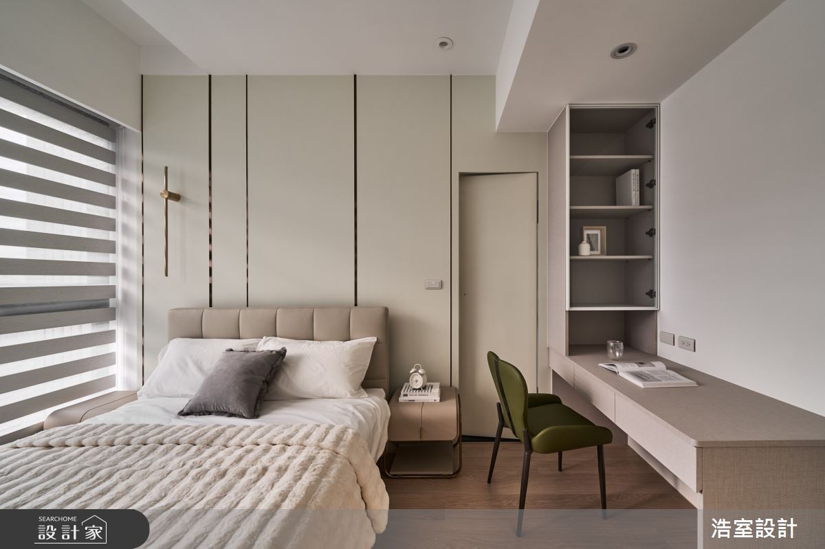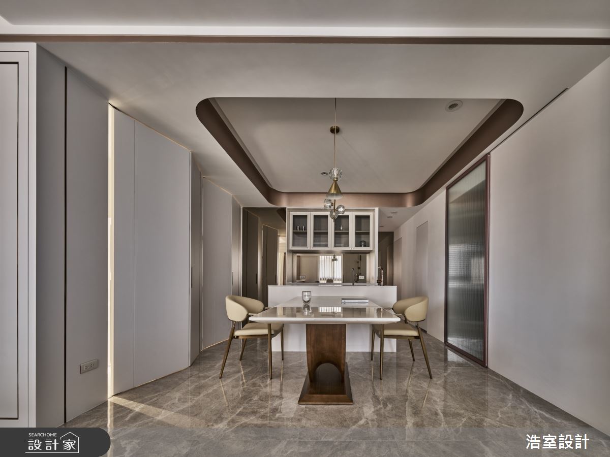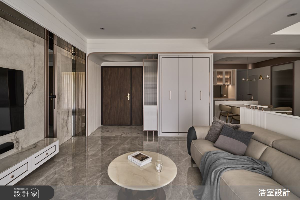 浩室設計以磁磚、薄板磚、木皮、烤漆、乳膠漆、鐵件、玻璃、不鏽鋼飾條、線板的搭配應用,呈現現代輕奢風居家氛圍,將此間31坪、三房、單層、新成屋(5年以下)打造成舒適愜意的家庭空間,完成2位大人、2位小孩全家人的夢想之居。