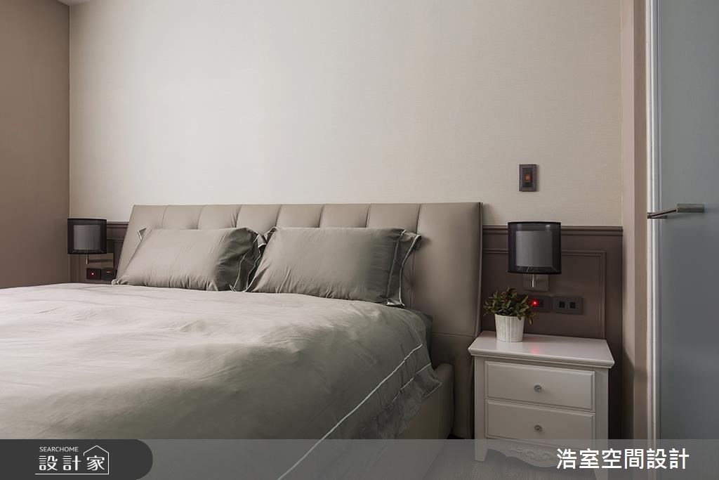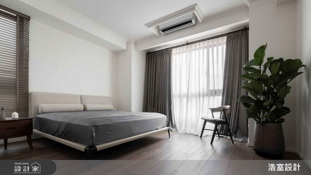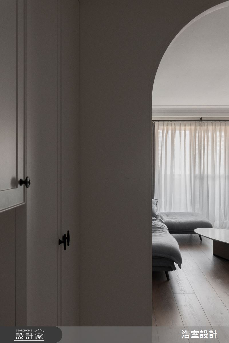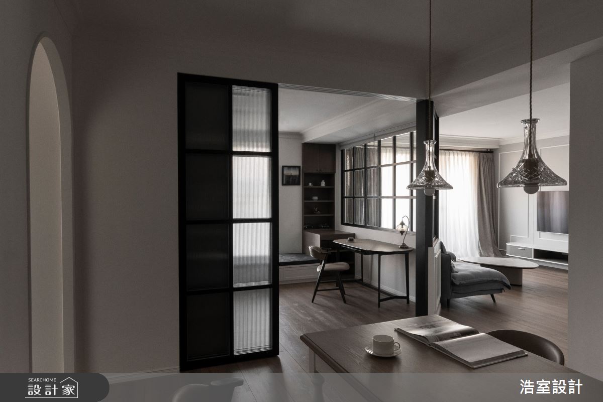浩室設計以乳膠漆、超耐磨木地板、木作貼皮、系統板材、磁磚、玻璃的搭配應用,呈現美式風居家氛圍,將此間45坪、四房、單層、新成屋(5年以下)打造成舒適愜意的家庭空間,完成2位大人、1位長輩全家人的夢想之居。