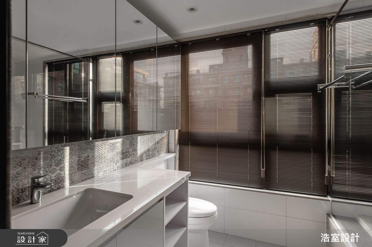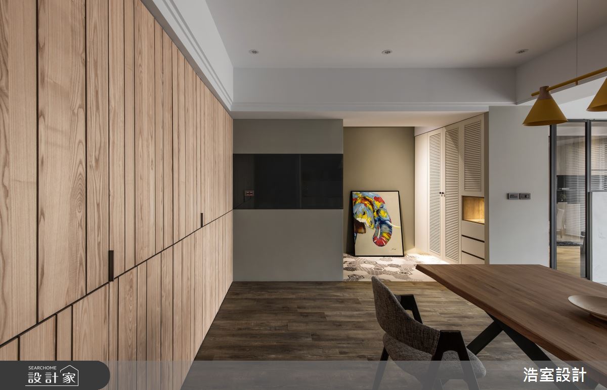 浩室設計以磁磚、塗料、木皮、油漆、系統櫃、木地板的搭配應用,呈現混搭風居家氛圍,將此間57坪、四房、單層、新成屋(5年以下)打造成舒適愜意的家庭空間,完成全家人的夢想之居。