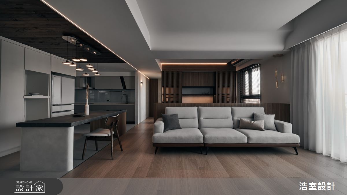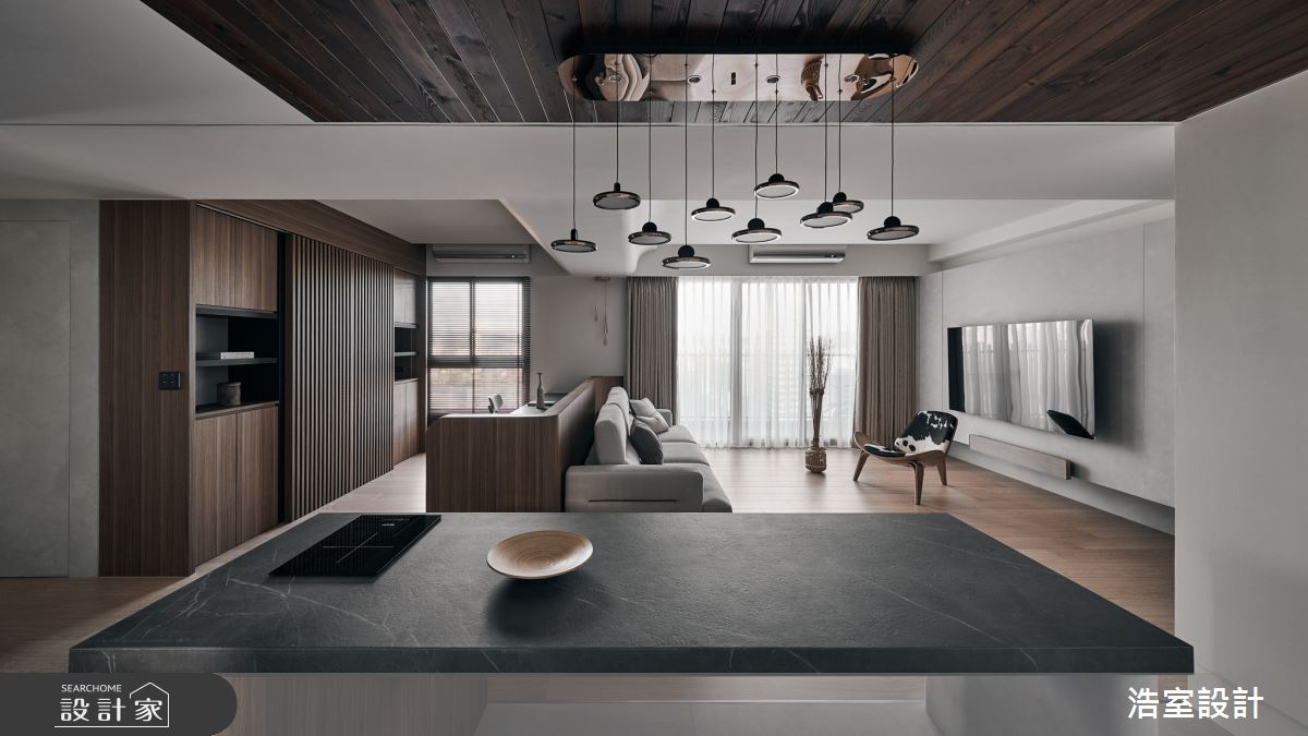 浩室設計以超耐磨木地板、義大利特殊漆、環保噴漆、環保木材、鍍鈦、薄板的搭配應用,呈現現代風居家氛圍,將此間35坪、兩房、單層、新成屋(5年以下)打造成舒適愜意的家庭空間,完成2位大人的夢想之居。