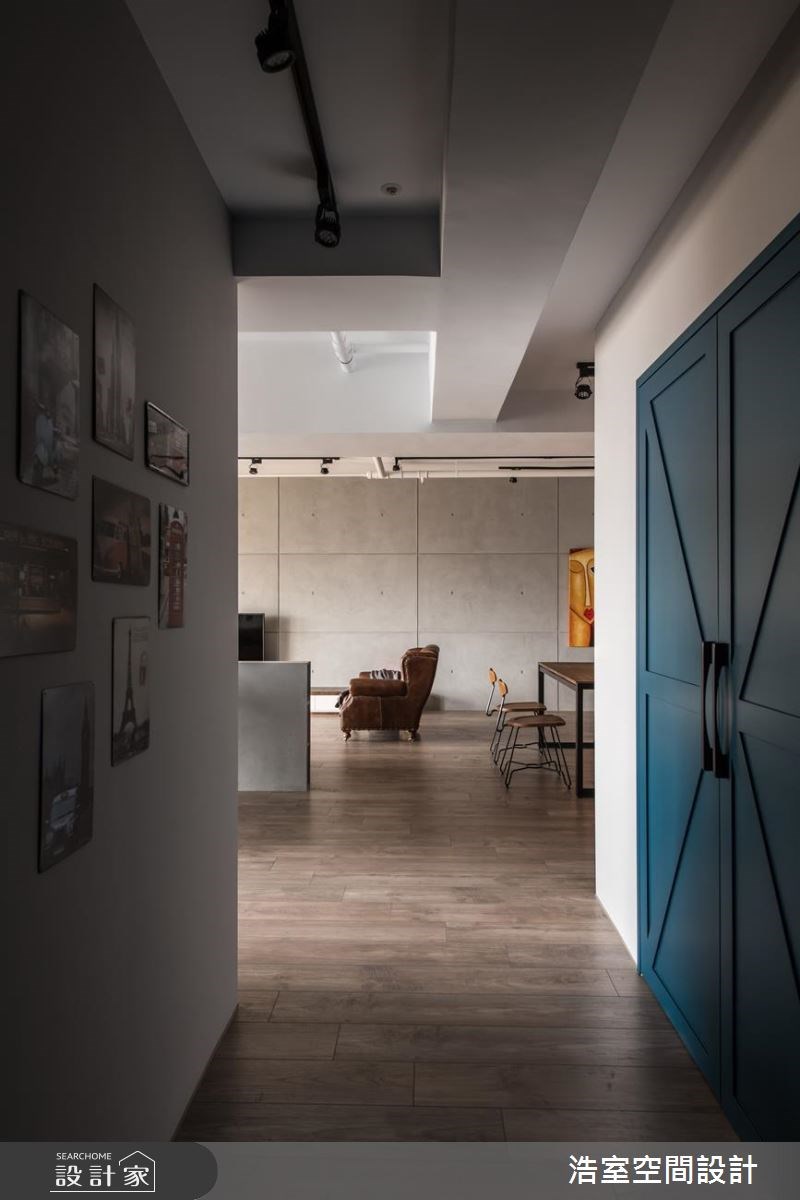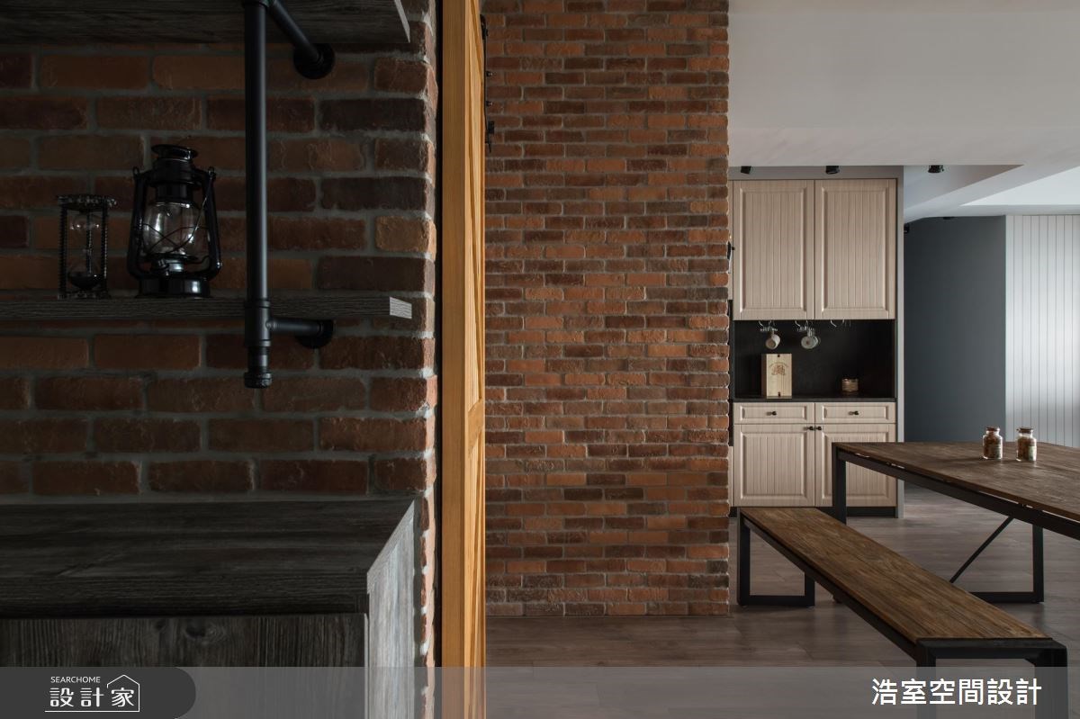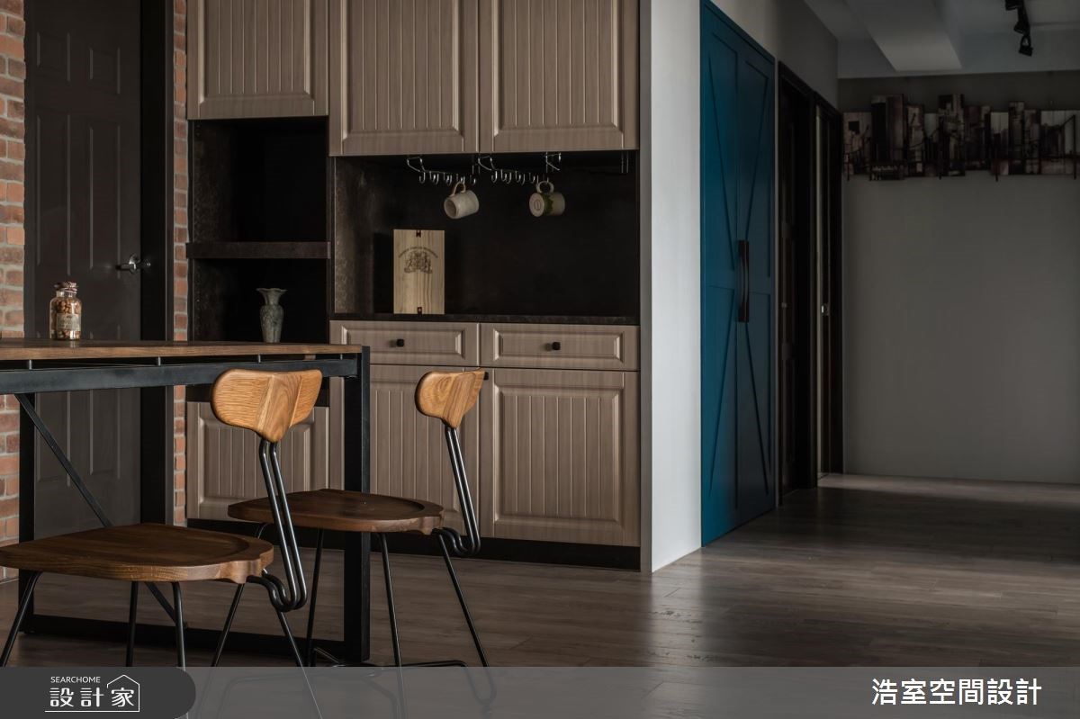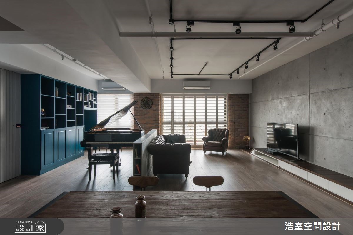 覺得工業風過於厚重冰冷嗎?藉由顏色與材質的搭配,就可以順利平衡閣樓風 Loft 的剛硬質感,進而營造出溫馨獨特的居家氛圍,一起來看看浩室空間設計打造的復古文青工業風住宅! 此間住宅公寓運用許多復古元素作為風格形塑,像是懷舊喇叭、深棕色鉚扣皮革沙發,搭配軌道燈、紅磚牆與清水混凝土般的電視牆,營造簡約而鮮明的工業風格,餐廳的鐵件木質感餐桌、餐椅也呼應著整體空間的視覺主軸。另一方面,在開放式客廳其後便是鋼琴與書架,濃厚的文藝氣息就此開展,收納櫃面上的線板設計與穀倉門也悠然襯托出淡雅的美式鄉村風,其中鋼琴旁的湛藍色收納櫃特別令人眼睛為之一亮,在大地色系的工業風空間裡閃耀出色彩美學,不規則的層板配置,更讓不同尺寸的書籍、家飾與紀念品適得其所。 小編的最愛 喜歡皮革沙發、紅磚牆與穀倉門的搭配組合!讓居家空間頓時有了工業風韻味。