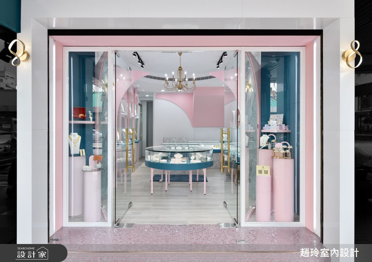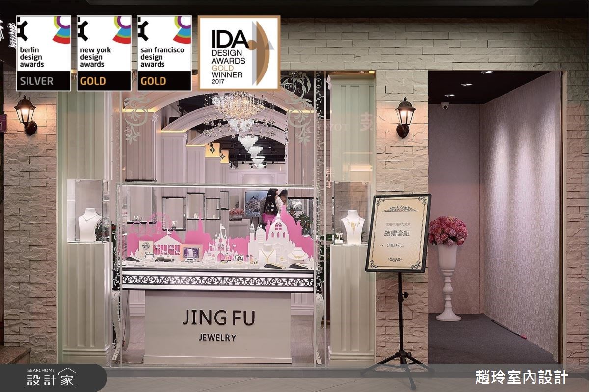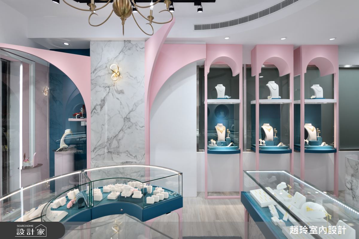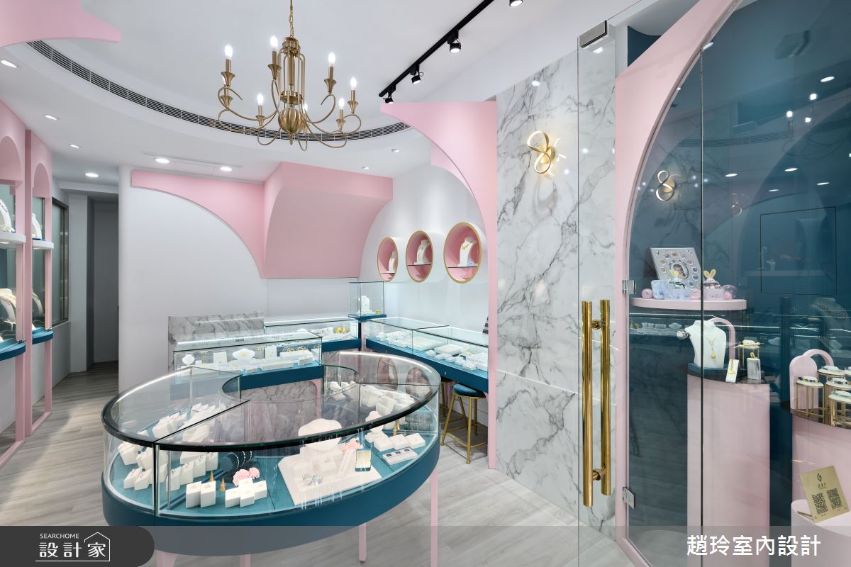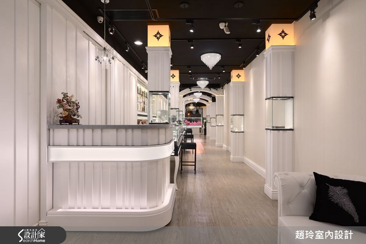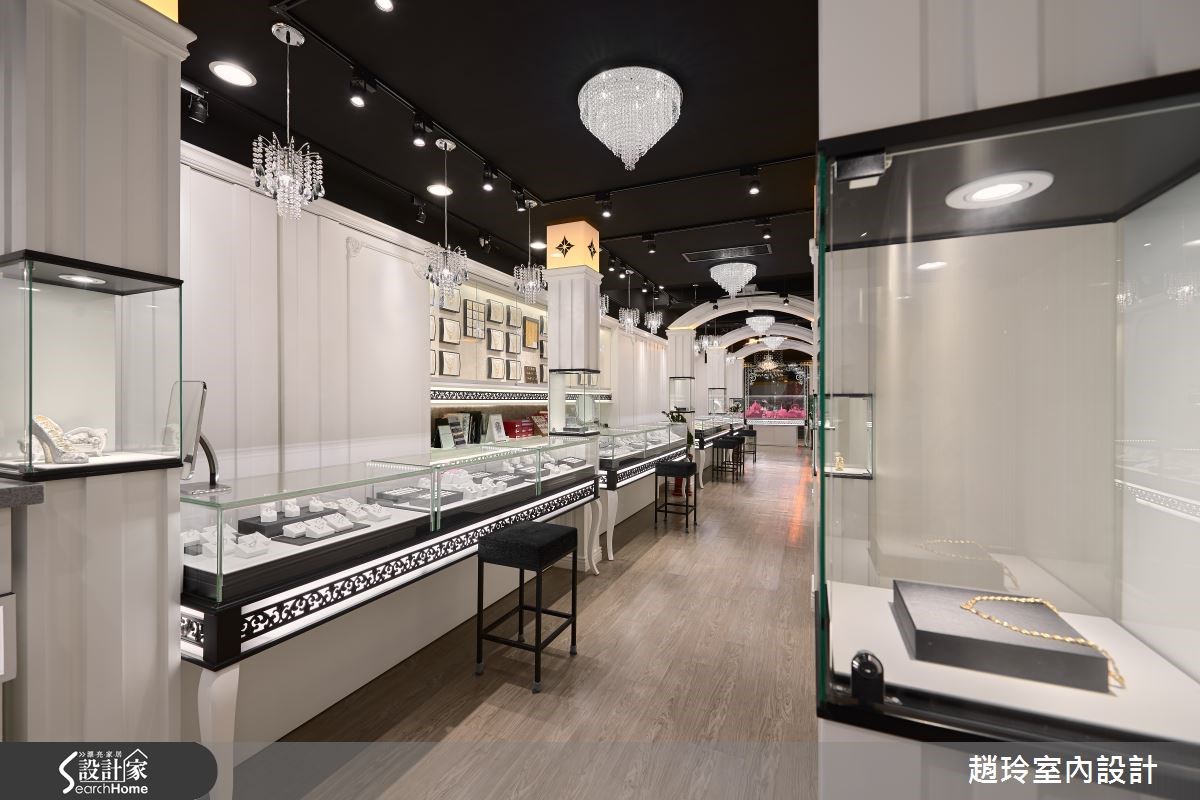 與命定的白馬王子牽著手,步入愛情的神聖禮堂,手指上閃爍璀璨的珠寶戒指,見證你們決定相伴一生幸福承諾。走進 40 坪的珠寶店中,以新古典作為浪漫基調,沿著羅馬式拱廊一步步向內前行,精緻的玻璃展示櫃典藏各式珠寶,讓最美麗的愛情從此延續昇華。 門口以玻璃櫥窗與文化石牆,勾勒夢幻歐式城堡般的第一印象,店內富有線條層次的廊道,引領顧客動線向內遞進,選用純白色系與優雅的古典手工線條,襯托珠寶高貴華美的氣質,羅馬柱體加入收納功能,並以高低錯落的展示空間,打造具設計感的古典藝廊;深邃的黑色天花將空間向上延伸,成為繁麗新古典線條的最佳底襯,對比色調呈現輕盈質感,並適度點綴精美的水晶燈光,讓櫥櫃中的珠寶飾品,格外閃耀動人。 小編的最愛 比一般空間長 3 倍的老屋,設計師將狹長屋型的劣勢轉化為最佳優點,以古典羅馬式拱道作為重點設計,打造彷如王子與公主的浪漫婚禮長廊,成為呈現珠寶商品的絕佳舞台。