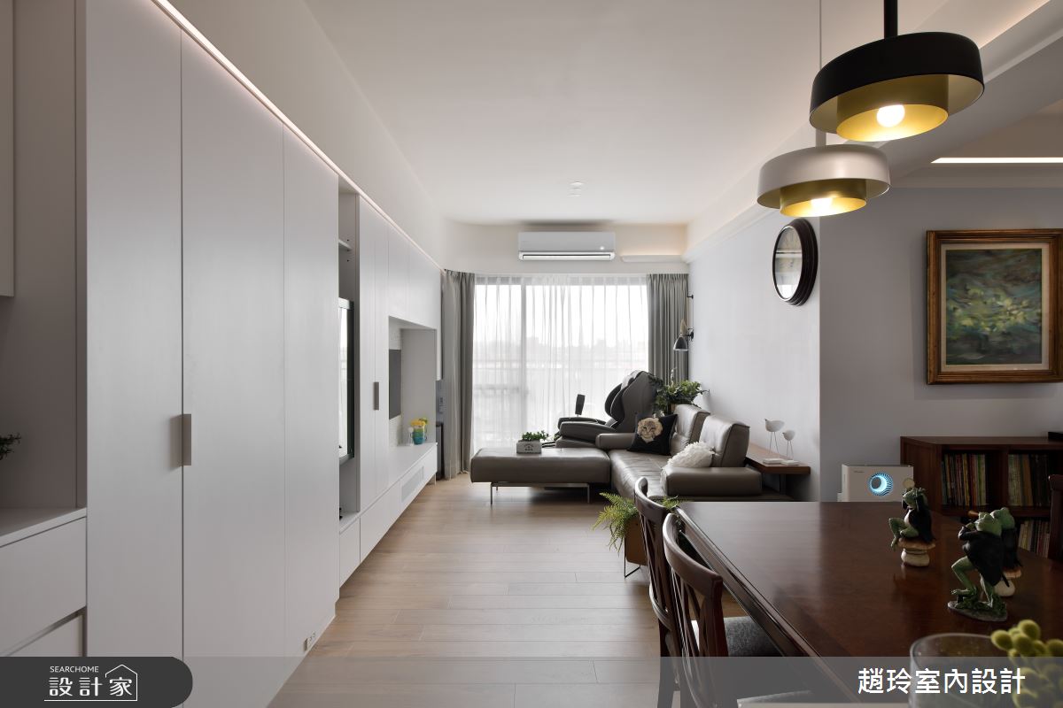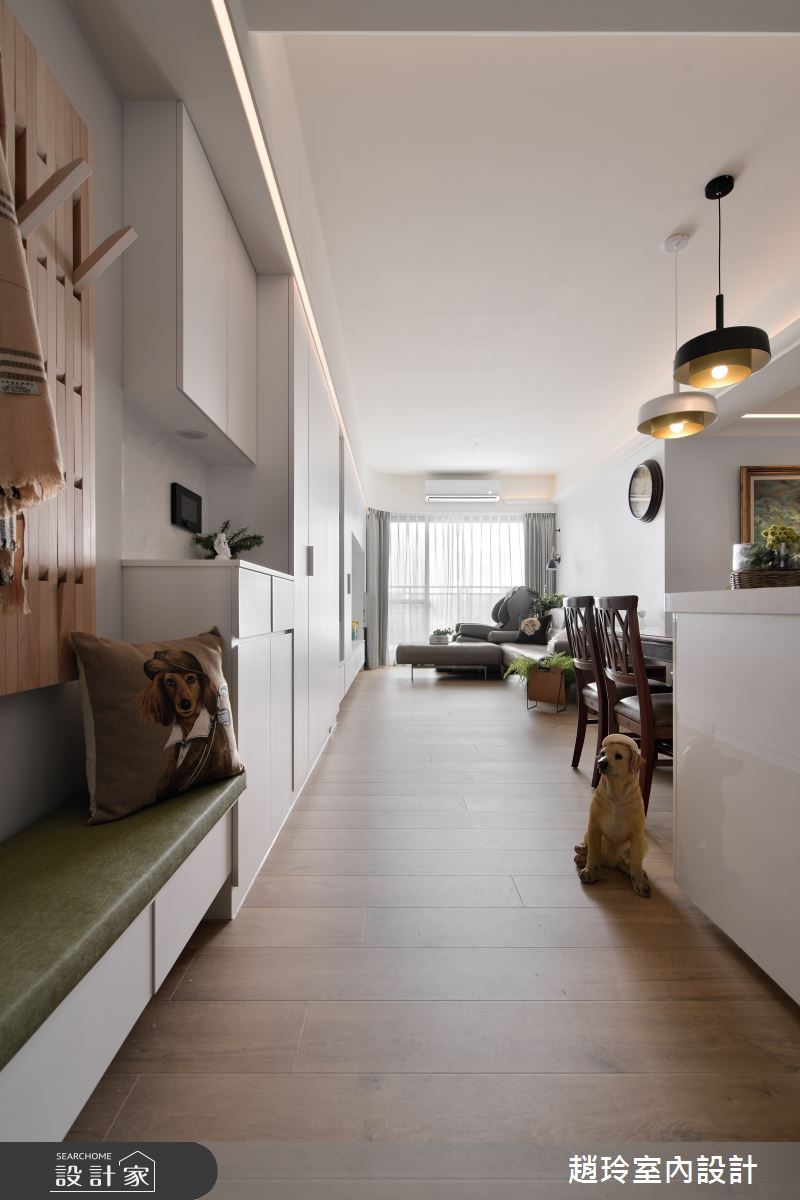 來自趙玲室內設計的28坪簡約風住宅案,屋主一家人共有2位大人、2位小孩,是一間單層新成屋(5年以下)的三房格局,設計師藉由建材以油漆、乳膠漆、水泥漆、超耐磨木地板、烤漆、賽麗石、軌道燈、皮革、繃布、噴漆的搭配應用,實現一家人的理想生活。