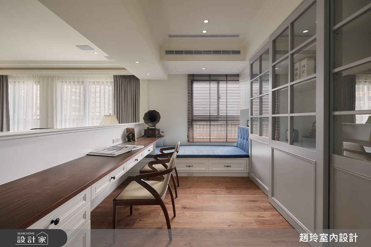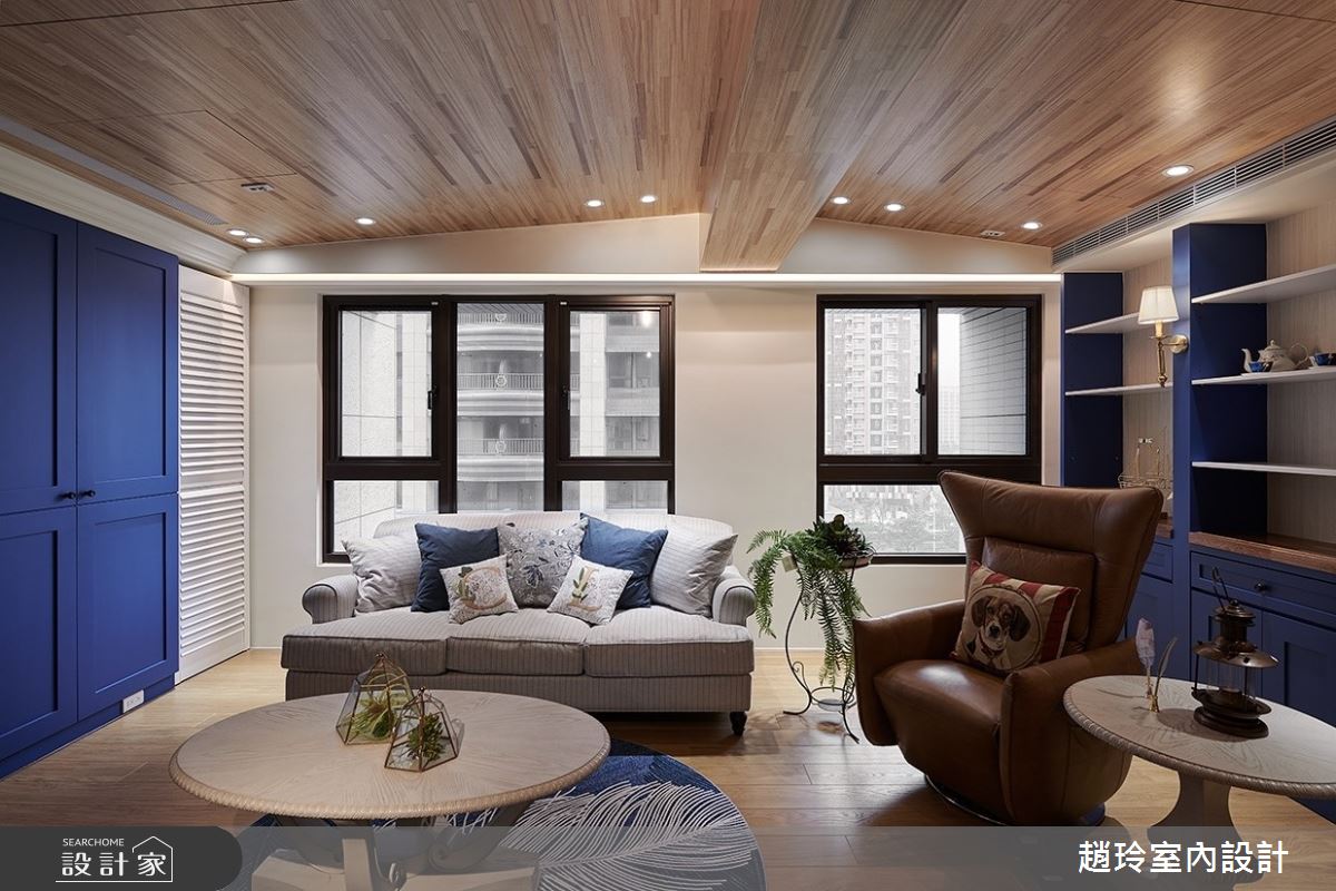 簡單生活,不簡單!喧囂城市之中,謝謝設計師打造出屬於我們的完美小天地!38.5坪美式風設計,以放鬆又沉靜的光影與色彩選配,發揮了屋況優勢,備妥生活所需的收納機能,順暢動線安排,就這樣開啟了我們想要的新生活。 室內空間樑線較低,天花處便融合設計,以隱藏式燈帶及投射燈規劃,豐富空間氛圍,化缺陷為創意巧思;採光佳、風景優的公領域,透過風琴廉調節宜人室內光影,皮質亮黃沙發、土黃色文化石,藍色系貨櫃茶几、帶來柔和而鮮明的對比;人字拼鋪排吹起美式風休閒意味,不自覺擴張視線,視覺到觸覺皆溫和舒適;坐落於公領域中心的餐廳,以圓桌設定強化家的凝聚力,中島吧檯設計增添生活享受,層架收納則活絡轉角空間,變身公領域亮眼端景面! 小編的最愛 格局更動後,屏除隔間型構一間 L 型大書房,滿足屋主兩人閱讀嗜好,兼具引光入室、通風順暢優點!整面開放書牆提供大量典藏擺放位置,一旁隱私感十足的臥、躺兩用床鋪,能隨時轉換為客房,提供家人及親友使用!為讓空間更具流暢性,櫃體連接餐廚區收納賦予雙向開門、雙向應用之特色,兼具隔間機能,方便兩空間使用者收放,賦予滿分機能。