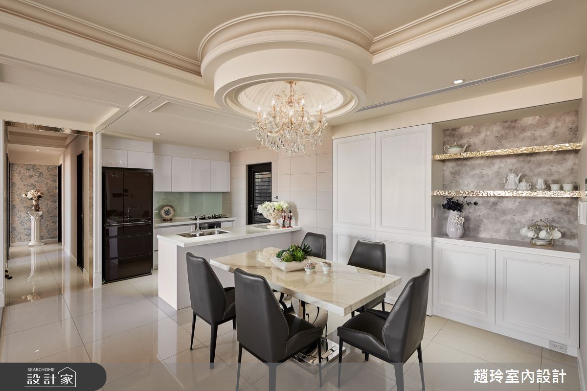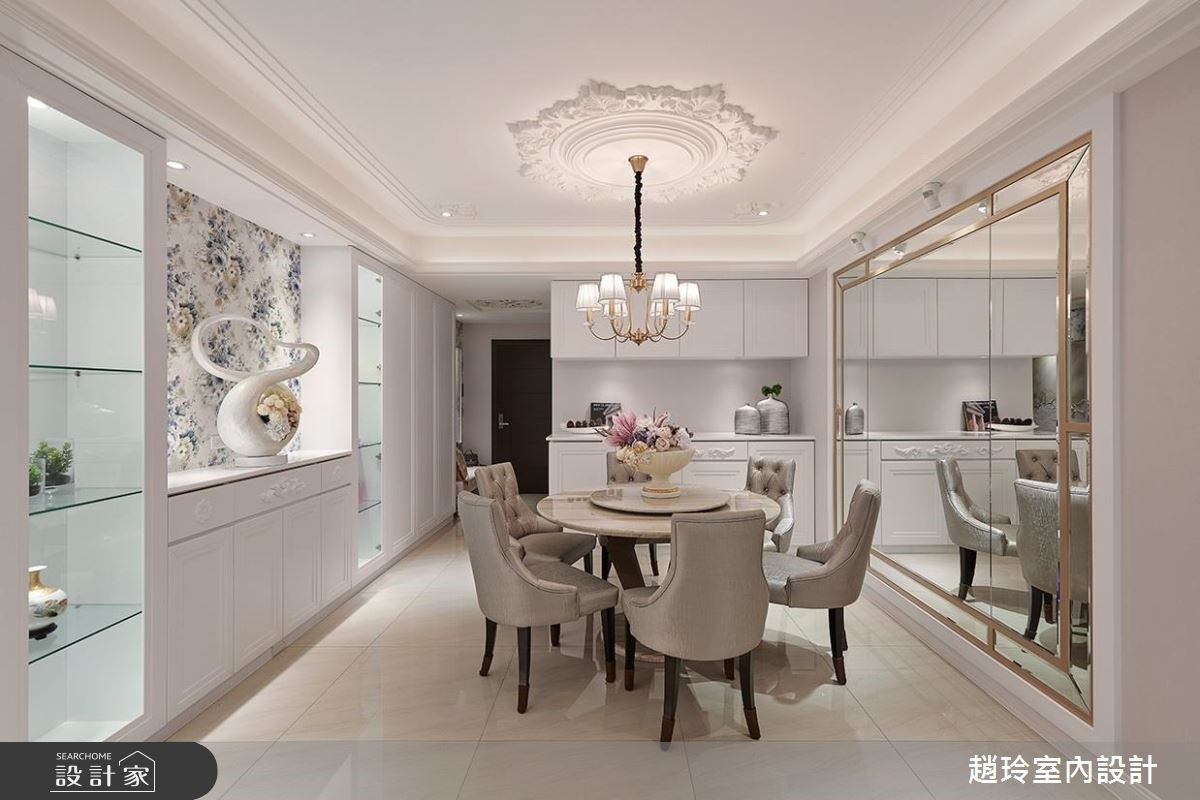 來自趙玲室內設計的60坪新古典住宅案,屋主一家人共有2位大人、2位小孩,是一間單層新成屋(5年以下)的四房格局,設計師藉由建材以油漆、乳膠漆、壁紙、木作貼皮、烤漆、磁磚、木百葉、線板、噴漆的搭配應用,實現一家人的理想生活。