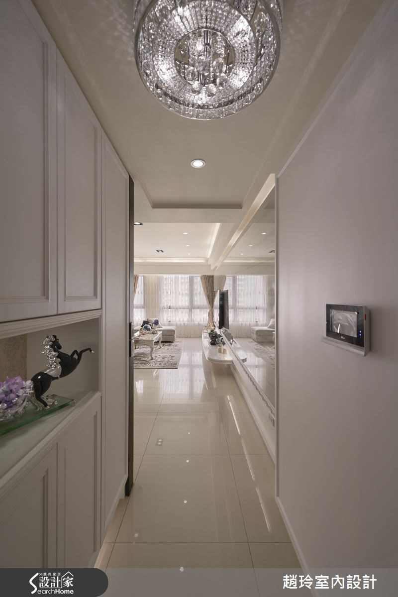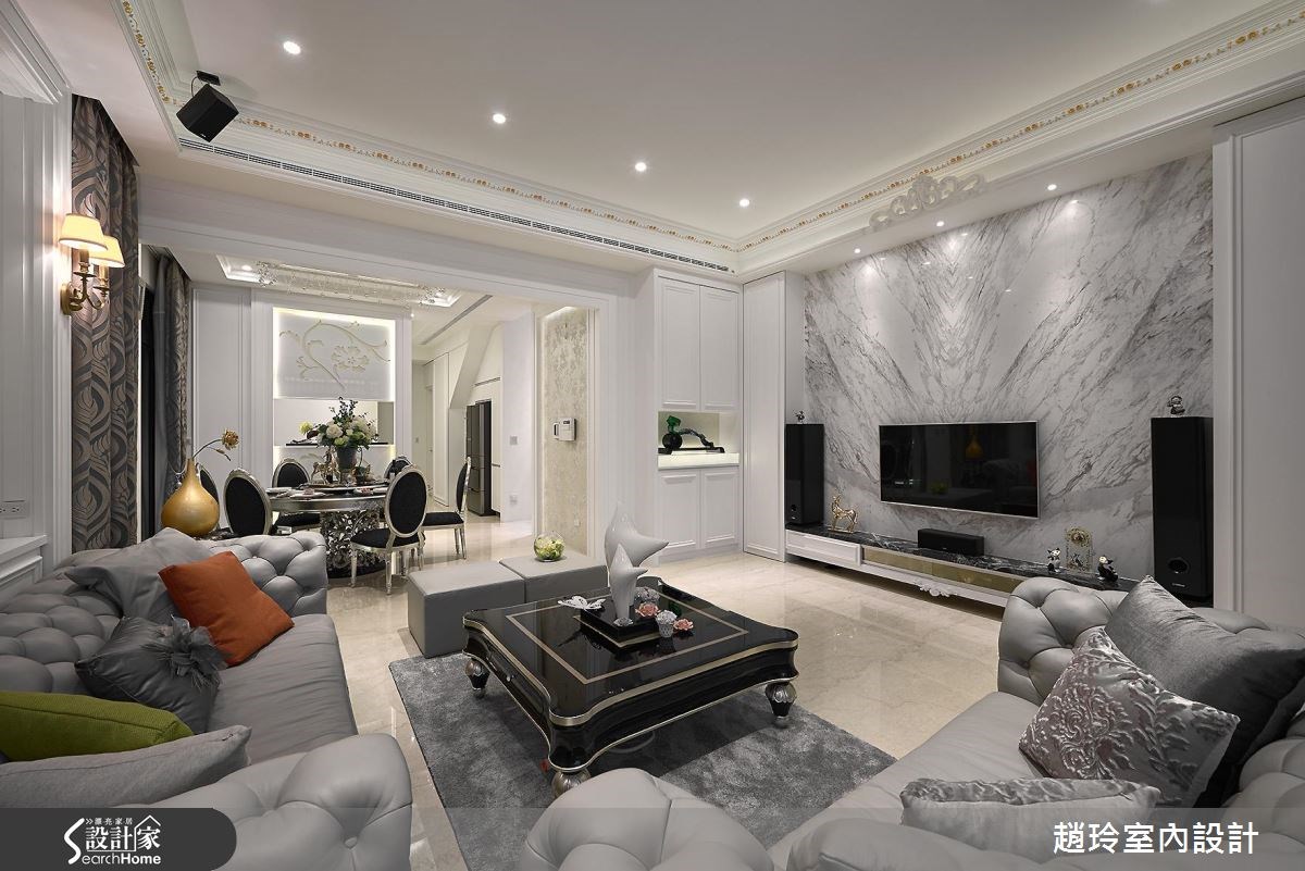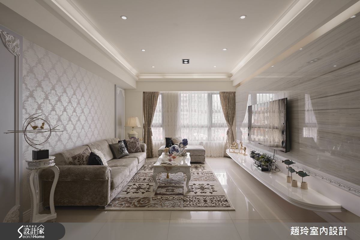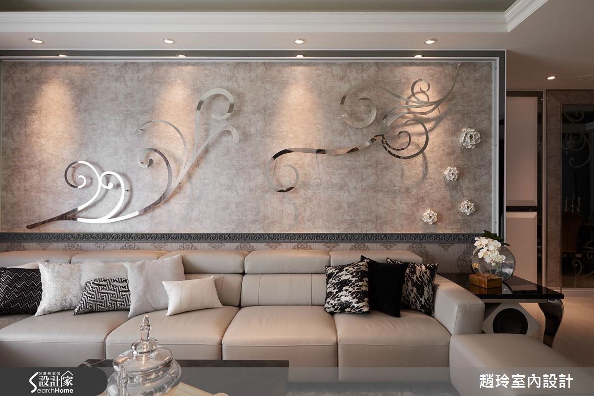 75 坪居家空間,藉由牡丹花語彙的運用、帶入吉祥富貴意象,並搭佐細緻材質演繹,揭開現代新古典的美麗面紗,快跟著小編一起走進來看看吧! 空間選用暖感的輕淺色調鋪底,並注入大量古典雕飾,營造優雅氣質,電視牆採銀狐大理石材鋪陳,透過對花紋理延伸氣勢,一旁連結櫃體做出鏤空雕花,呼應居宅中處處可見的牡丹花語彙,將吉祥意象散佈於各個角落,尤其沙發牆的大面端景更引人注目,運用鐵件雷射雕刻搭配四朵立體花卉,搭襯細膩的框景圍塑,勾勒專屬且獨到的美學表情;餐廳利用深色鏡面鋪敘牆面,搭佐香檳色調妝點,再以一盞古典燈飾凝聚視覺焦點,創造不凡的用餐場域;臥房則揉入銀色、金色等緞面質地,創造亮麗的床頭表情,同時加入金屬與鏡面材質呼應,詮釋高雅的生活情境! 小編的最愛 由於屋主的鞋子數量可觀,設計師在玄關處做出大容量鞋櫃空間,除了將機能俐落整合於立面,更透過雕花、立體圖飾等型構亮點,絲毫不見量體的突兀存在,兼具性能與美觀!