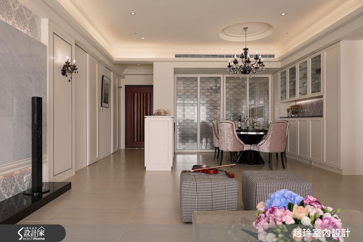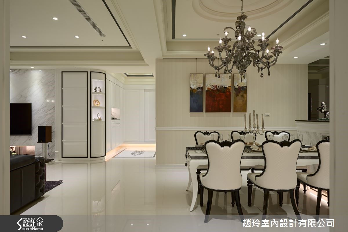 充滿貴氣、優雅之感的新古典裝潢,常讓人一踏入便感受到其強烈的特質與氛圍,彷彿有種同時置身 18 世紀與 21 世紀的交錯感。本案位於桃園市,100 坪的空間內以全白為空間主色,原汁原味地呈現出新古典的態度。 自玄關進入即可感受到屋內一片明亮的淨白感,局部雕飾、華麗家飾品與壁紙的選用變化,讓人立刻感受到新古典的魅力;公共領域採開放式規劃,多處櫥櫃除具備基本收納外,也提供了陳設之功能,整體表現出寬闊、大器的特色,餐區以長方桌搭配俐落的軍刀腳設計椅,最後把此區重頭戲留給華麗的水晶吊燈,使高貴氣息再次提升。客廳區多選用絨布、緞面與皮質的家飾,加上古典氣息濃厚的燈飾和壁紙,恰巧和冷冽的大理石電視牆取得平衡。另一客廳空間,這沒有過多的裝飾,採取亮色但簡單的陳設,作為屋主另一放鬆小憩的區域。各臥室皆改為溫潤的木地板,比起客廳的強烈氣勢,臥房在整體配置上呈現出蘊藏淡淡古典氣息的舒適感。更衣空間根據使用者的習慣,以機能性為出發,除收納衣物外在層櫃內設有隱藏的熨燙設備,相當便利! 小編最愛 另外規劃的視聽室,其整體色調以簡潔的白色為主,沒有誇張的設計,僅以壁紙與特別的雕刻桌傳遞特色,此區宛如一寧靜空間,除具娛樂休閒功能外,同時亦可作為書房使用。