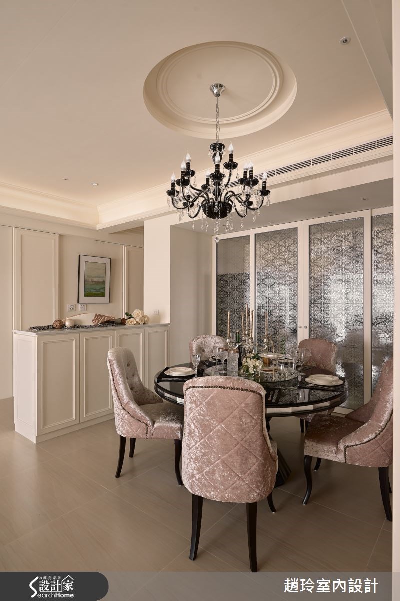 設計師善用專屬新古典平衡對襯、雍容典麗的特性,烘托 90 坪大宅的氣度,宛若一位成熟女子的絕代風華,讓母親與兩位女兒在金質粉黛色調中,同時享有溫婉與華美的生活空間。 將石膏幔與金銀粉佐鐵藝打造的蝴蝶蘭家徽置於玄關牆面,成為家族精神指標;向上繁茂的花體,則象徵家族事業的蒸蒸日上,蘊藏華人以家為中心的的深遠意涵。偌大的長型開放式空間容納了客廳與餐廚空間,電視牆以銀狐大理石打造,隱隱透露出低調的華貴,富有洛可可意象的ㄇ字型沙發與座椅的配置,相當適合宴客,設計師更選擇低檯度單椅,讓優良採光與沿窗麗景得以延攬入室,沙發主牆兩側鏤空雕花板與嵌燈將客廳空間安穩框設其中。 利用古典純白格櫃與走道上方的格狀天花作為客廳進入餐廚區的視覺分割,特製餐吊燈宛如一朵盛開的鈴蘭花,溫柔的籠罩了家人的用餐時光;典麗的圓桌與象徵母女三人的橢圓鏤空雕花板相互呼應,餐椅色調也與沙發延伸,使整體空間色調相當和諧流暢,用餐區域與一字型廚房以推拉門片作為界線,隨心所欲的分派空間需求。臥房空間以典雅不失甜美的粉嫩色澤作為基調,依據不同的身分給予金質亦或浪漫的氛圍,設計師不減巧思,利用門片在開合之間蘊藏整理儀容與收納的機能。純白明亮的閱覽空間放置著線條精緻的桌面與單椅,彷彿走進中世紀城堡中。 小編的最愛 90 坪大宅中,處處可見設計師替母女三人凝聚情感的象徵圖騰,包含以三為單位的鏤空雕花板,或是圓融團結的幾何設計概念,最令人驚艷的當然是玄關象徵家族氣勢的金質蝴蝶蘭,使團結精神永垂不朽。
