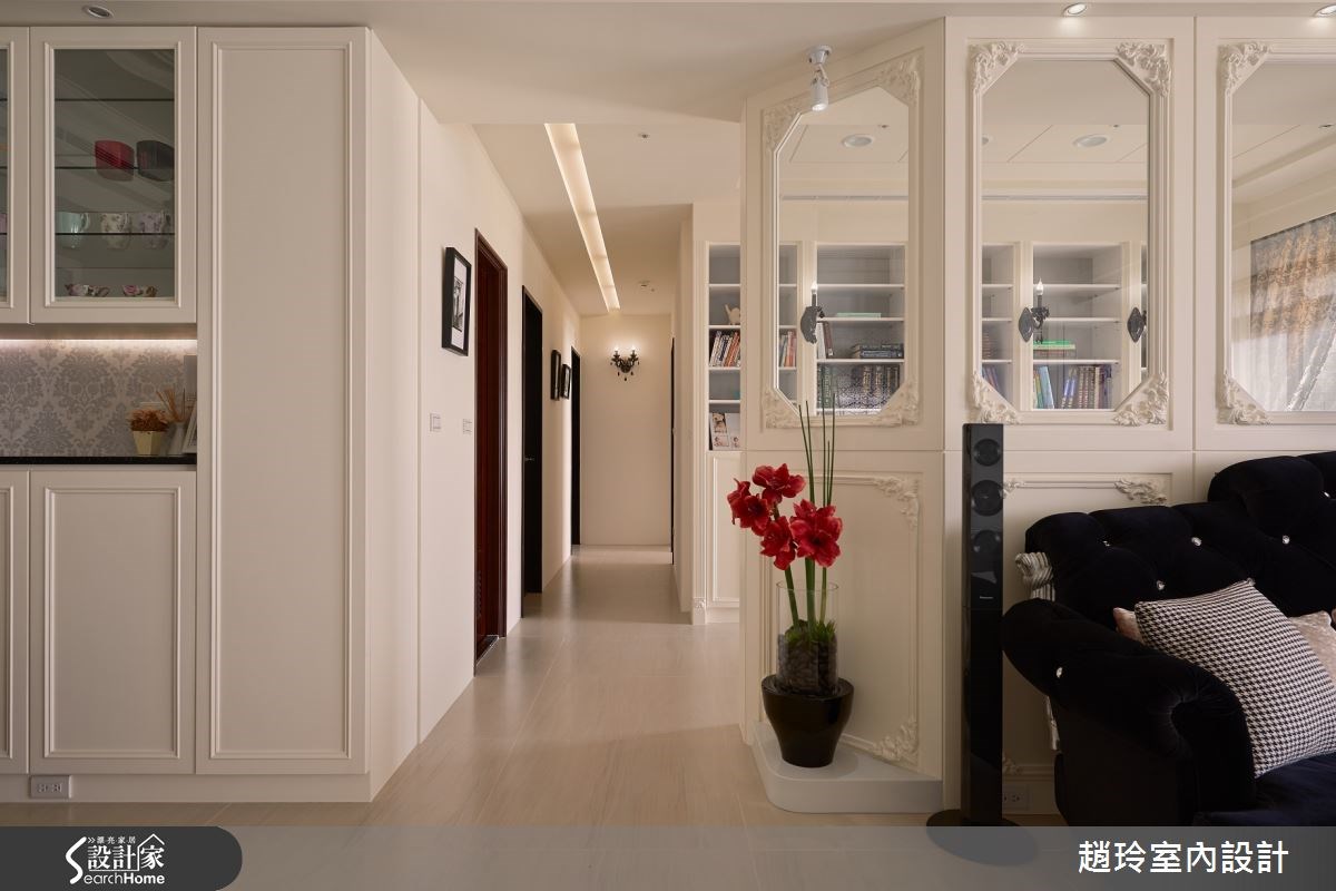 本案位於新竹縣竹北市,40坪4房2廳2衛,在新古典為主軸之下,加入了冷調與現代感材質,引進良好自然採光,中和太過精緻細膩的呈現。利用玄關的活動造形門片做延伸,串聯起大面積大理石銀狐石材電視牆,兩段式的設計,加深了玄關的視覺效果,並且將總開關與弱電箱隱藏在活動門片後,化缺點為優點,以長牆營造出大宅的氣派,而餐廳則懸吊具奢華感的水晶吊燈,營造典雅感;書房刻意不做實牆門片,以清玻璃結合飾花線板作為與客廳的區隔,讓良好採光四處穿透,白色為主的輕盈色彩與材質沒有隔間牆的沉重感,半開放式的格局又與公領域形成一體,有足夠收納的整排書櫃,以羅馬柱與黑壁燈加上極有立體感的線板勾勒,讓人有回到中世紀的錯覺;臥房則將更衣室門片隱於牆面,並透握壁紙窗簾等,透過藕色構成優雅氛圍。