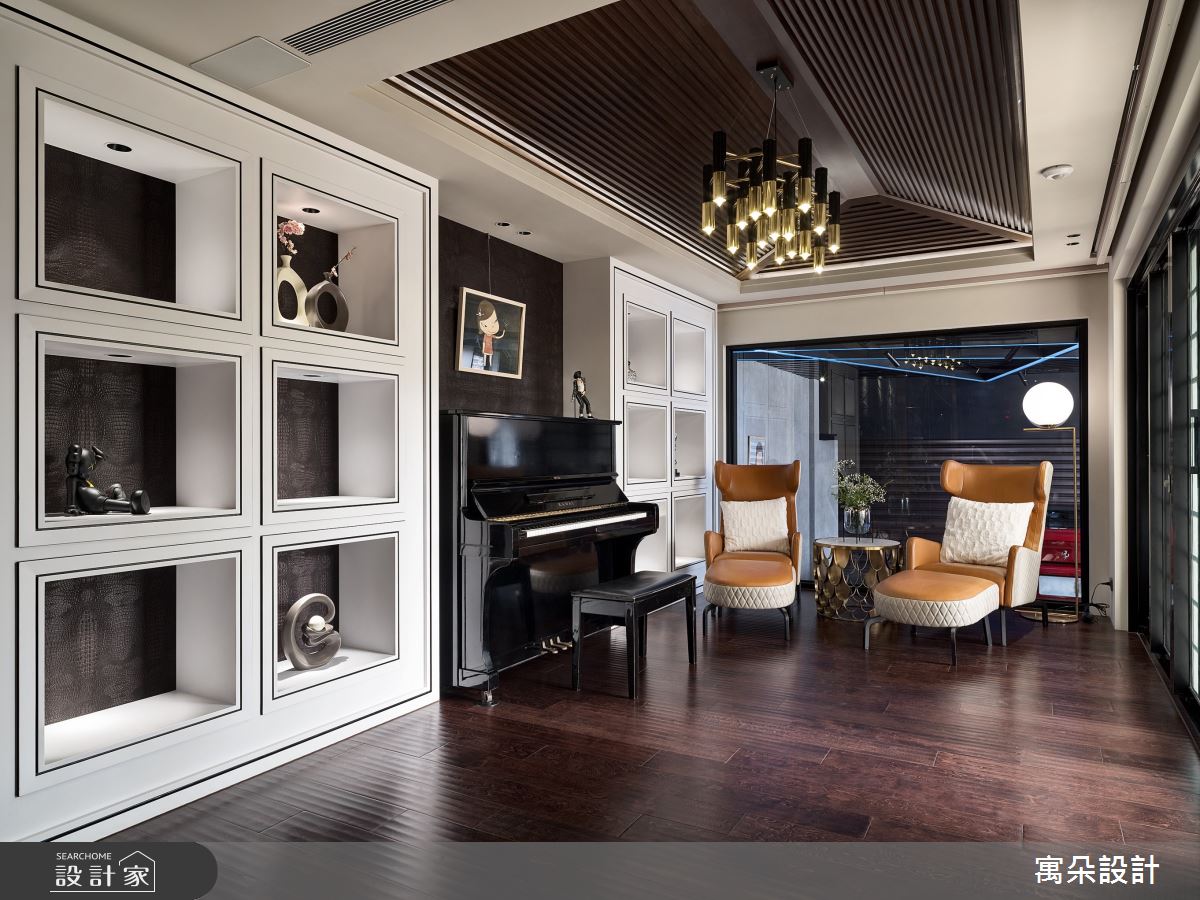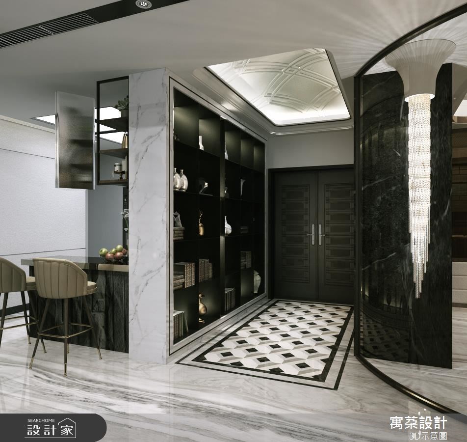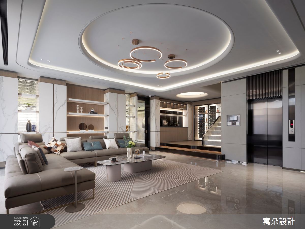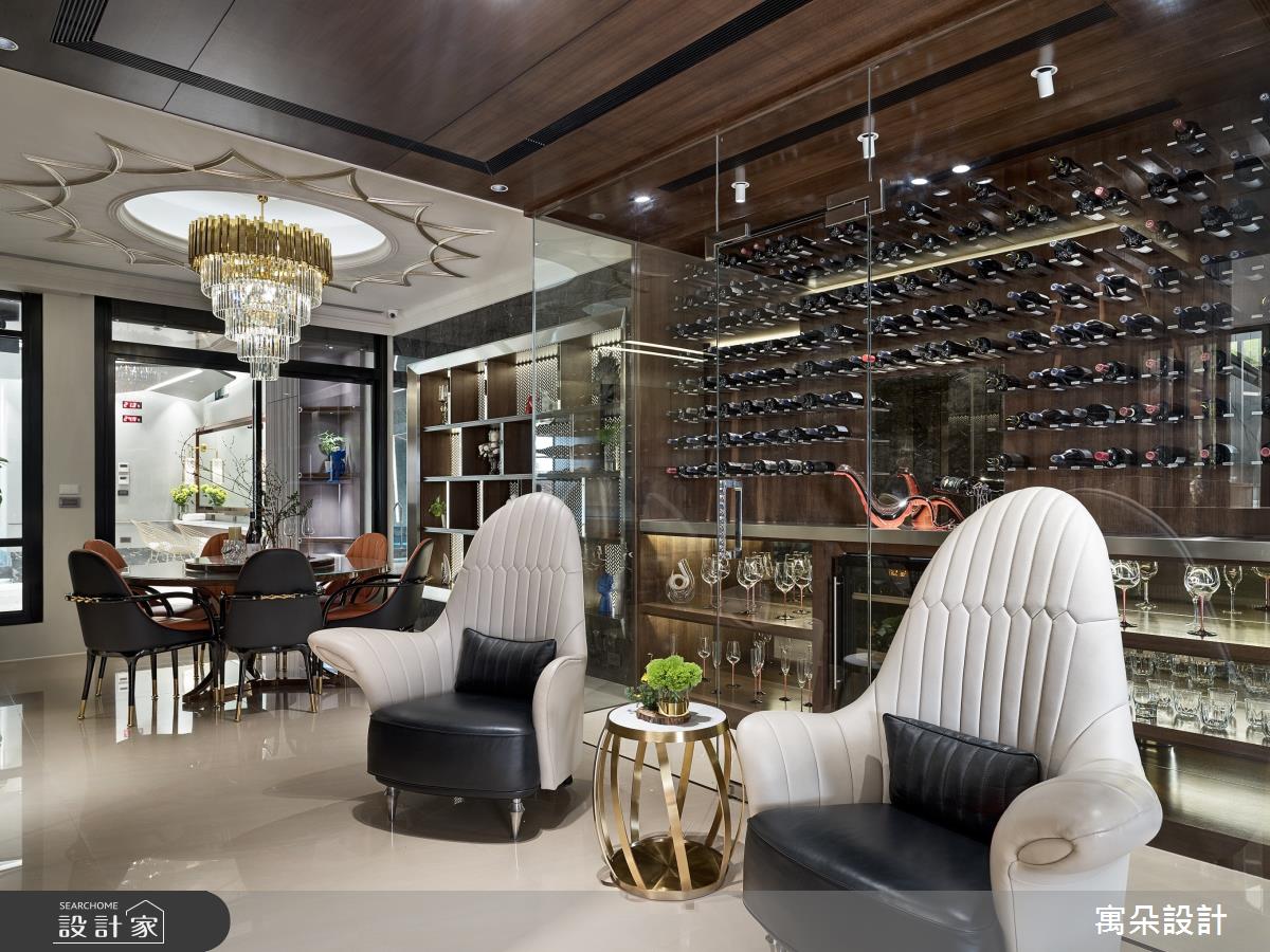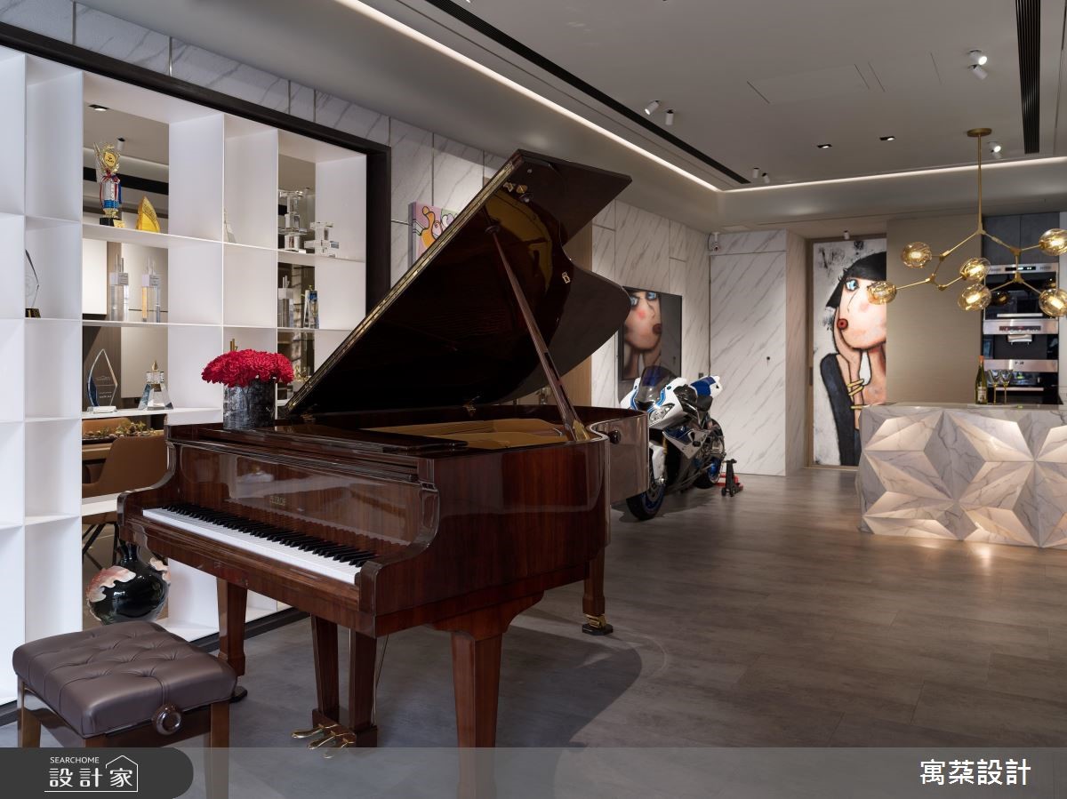 將多年的中古屋整頓翻新後,百坪的空間重新以極致的美學饗宴登場,藉由大理石、玻璃、光帶、義大利特殊漆的材質安排下,調和出蘊含戲劇性與高度藝術的室內氛圍,混搭出摩登非凡的私人豪邸。 義大利特殊漆舖陳的壁面,營造出車庫空間的基底,周圍以光帶線條描繪出立體層次,光影映照在超跑車身,烘托時髦且優雅的身形。客廳天花板的中央拉出深度,整體空間更顯挑高,電視牆以華麗感的大理石鋪陳,立面搭佐LED燈帶,營造出震撼的視覺效果;琴房的門片在設計師與藝術家朋友的提筆下,形塑藝術非凡的迷人景緻;餐廳領域裡,華麗的水晶吊燈、紅色的餐椅擺設,以及精緻金屬鏤空造型的展示背牆,創造出極致的生活體驗;客廳沙發的另一側為琴房,兩廳之間還打造酒窖室,牆壁以鏡面鋪設,單椅與茶几的擺設,彷彿走進風格酒吧裡品嚐酩酊,壁面的酒櫃設計更讓屋主珍藏的佳釀獲得絕佳收納。 小編的最愛 臥室空間的設計更是美輪美奐,多元的風格設計與安排,加上完善的更衣室、衛浴等機能,實現夢想中的家屋風貌。