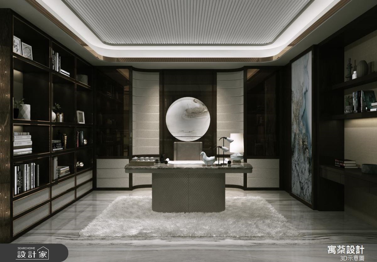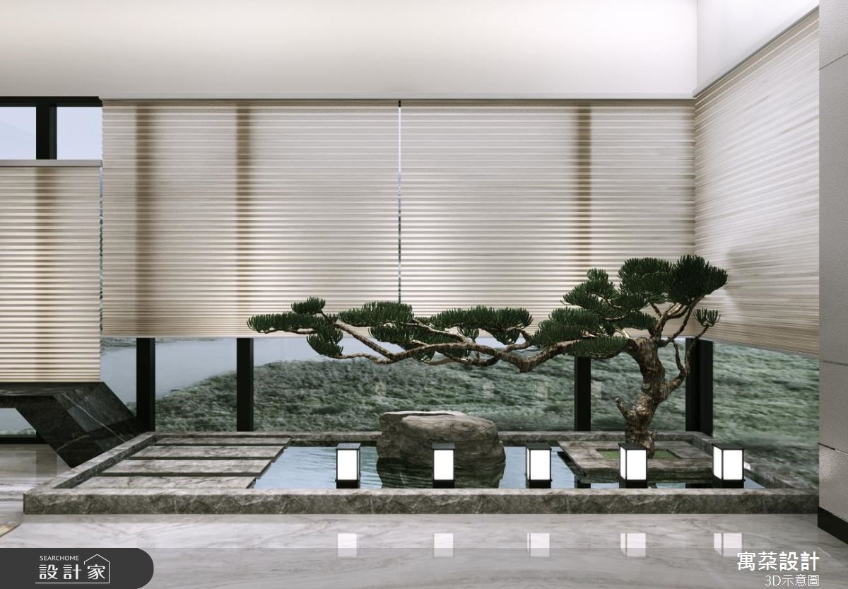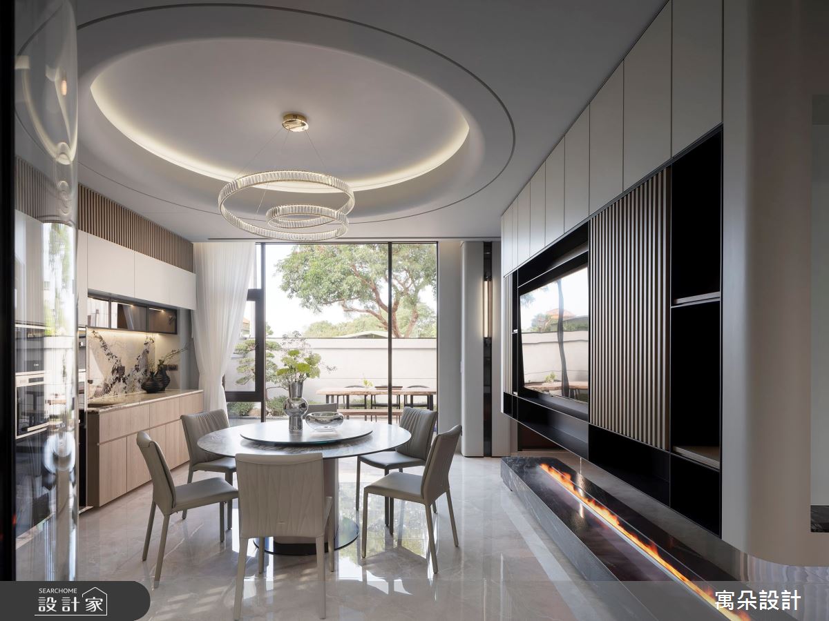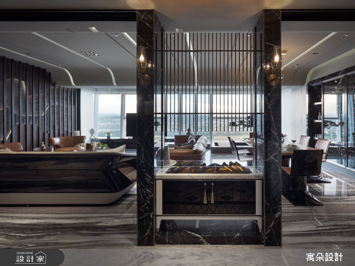 擁有獨特美學品味的屋主,鍾情於中式詩意的美學,也非常喜歡戶外的一片自然風光。設計師藉由非凡的工藝技法,以中國風為核心,透過俐落的線條串連起精彩的設計細節,且呼應戶外的風景雅緻,讓室內外皆景。 入室後的玄關,以弧形線板拉出挑高的天際線,交織出的菱格紋狀線條與地板上大理石材相互輝映;一側以鐵件勾勒出收納造型櫃,擺設屋主的中式藝術品,另一側則以典雅線板描繪出古典味道的鞋櫃。接著利用虛實相兼、具有屏隔功能的設計,界定出內外領域,上方以格柵線調,讓視覺穿透且延伸至窗外綠意,下方則結合壁爐與精緻矮櫃,創造奢華意象。客廳裡,流線型天花板展現一抹韻律感,無刻意打造電視牆,讓電視自然擺設在臨窗處,一旁輔以流水、樹木的造景,呼應戶外風光,坐在沙發上剛好可盡情欣賞,心曠神怡;書房空間,利用皮革材質創造出輕薄、流線型的書桌,背牆的中央嵌入山水意象,調和出古典又不失時尚味道,且具人文的溫潤質感。 小編的最愛 餐桌的主體牆上打造整面紅酒櫃,透過玻璃隔間,背景襯上搶眼的紅色調,宛若精品般的陳列,滿足屋主對美酒佳釀的珍藏。
