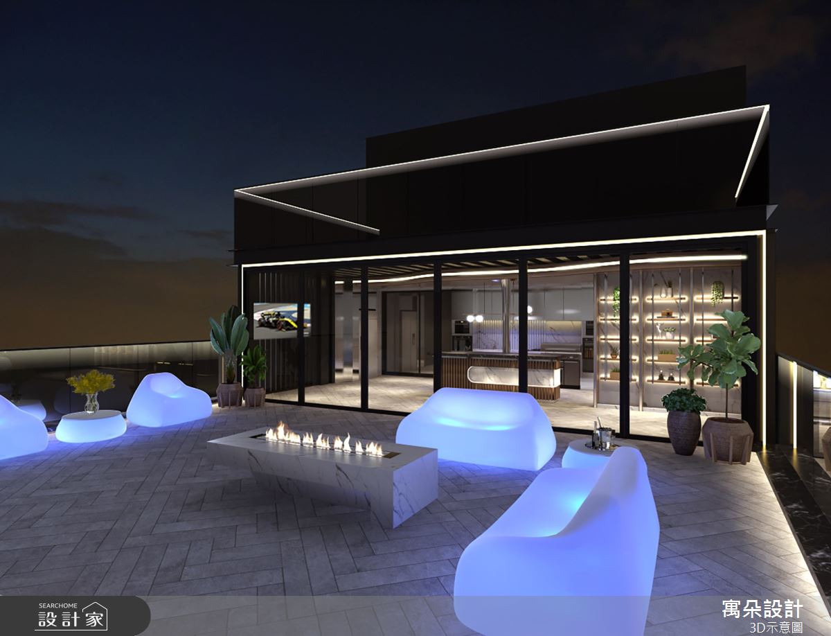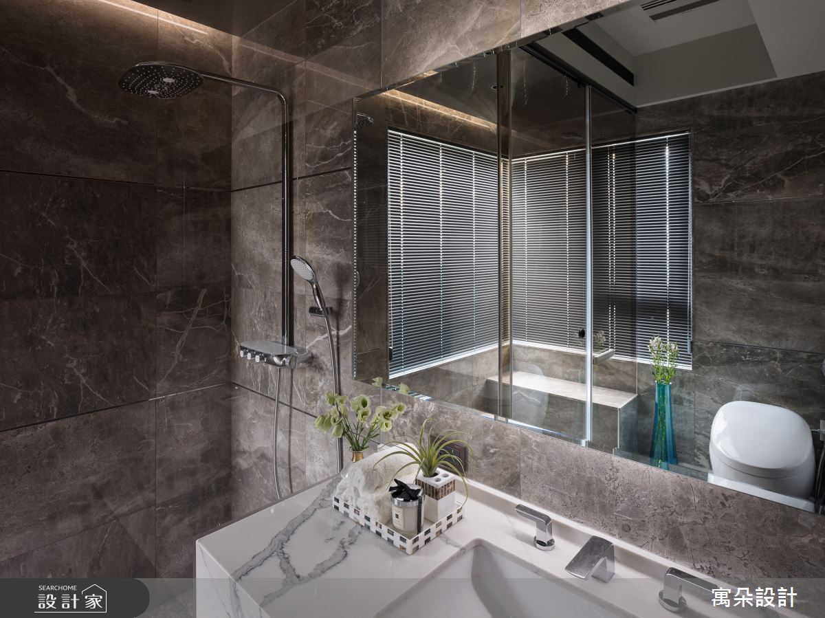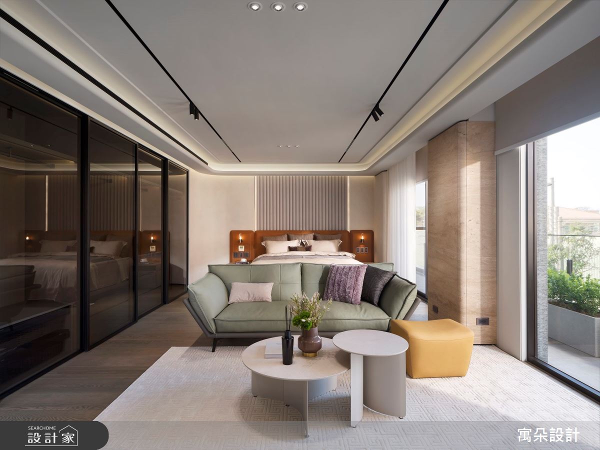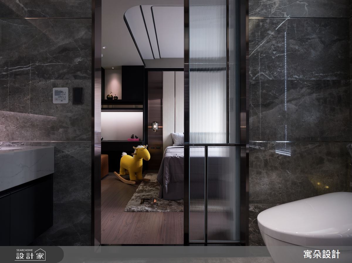 寓朵設計以木地板、鐵件、鍍鈦金屬、木作貼皮、大理石、磁磚、木百葉、石材、繃布、石皮、洞石、特殊塗料、玻璃磚、格柵的搭配應用,呈現現代風居家氛圍,將此間270坪、五房、自地自建、毛胚屋打造成舒適愜意的家庭空間,完成2位大人、2位小孩、1位長輩全家人的夢想之居。