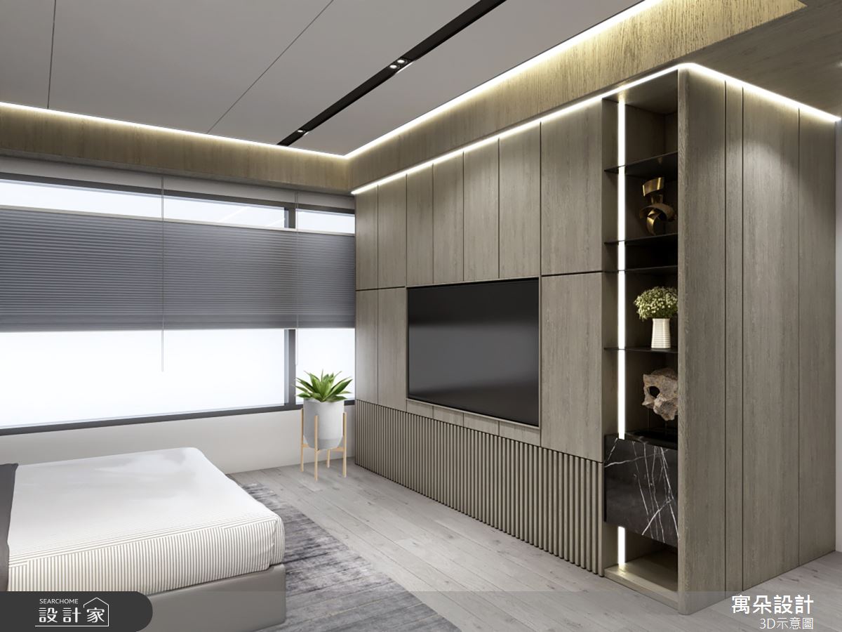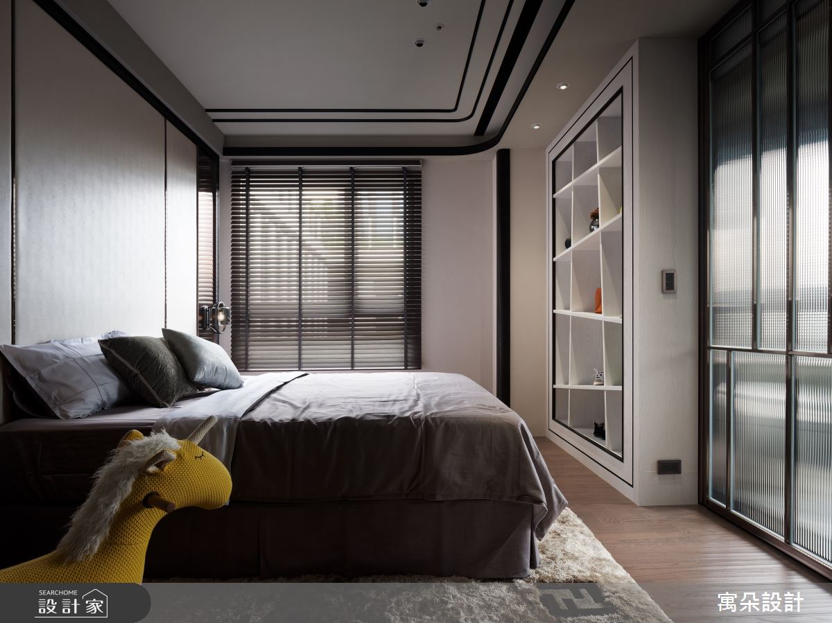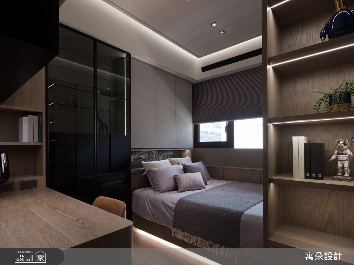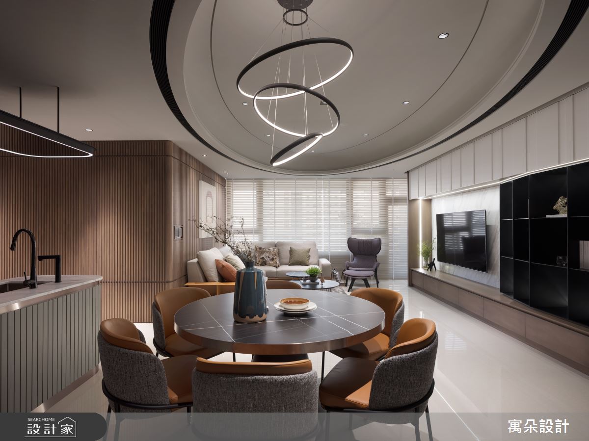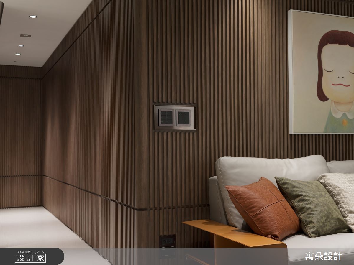 寓朵設計以乳膠漆、超耐磨木地板、不鏽鋼、鐵件、灰鏡、茶玻、鍍鈦金屬、木作貼皮、樂土、木百葉、繃布的搭配應用,呈現混搭風居家氛圍,將此間42坪、四房、單層、新成屋(5年以下)打造成舒適愜意的家庭空間,完成1位大人、2位小孩全家人的夢想之居。