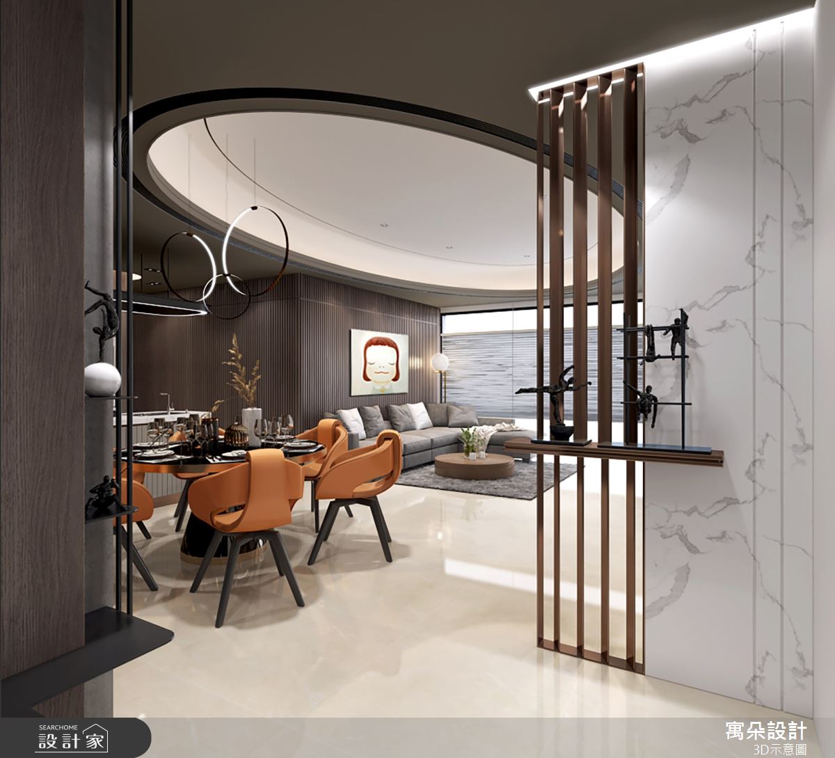 由寓朵設計精心規劃的56坪四房住宅空間,家庭成員一共有1位大人、2位小孩。因應屋主需求,設計師運用新古典作為主軸,搭配木地板、鐵件、鍍鈦金屬、木作貼皮、烤漆、鋼刷木皮、大理石、樂土、皮革,打造全家人的夢想家居。