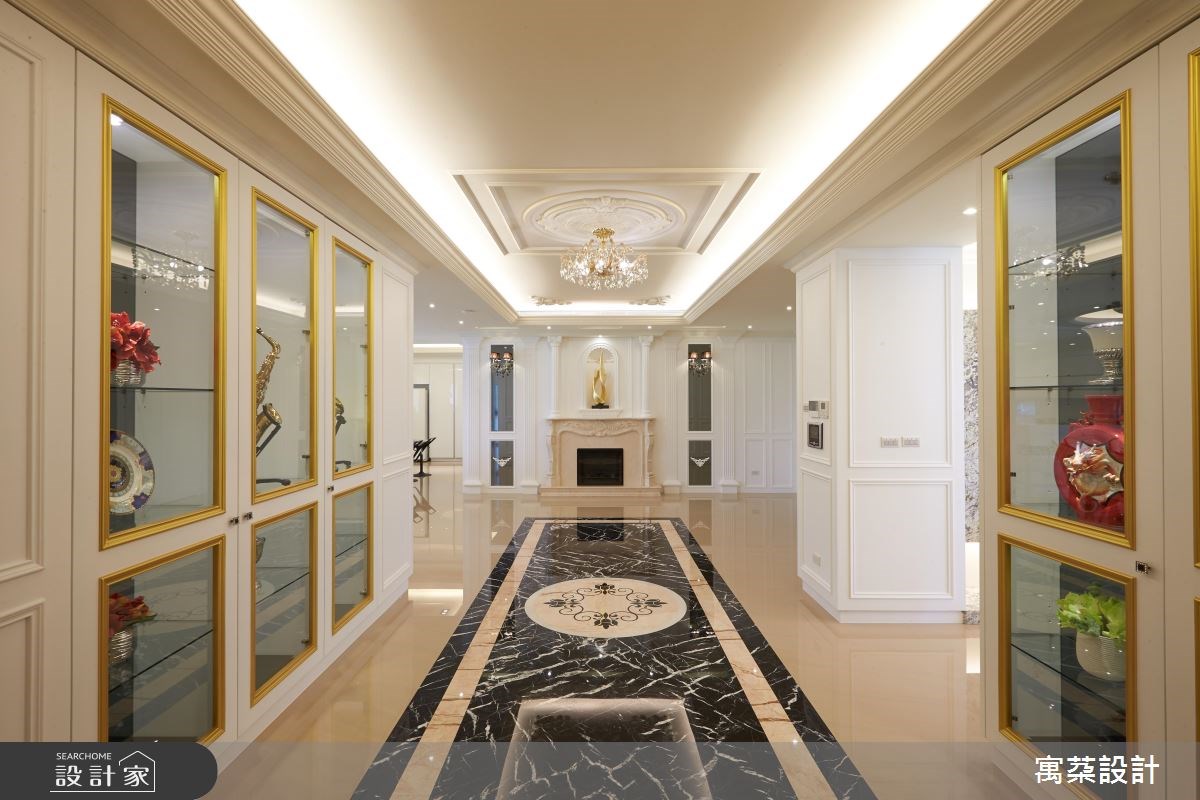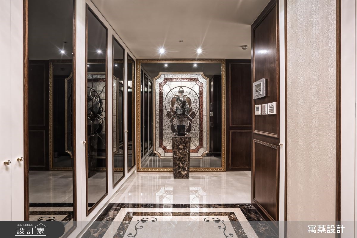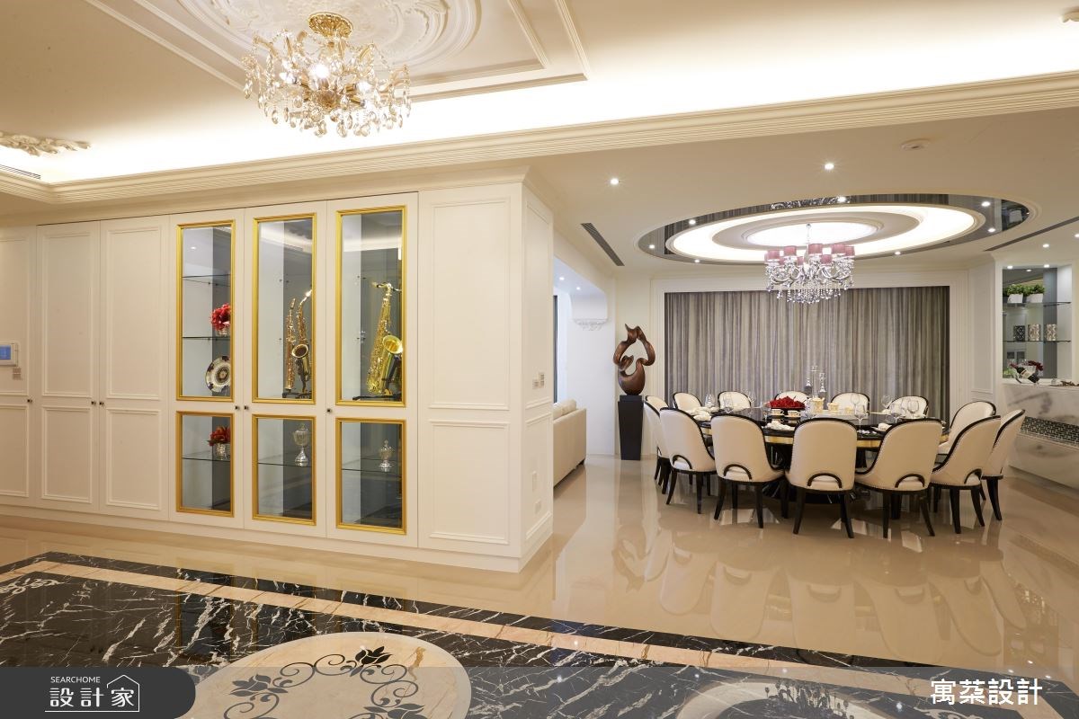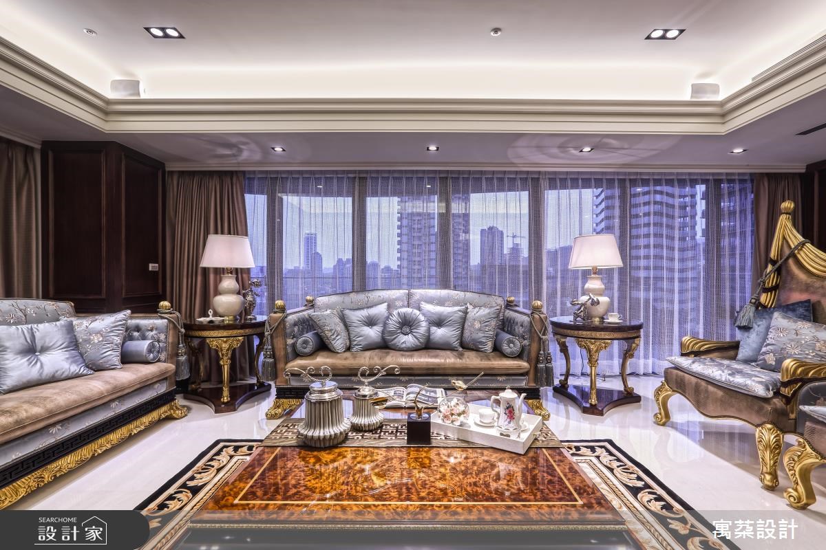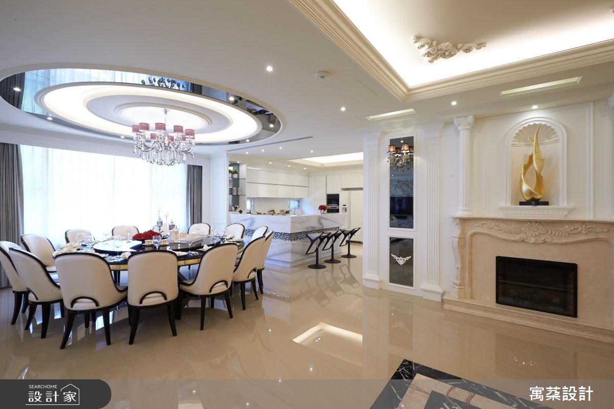 位於淡水的 170 坪氣派豪邸,坐擁紅樹林優美景觀,屋主將其視為度假用的第二屋,期望居宅可引入美景,同時也希望可擁有充裕的宴客空間,於是設計師突破傳統住宅格局,做出符合一家人生活需求的規劃,並以混搭風定調,帶來貴族名流般的住宅氣度,快一起走進這個家看看吧! 玄關處,設計師運用大理石圖騰與手工鑲嵌玻璃,表現開門立見的氣勢感,同時搭佐鏡面材質,但來延伸悠遠的景深想像;延伸入內,則跳脫制式格局,將小餐廳放在玄關後方,形成入門後的第一個迎賓場域;客廳天花板採以線板堆疊修飾,並切割整塊大理石做出仿壁爐設計,營造宛如國外大宅的氣派感,沙發軟件則選用國外進口家具,展示出雍容的宮廷氣息,電視立面兩側結合了展示櫃體,形成客、餐廳之間的完好界定,並導引成流暢的回字動線;大餐廳則陳列圓桌,打造熱鬧的聚餐場域,並可見立體牡丹造型天花,搭配懸吊的水晶吊燈,帶來令人矚目的視覺焦點;在主臥空間裡,則加入五星級飯店格局,涵蓋書房、更衣、衛浴及與睡眠等多種機能,且保留大面落地窗,讓居者隨時與大片美景相伴! 小編的最愛 在百坪格局之外,觸目所及的是更遼闊的視野,戶外露台區可居高臨下飽覽河景與繁華燈景,編構出一幅璀璨的迷人畫面!