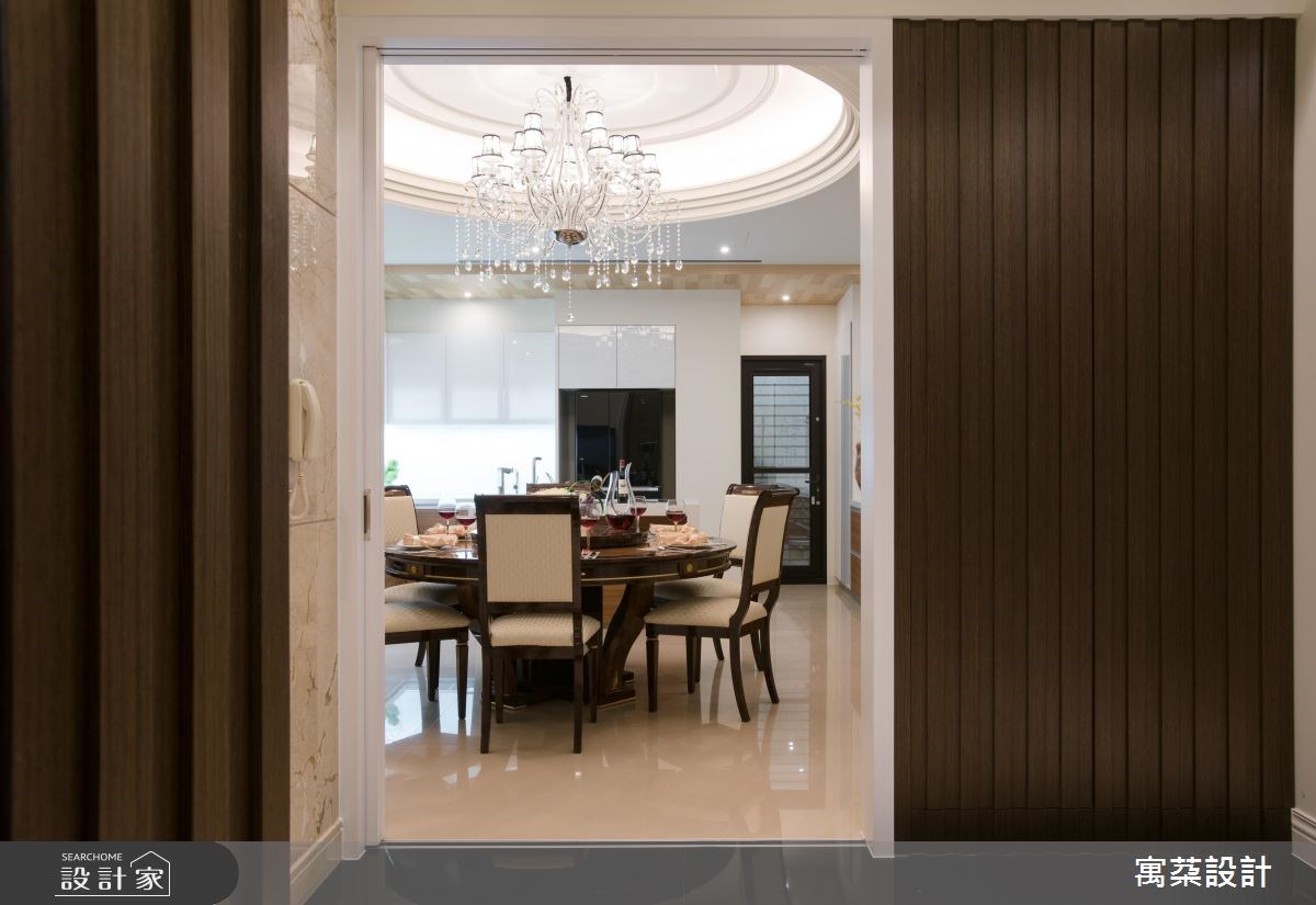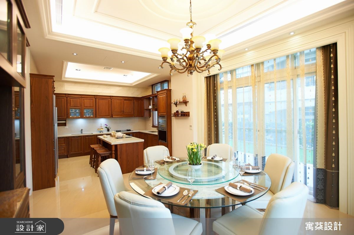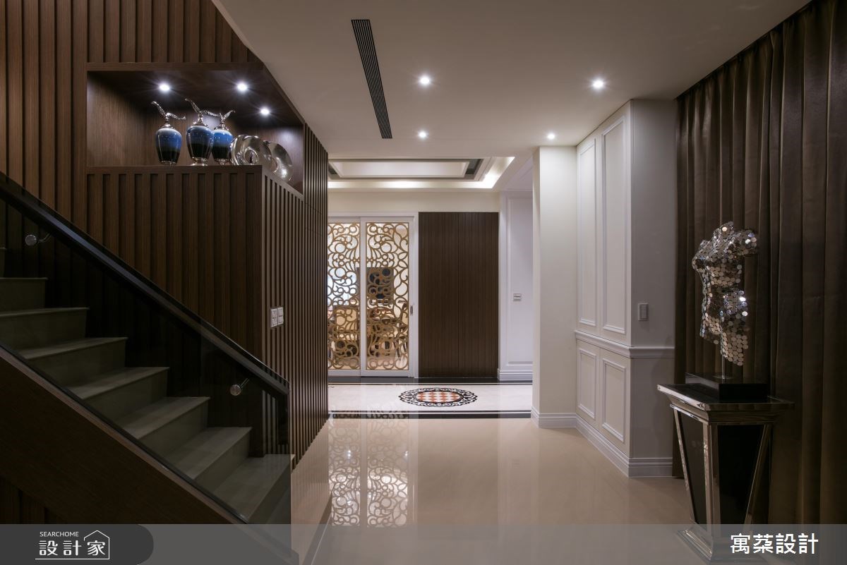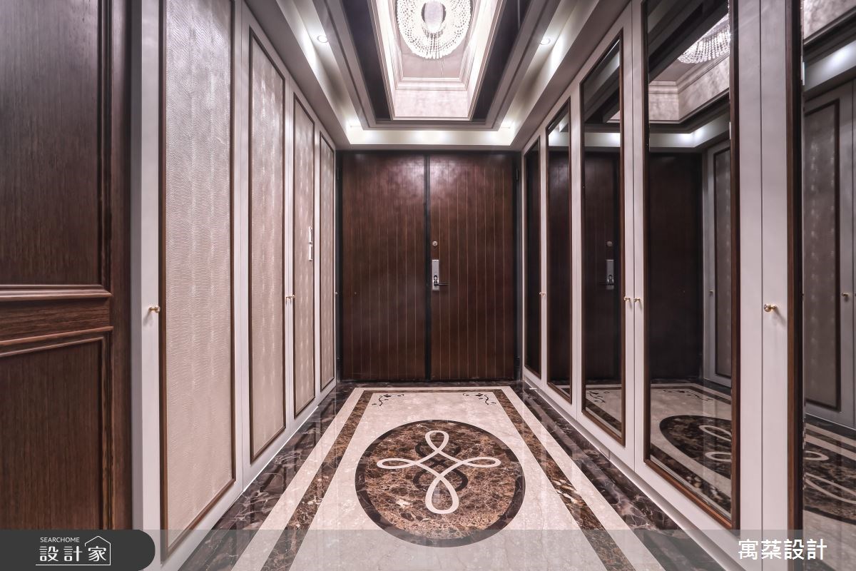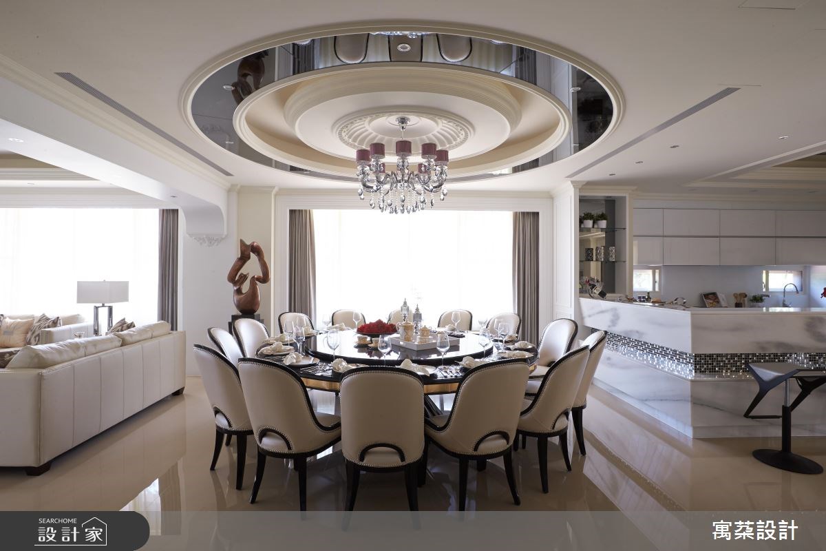 位於淡水的 170 坪氣派豪邸,坐擁紅樹林優美景觀,屋主將其視為度假用的第二屋,期望居宅可引入美景,同時也希望可擁有充裕的宴客空間,於是設計師突破傳統住宅格局,做出符合一家人生活需求的規劃,並以混搭風定調,帶來貴族名流般的住宅氣度,快一起走進這個家看看吧! 玄關處,設計師運用大理石圖騰與手工鑲嵌玻璃,表現開門立見的氣勢感,同時搭佐鏡面材質,但來延伸悠遠的景深想像;延伸入內,則跳脫制式格局,將小餐廳放在玄關後方,形成入門後的第一個迎賓場域;客廳天花板採以線板堆疊修飾,並切割整塊大理石做出仿壁爐設計,營造宛如國外大宅的氣派感,沙發軟件則選用國外進口家具,展示出雍容的宮廷氣息,電視立面兩側結合了展示櫃體,形成客、餐廳之間的完好界定,並導引成流暢的回字動線;大餐廳則陳列圓桌,打造熱鬧的聚餐場域,並可見立體牡丹造型天花,搭配懸吊的水晶吊燈,帶來令人矚目的視覺焦點;在主臥空間裡,則加入五星級飯店格局,涵蓋書房、更衣、衛浴及與睡眠等多種機能,且保留大面落地窗,讓居者隨時與大片美景相伴! 小編的最愛 在百坪格局之外,觸目所及的是更遼闊的視野,戶外露台區可居高臨下飽覽河景與繁華燈景,編構出一幅璀璨的迷人畫面!