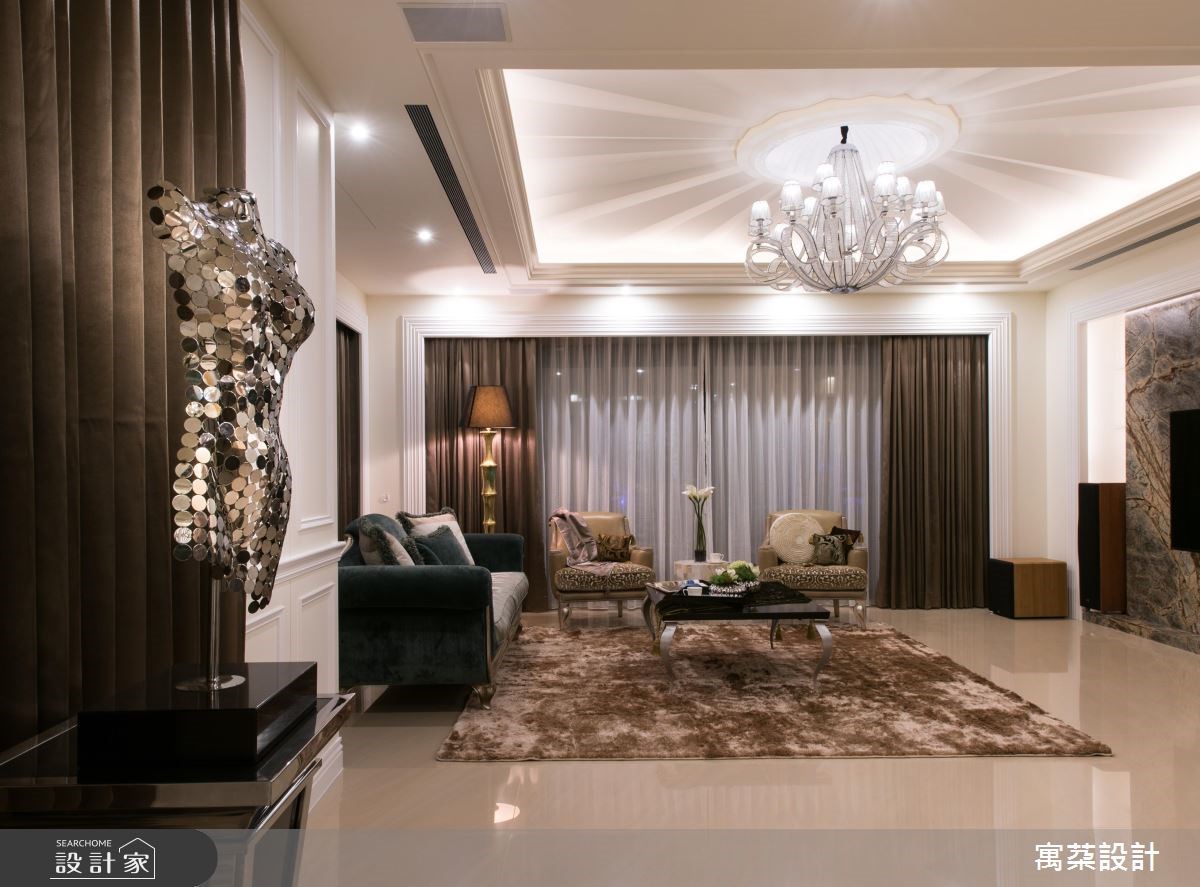 這是一個事業有成的青年,實踐一家三代團聚夢想的故事--屋主在故鄉找到一塊地後,找來設計師進行自地自建規劃,整體空間挹注東方人文元素與新古典語彙,做出巧妙融合,演出大宅氣勢,並依照各家族成員進行適合的起居設計,讓長親房、主臥、兒女房、健身房等各自坐擁更衣間與衛浴,且型塑專屬風格, 讓此兩百坪豪邸化身成為最美的人文藝品,快跟著小編一起走進來看看吧! 客廳讓天花呈挑高設計,透過燈飾懸掛,做出太陽光芒的散射意象,展現極具張力的宅邸氣勢,並於白色基調內融入大理石電視牆及深色軟件,透過色調、材質的鋪排,使廳區呈現穩重豪氣之姿;餐廚領域則連貫開放,將廚具整合於牆,以白色烤漆、淺色木紋鋪述,讓空間顯得輕盈不壓迫,天花則做出圓型造型,懸吊古典感水晶燈,撐托奢華氣勢;主臥天花加入線條元素展現立體層次,床頭則鋪陳褐色繃皮穿插黑鏡點綴,彰顯俐落的人文格調;男孩房床頭加入文化石元素,並給予對稱的木百葉窗設計,搭配書桌延展多元機能,使空間盈滿輕鬆閒適的氣氛;女孩房採線板框飾牆體,藉由淺藍與白色搭配,搭載雕花元素壁爐,展現古典夢幻的優雅風情! 小編的最愛 孝親房充滿尊貴氛圍,採以孔雀藍絲絨繃釘床頭牆,並延續每間臥房的多元機能設定,將更衣室、衛浴藏納於雕花門片後,透過精緻的細節描繪,帶出整體華麗風韻!