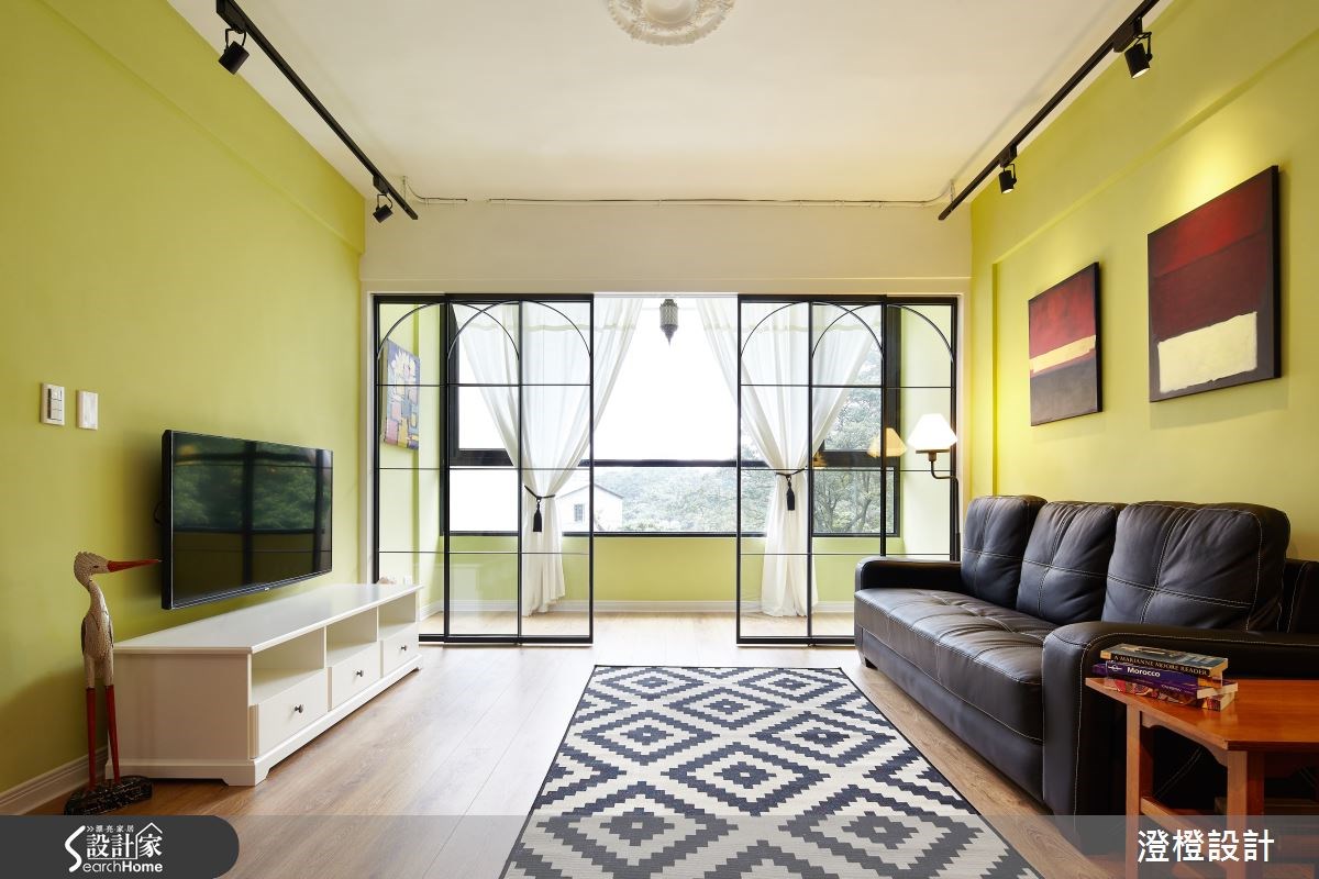 32 坪老屋既有格局陰暗封閉,設計師將其重整,並整合多元設計想法,加入跳色處裡,讓空間元素包羅萬象、結合復古與清新,使風格不違和地相互交融,打造出充滿個人特色的單身居宅,快跟著小編一起走進來看看吧! 空間以淺綠色為基底,大面幅渲染於牆面,搭配木質地板鋪述,挹注朝氣蓬勃的居室氛圍,並以清玻拉門圍塑廳區靠窗區域,門片以黑鐵型塑圓弧及方框語彙,搭配紗質窗簾的對稱佈局,無形中拉闊居家的景深層次,同時運用掛畫、地毯的活潑點綴,讓室內洋溢著獨特的品味格調;開放廚房則採用復古地磚、彩色壁磚延續繽紛感受,透過百葉窗導引明亮日光,且將餐桌、廚房吧檯合而為一,打造出清爽簡約的用餐領域;書房則加入老紅磚素材,呈現粗獷立體、具手砌感的立面表情,並讓書籍、畫作、家飾與燈具等豐富視覺,挹注有如藝廊般的展示效果;寢臥床頭延續了紅磚元素,並搭配鮮明的黃牆色調,同時以老件家具或現代畫作穿插點綴,帶出豐富具層次的空間韻味! 小編的最愛 入門處規劃一面鐵網屏風,在不阻擋採光的前提下作出場域界定,且讓人可隨興地將家飾品、鑰匙等掛於上方,充滿便利機能亦帶有裝飾意味!