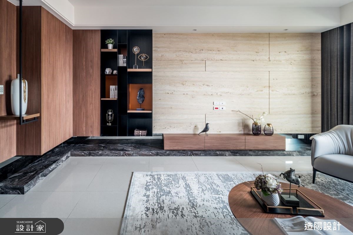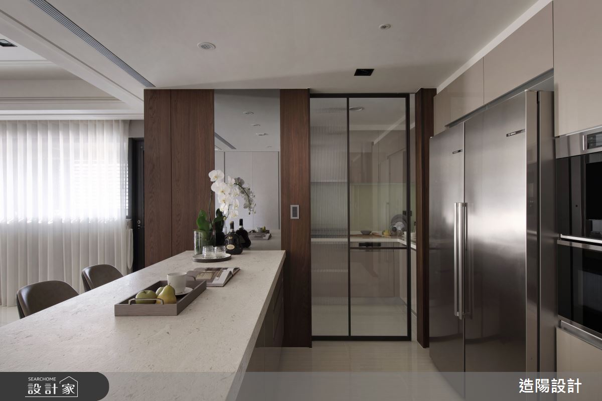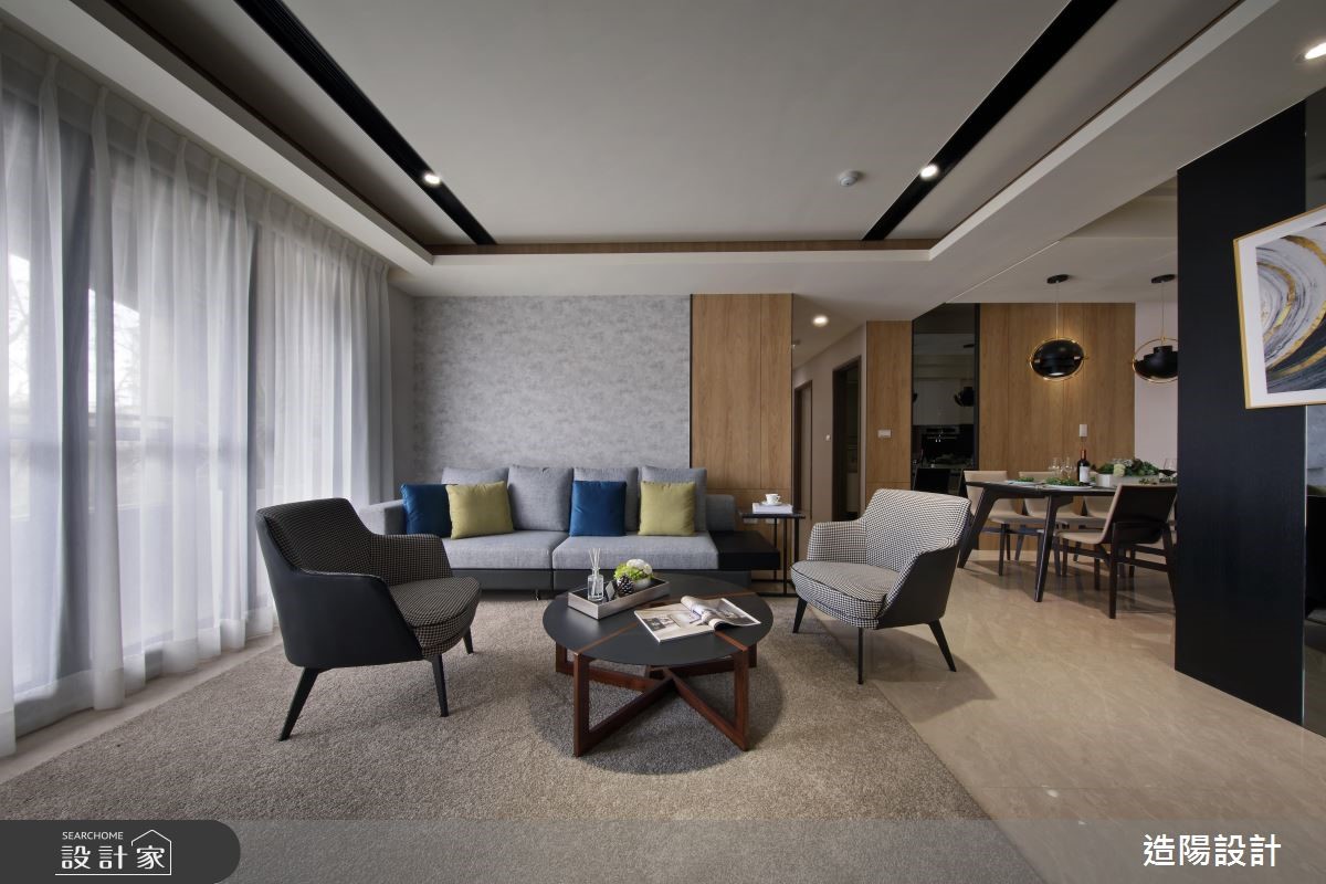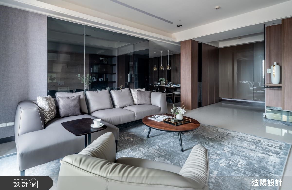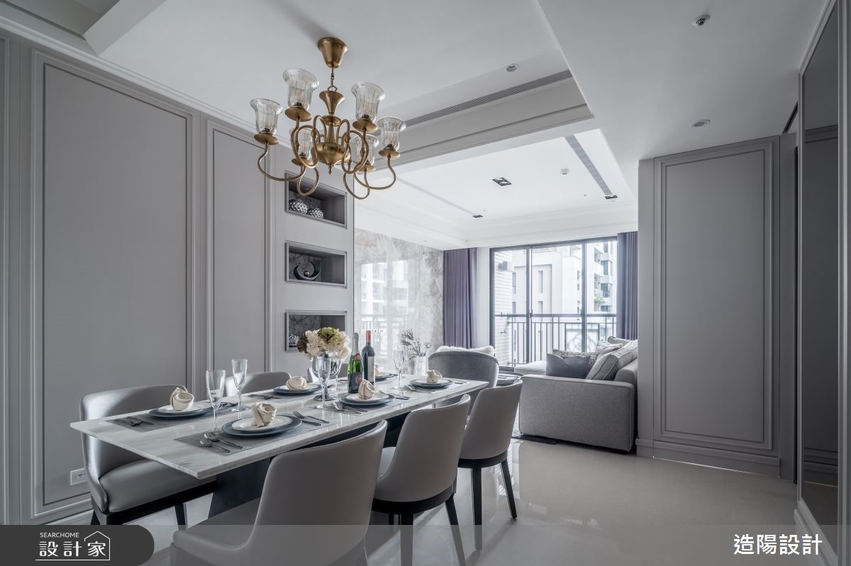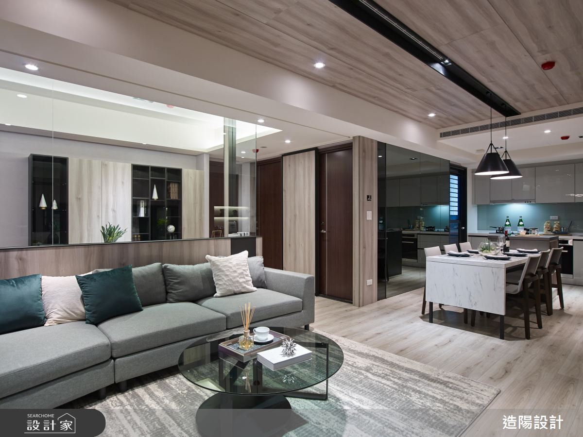 來自造陽設計的120坪新古典住宅案,屋主一家人共有1位大人、2位長輩,是一間單層新成屋(5年以下)的三房格局,設計師藉由建材以鋼刷木皮、系統板材、鍍鈦板、壁紙、烤玻、灰鏡、大理石、線板、烤漆、繃布的搭配應用,實現一家人的理想生活。