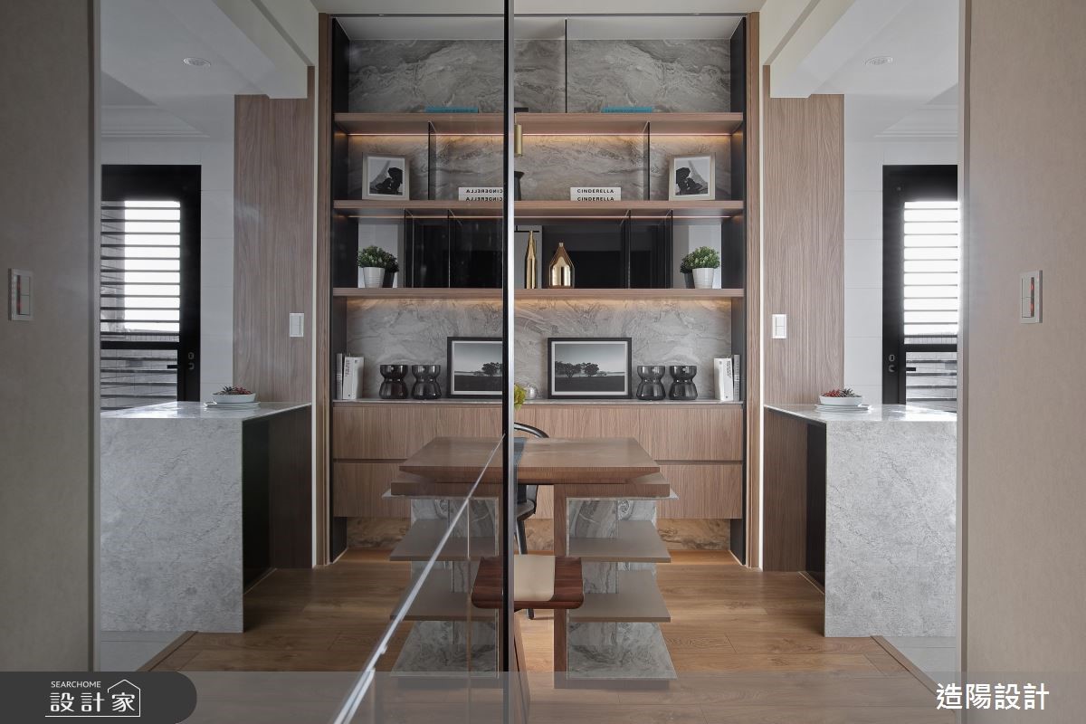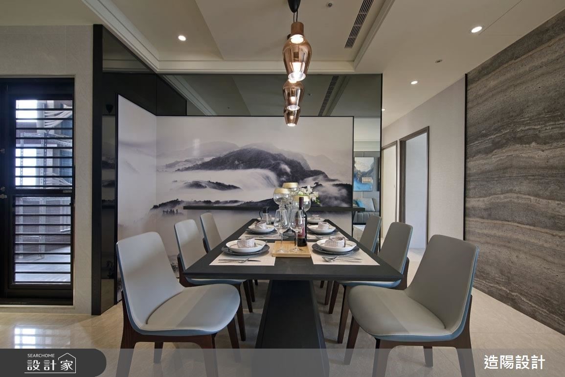 58 坪現代風大宅的屋主,喜愛潑墨山水畫的人文風雅,因此設計師不單單只是在居家陳列畫作,而是透過建材、色彩與佈置的手法,將氣宇軒昂的藝術境界融入環境之中,帶給家人雋永的開闊空間。 玄關在頂天立地的淺木色櫃體,佐以大理石材質,巧妙提升室內的奢華感,加上中間透過玻璃襯底與懸吊鐵件,讓視覺可以聚焦於金色的盆景裝飾,使人一進門就體會到室內的高雅氣質。客廳沙發背牆透過大地色的皮革妝點,配合霽藍色從一張張掛畫翻騰而出,串聯起地毯、抱枕和單椅的跳色,創造山川壯麗的悠揚氣韻。 客廳電視牆鋪排大面積的銀灰洞石,轉個彎延伸至餐廳立面,與 L 型的水墨畫主牆邂逅,營造面向山林、享受靜謐的用餐意境。主臥床頭以簡潔的線條凸顯空間的沉雅質感,而更衣室則採用茶玻為隔間,使光線可以盡情穿梭,且於收納櫃的抽屜和層板也都選擇茶玻元素點綴,讓女主人能井然有序地擺放摯愛精品。 小編的最愛 書房利用清透的玻璃門,把美好的夕陽景緻,引入連接公私領域的廊道,使人的一來一往都有窗外的光景伴隨,沉浸於愜意自然的生活氛圍。