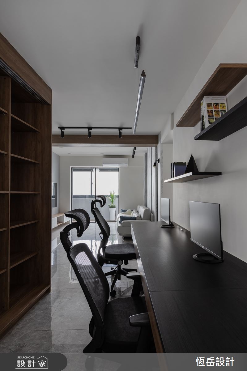 恆岳設計以乳膠漆、超耐磨木地板、石英磚/拋光石英磚、灰鏡、木作貼皮、鋼刷木皮、系統板材、磁磚、軌道燈的搭配應用,呈現混搭風居家氛圍,將此間26坪、三房、老屋(41~50年)打造成舒適愜意的家庭空間,完成2位大人的夢想之居。