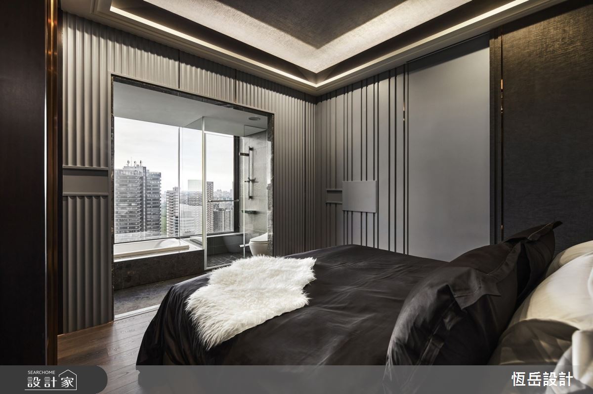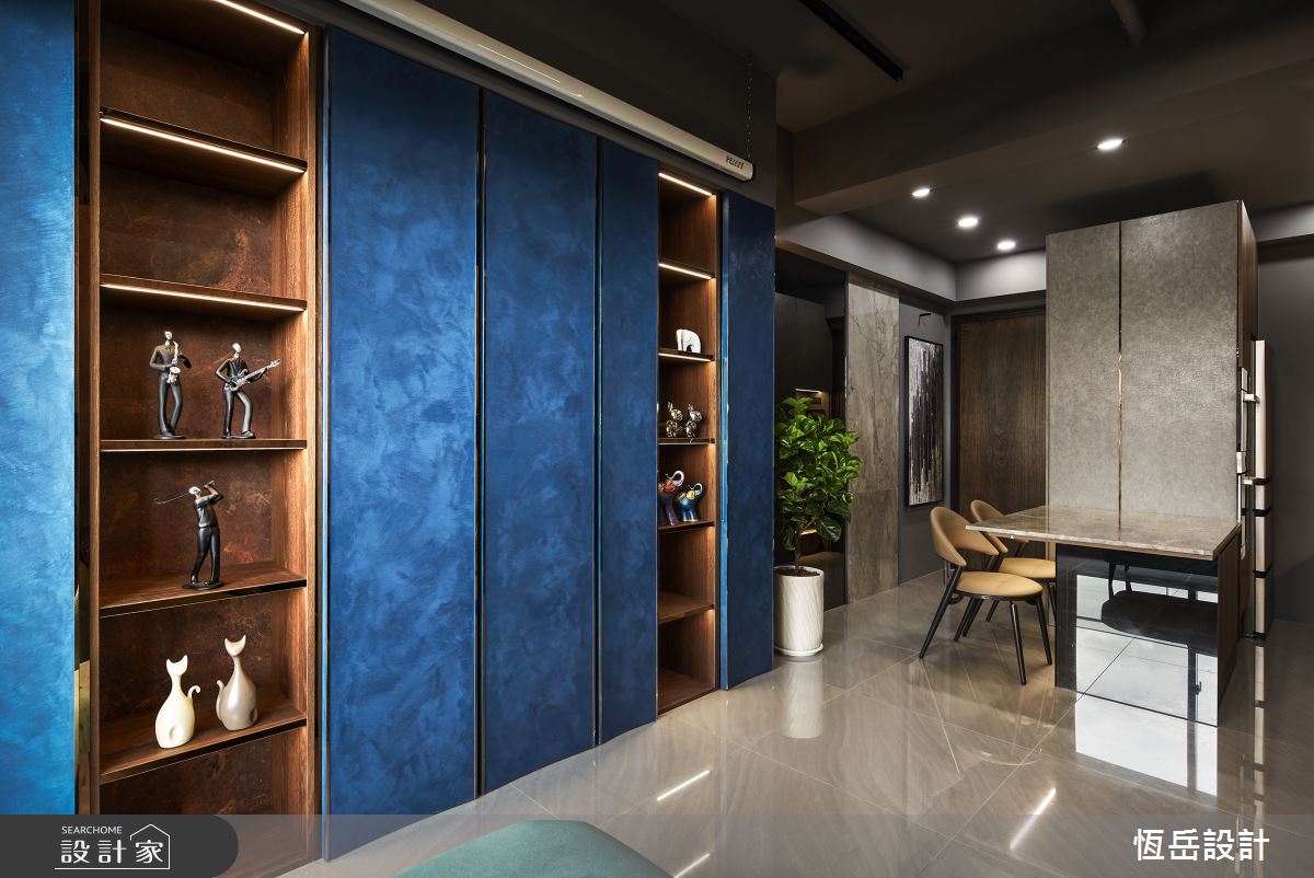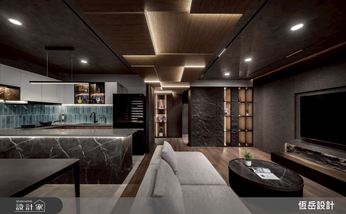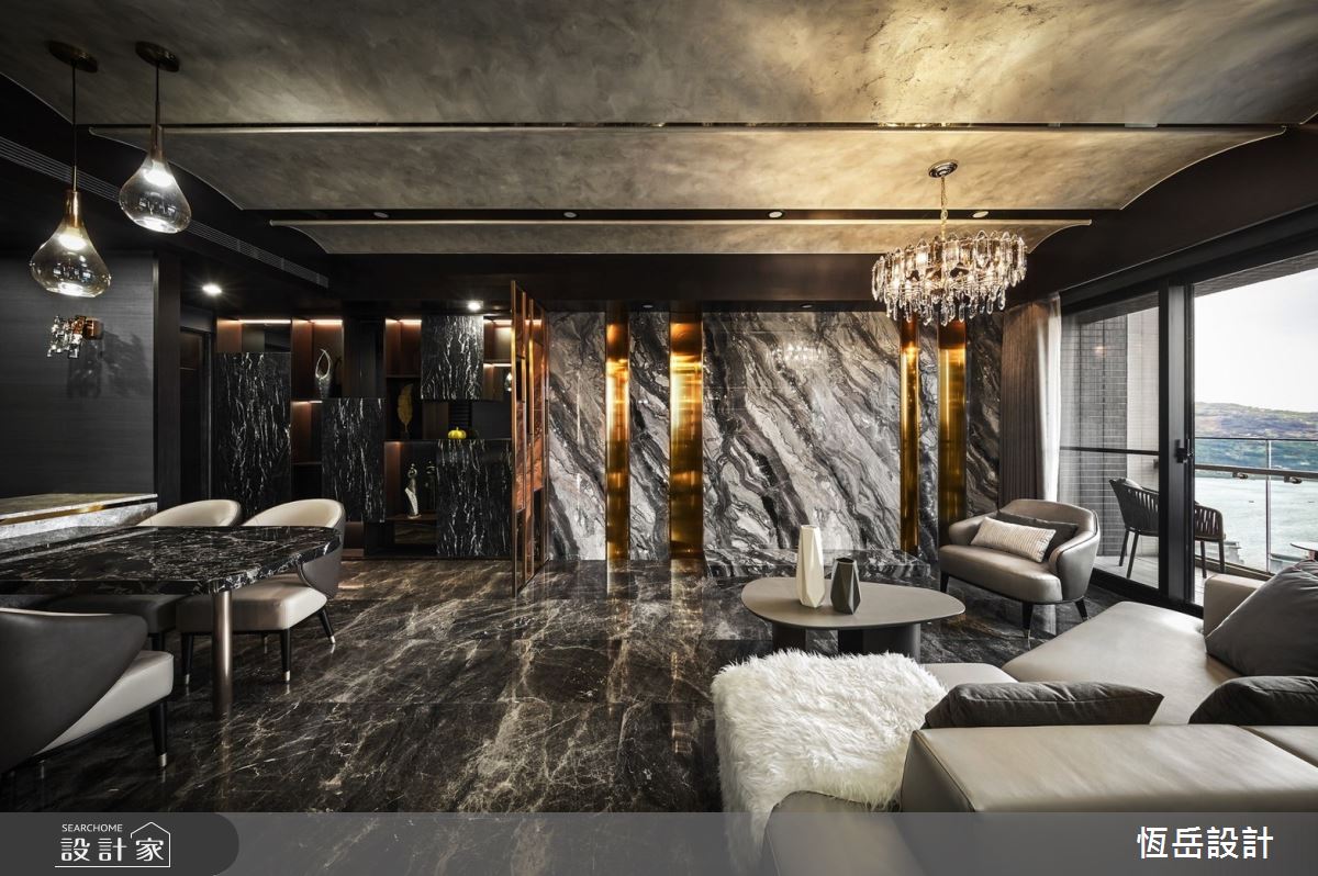 恆岳設計以大理石、鈦金、特殊漆、茶鏡、黑鏡、壁布的搭配應用,呈現奢華風居家氛圍,將此間30坪、兩房、單層、新成屋(5年以下)打造成舒適愜意的家庭空間,完成全家人的夢想之居。