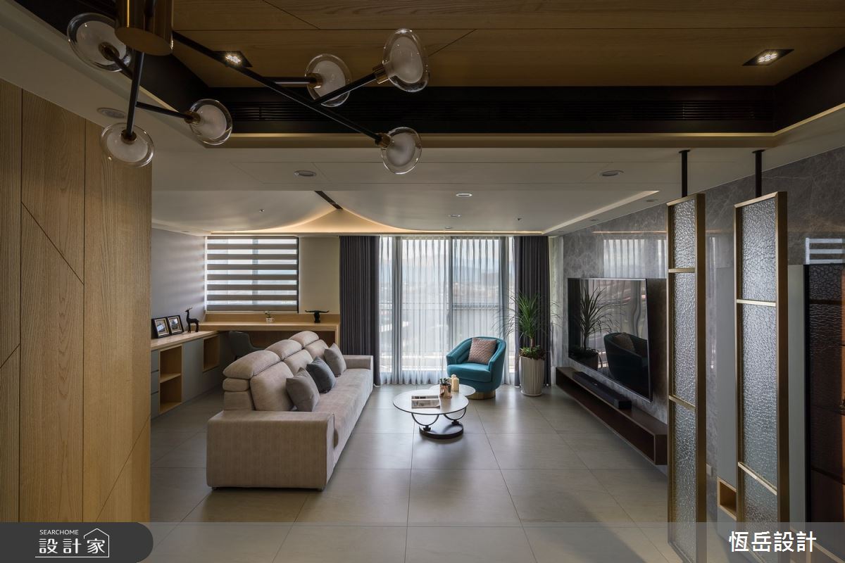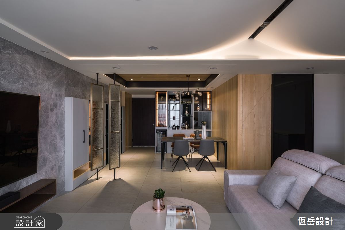 恆岳設計以大理石、鈦金、特殊漆、茶鏡、黑鏡、壁布的搭配應用,呈現奢華風居家氛圍,將此間30坪、兩房、單層、新成屋(5年以下)打造成舒適愜意的家庭空間,完成全家人的夢想之居。