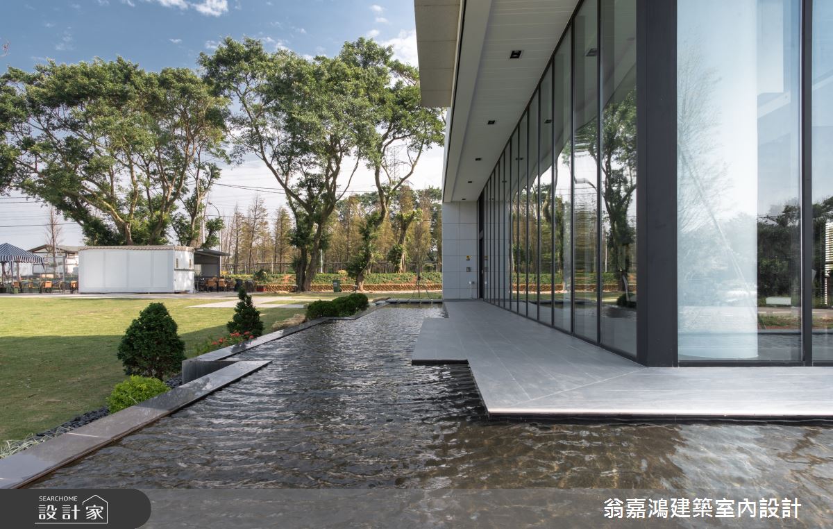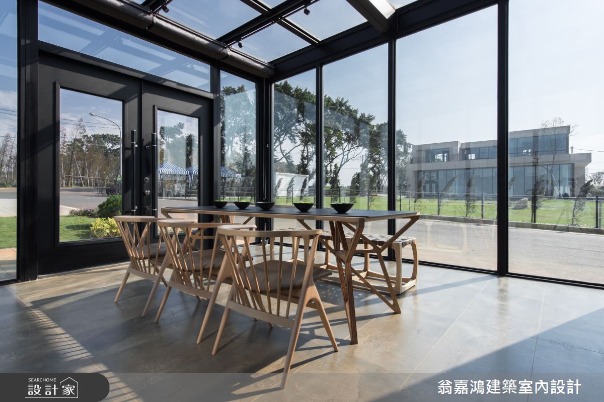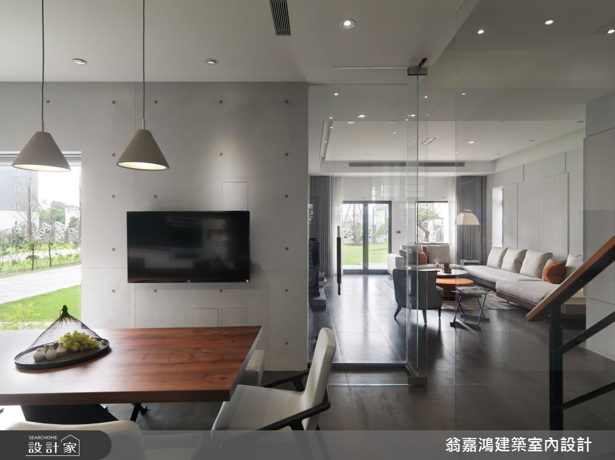 150 坪的透天別墅,建物坐落於大面積的綠意草地,享有景觀池塘環繞,設計師借引陽光、空氣、水的美好條件,並以現代風作為語彙,構築出裡外皆美的莊園景致,快跟著小編一起走進來看看吧! 一樓公領域,規劃大面落地窗導入採光與景色,使視線可延伸向外,模糊室內外的分野,予人身處大自然的錯覺,並在廳區天花做出獨特設計,以垂降燈飾型構高低層次,打破空間的僵化感,一整面大理石牆則充滿行雲流水的紋理,與向上的階梯融為一體,構成恢弘大器的主視覺立面;同時以水泥粉光包覆私領域,型塑沉靜恆定的空間感,成為襯托家具的素樸背景,把金屬、皮革與木作烘托得更為細緻,而隨興擺放的飾品軟件等,則表露出居者的絕佳品味! 小編的最愛 戶外建構一處玻璃屋,藉由清玻打造天花,納進藍天、綠意與陽光,儼然是下午茶與日光浴的最佳場地,悠閒度假感由此誕生!