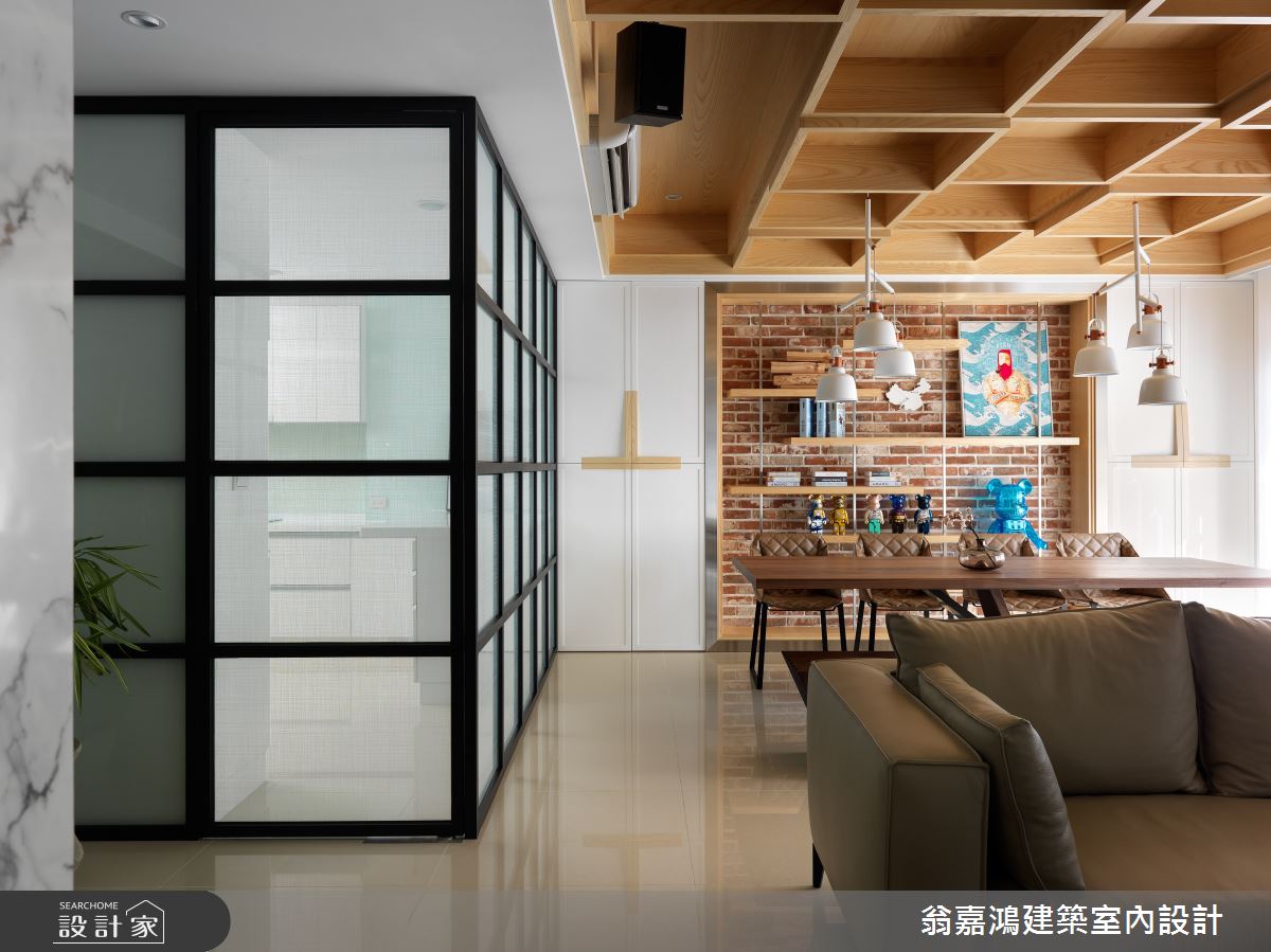 百坪大宅裡,藉由俐落、明快的線條描繪出空間象度,並透過立體方格創造出壯闊的天花板意象,打破一般居家概念的設計運用,輕啟窗簾將戶外的綠意風光引入,內外景緻相互呼應,休閒之中吐露優雅氣息,並將現代感的設計語彙發揮到極致。 寬敞、開放的公領域裡,串連起客、餐廳與廚房領域,藉由大尺度的視覺安排,擘劃出軒昂氣度的室內宅邸。客廳裡以自然紋理的石材鋪陳出電視牆造型,利用鐵件的立面分割技法,刻劃出豐盈的視覺變化,後方餐廳的壁面則以粗獷質感的紅磚牆鋪陳,再搭以錯落的木作層板,與坐落有序的木作格紋天花板相互陪襯,織就漸層、創新的韻律美感,搭佐空間裡設計感的燈飾、美學物件或藝術創作,帶來視覺上的無限驚喜。 小編的最愛 利用玻璃結合鐵件框構出的輕透拉門,成為廚房與公領域的界定,從陽台映照入室的自然光源,也能引入此區使用,營造出明亮質感。