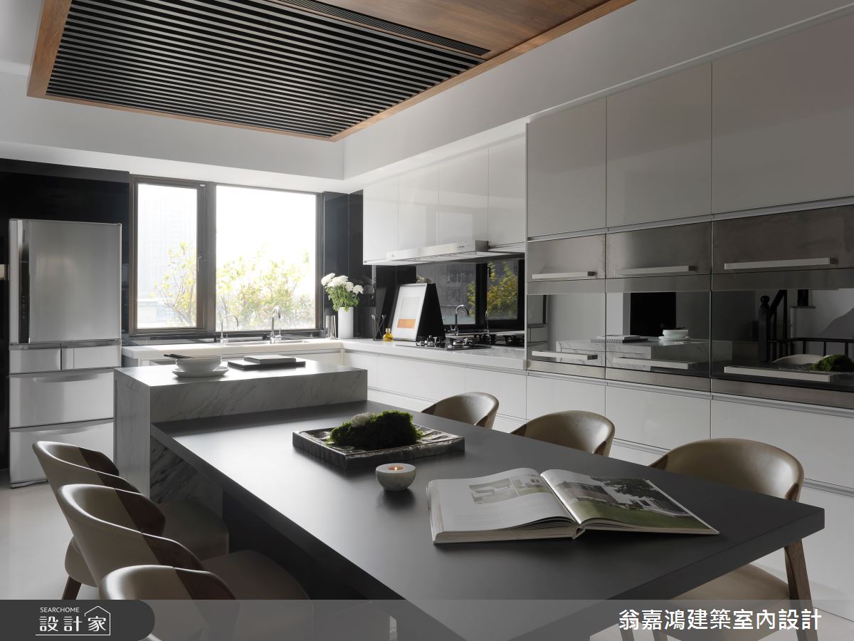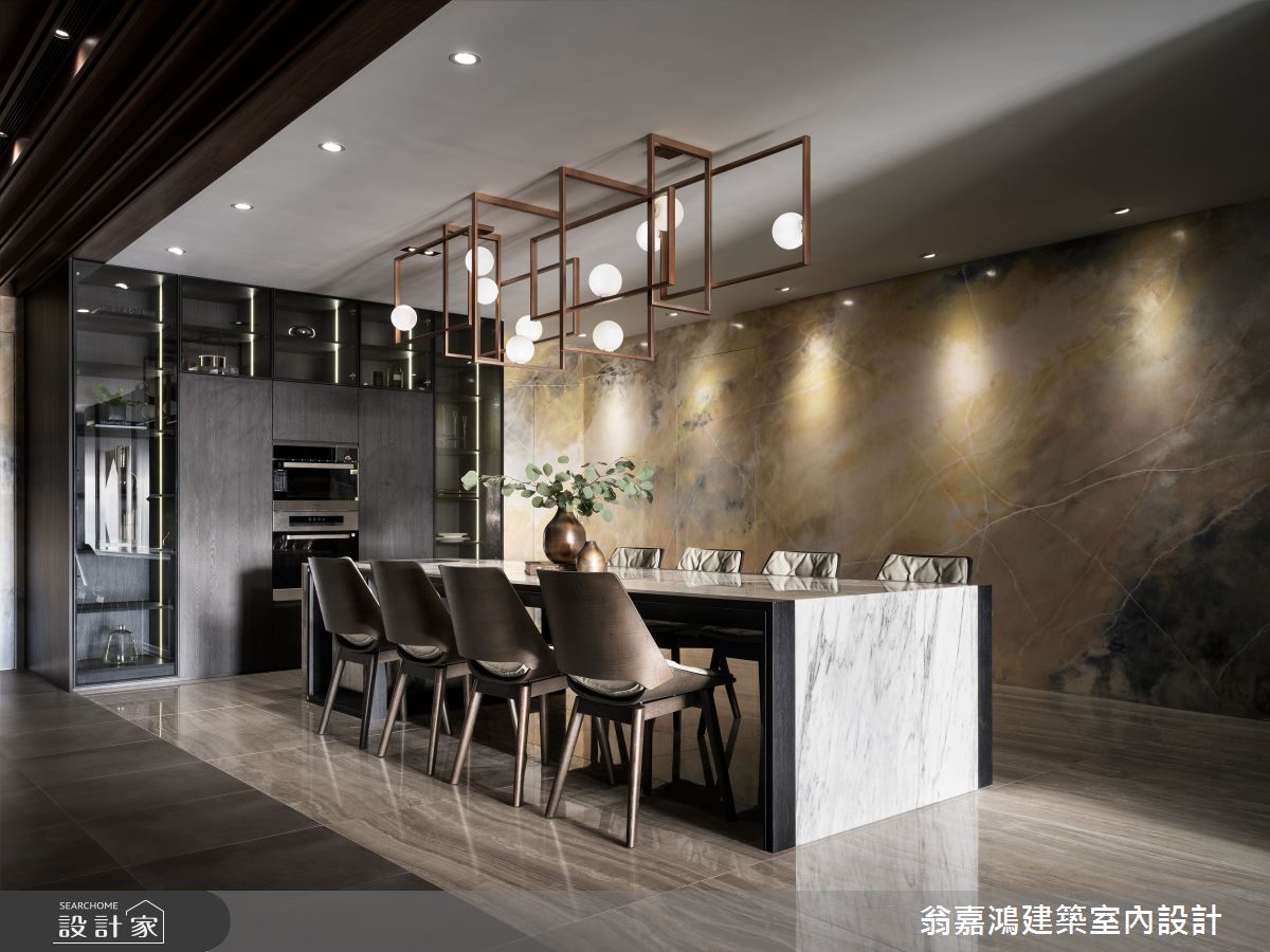 什麼樣的住宅空間能讓人即便入住一段時間,依然會想反覆咀嚼空間的美。位於林口新興區的90坪住宅裡,有著現代感十足的俐落線條,以及自然建材散發的樸實之美,遁隱於大台北地區,以經典乘載家人的生活空間。 公共區域洗練的成熟風格由低彩度的灰、黑、深棕等等沈穩色調打底,透過大理石、鍍鈦金屬與鏡面等現代科技材質詮釋宅邸俐落又率性的風格。石材電視牆粗糙的質感與自然起伏的紋理面對拋光大理石與鍍鈦格柵拼接而成的沙發背牆;對比材質激盪出獨特的美學,以鏡面鋪陳天花板打破空間的概念,反射與延伸出耐人尋味的視覺焦點。寬敞順暢的動線配置,不僅創造出家人的休憩區域,作為屋主待客與社交的場所也十分適合。 餐除區域延續客廳豐富的材質堆疊以及穩重風格,一座大型中島將餐桌與吧台整合起來,收納機能巧妙地融合於牆面,並添加鍍鈦金屬與玻璃勾勒出電器櫃風格,簡約而富含精緻細節的設計,讓機能為核心的餐廚區不失風格,反而強化的空間意境。進入私人領域,金屬與鏡面替換成了質地柔和的胡桃木與清水模設計, 色彩也從深色系調淡成白色與淺灰。單純化私領域的材質,僅透過板材拼接後呈現的切割流露自然的設計韻味,在蔥蔥鬱鬱的大台北地區,構築一座具備現代經典特質,又能賦予居住者生活休憩、沈澱與對話的住宅空間。 小編的最愛 深色系打造而成的餐廚空間襯托著長型白色大理石桌面,一盞立體幾何造型強烈的紅銅餐燈,讓人想遠離電視與手機,好好的品味空間與餐點。