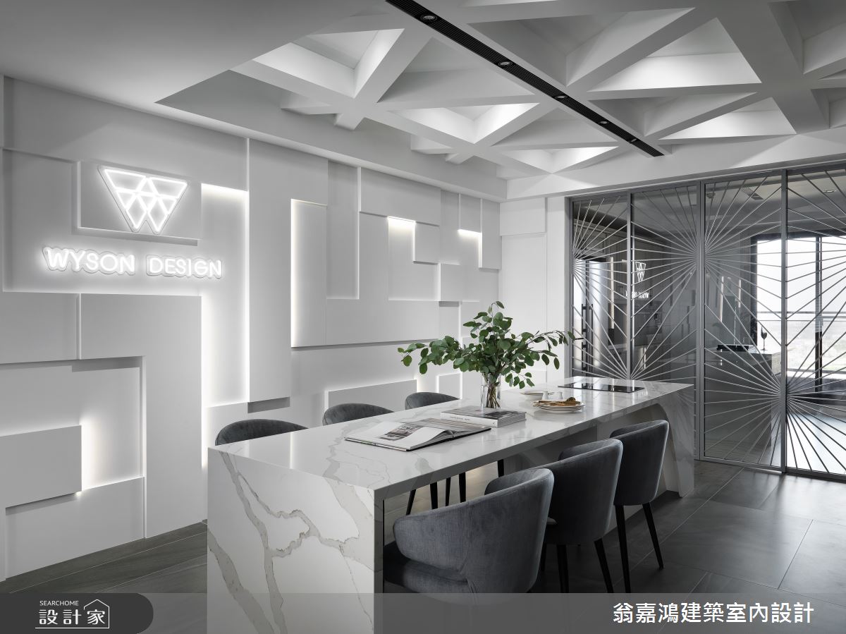 100 坪大宅,業主期望可在家中呈現多變前衛的風格,設計師透過立體進出面打造立面造型,並於天花加入線條的秩序排列,引領出生動的視覺韻律,為空間帶入豐富設計層次,快跟著小編一起來看看吧! 整體以白色調鋪陳主調,透過開放式格局串連客廳與餐廳,使視野更顯敞朗開闊,讓自然光得以盡情揮灑於室內,同時加入幾何概念語彙,於天與壁鋪敘線條、塊體的進出堆疊,創造張力十足的視覺效果、勾勒居家立體輪廓;延伸至餐區,則選用黑白雙色作為色調主軸,結合燈光的烘托堆疊,使餐廳瀰漫著年輕個性的氣息,再配置拉門界定餐廳與廚房,順著動線可延伸至廚房段落,並於門片勾勒出散射狀的線條造型,讓門片亦成為深邃聚焦的端景畫面;寢臥,採以沉穩深灰為底,並將花草畫作化為個性化的彩繪圖騰,將粗獷揉合新潮,帶出了屋主對於品味的要求! 小編的最愛  屋主喜愛創新的設計,希望可在家中加入設計公司名字,於是設計師於沙發牆面鑲上燈光、秀出LOGO,讓整體更添摩登感!