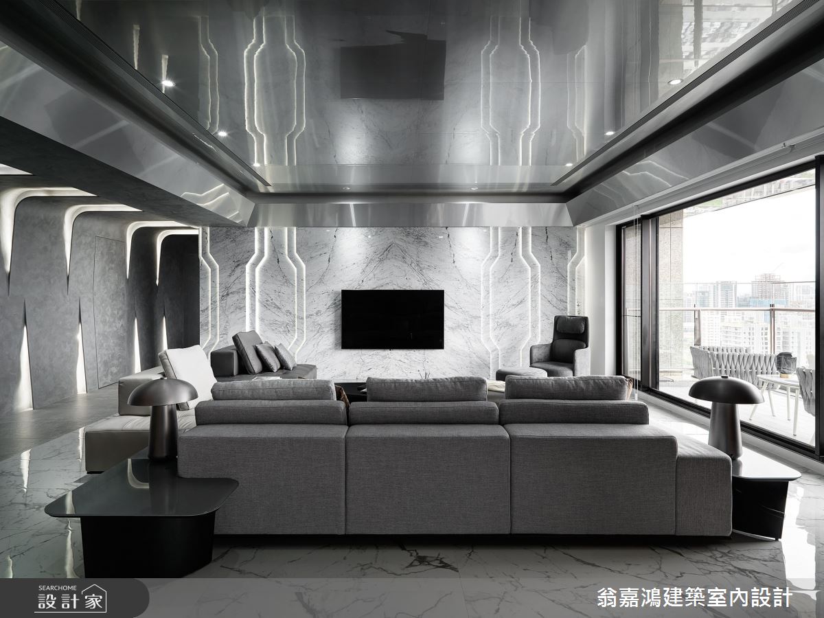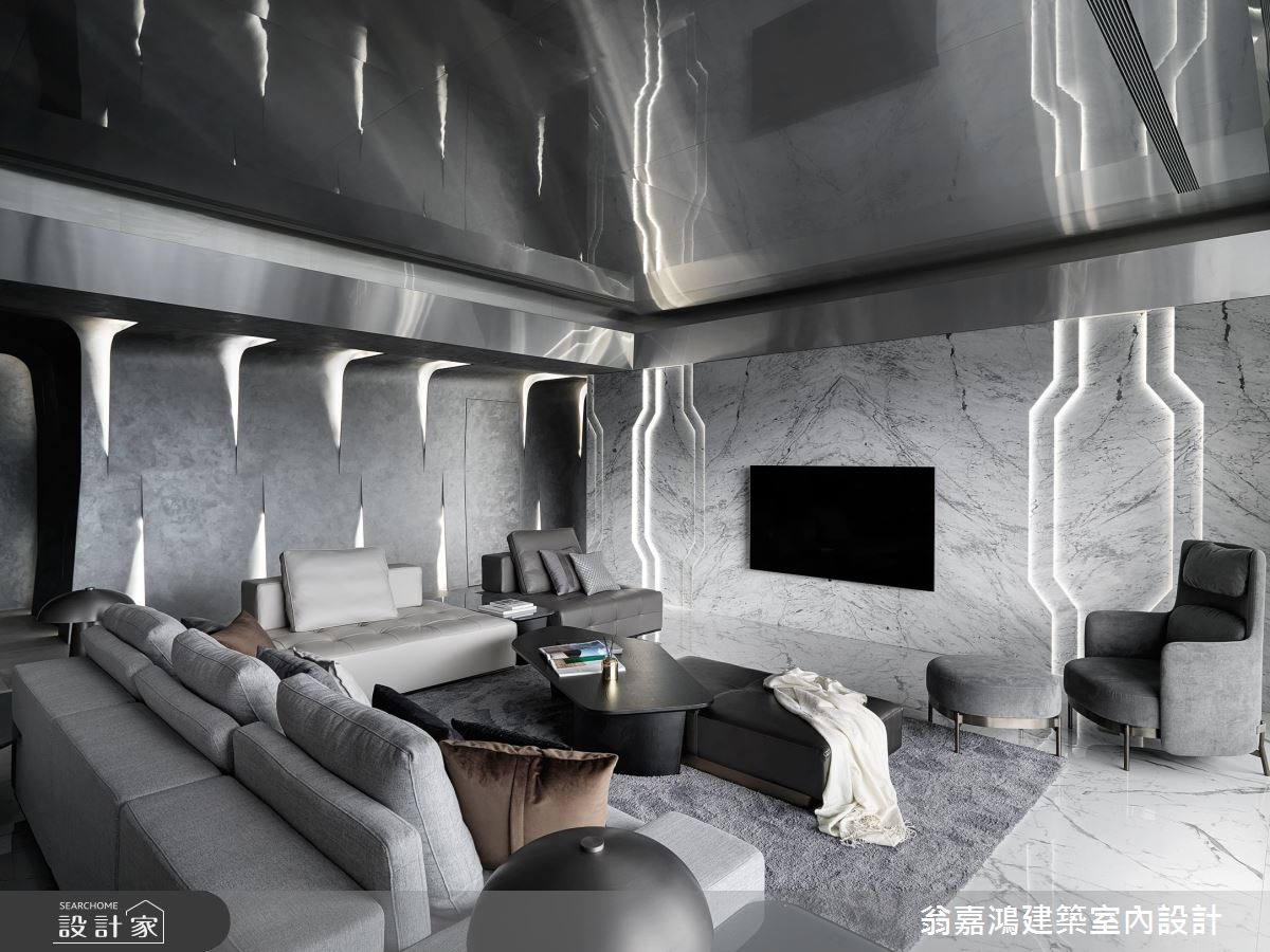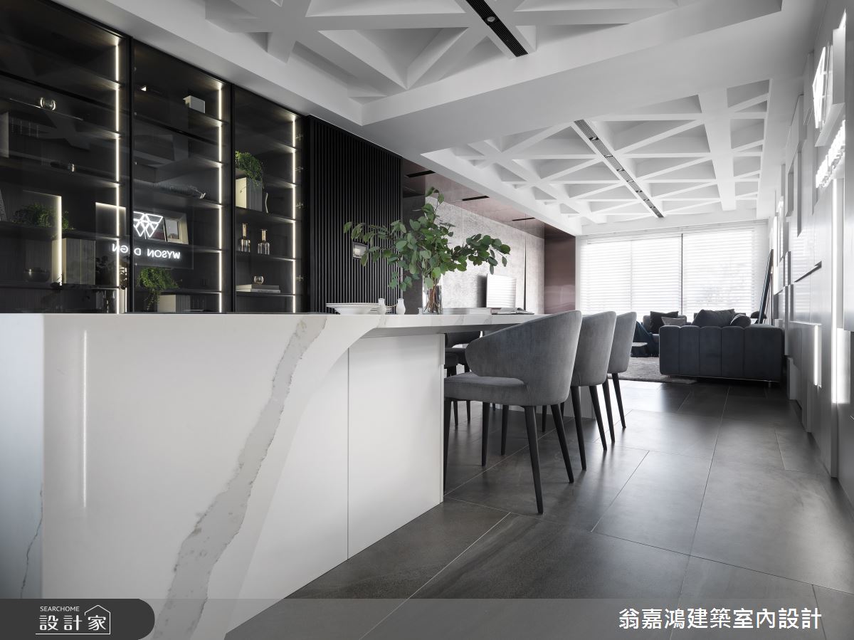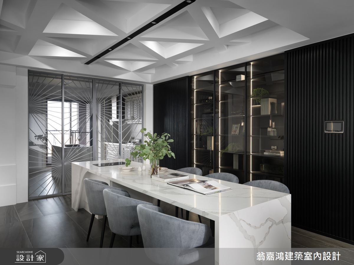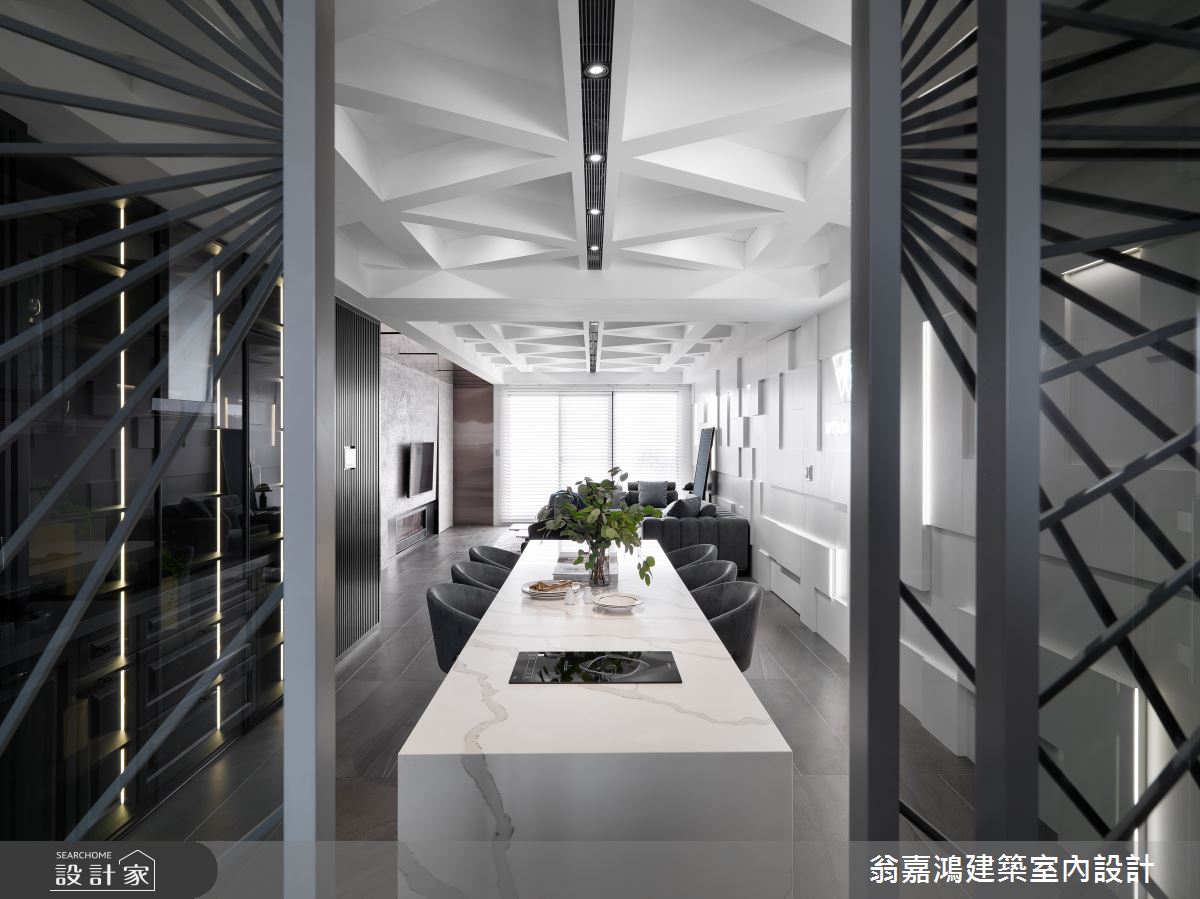 家和居住者共同成長、相互造就的,同時更能看出主人家品味,如何將對美的定義點滴融合近日常之中,並且使親朋好友能夠感知,完成「人如其家」空間,不只是對美好生活的追求,更會成為一種態度。 在這座大尺度的私宅中,屋主希望在最微小的尺寸間,盡可能展現設計的強大力度,盡情揮灑設計的最大可能。設計師選擇灰、白、黑三色作為場域的主色調,藉由低飽和度、無色相系的色調創造整體空間的設計氛圍。客廳的電視牆以白色大理石為主體,並由地板延伸而上,牆面輔以雕刻工藝,製作出與眾不同的層次與弧度,同時埋入LED光源,讓電視立面更為立體深刻。而客廳一側連接公、私領域的走廊過道以銀灰色的特殊漆料,加上造型俐落的切割、並且鑲嵌進燈光後,與金屬材質的天花板構成了炫目科技之感,注入現代、前衛的氛圍,為居住空間帶來前所未有的獨特體驗。 灰色帶來沉穩、考究的感受,在這之中以木質調作為拉門及隔屏,建構起開放式的餐廚空間,成為家的中介,並且平衡整體感受。以大地色系為背景鋪陳,開放式中島連結大長桌,有效拓展使用機能,更能增進家人情感與交流;而此處天花板選用黑鐵包覆,輔以線性裝飾線條令吸睛效果十足,搭配環形錯落的造型燈飾,讓使用者彷彿置身外太空。進入臥房區域,有別於公共空間強烈的科技感,整體氣氛顯得更加多彩、溫暖,個性鮮明的床頭牆,為每間房間注入獨特的個性,而衛浴空間更運用了兩種以上的磁磚堆疊拼接,在任何細微處絕不馬虎,設計師期待以對細節的琢磨,成就不凡的家居氛圍,讓空間能在兼具設計感之餘,成為更有主人個性的居家生活所在。 小編的最愛 餐廚空間與客廳的連結處以格狀玻璃推拉門做為空間的區隔,一方面可強化公共場域的視覺穿透感,同時亦可順應不同使用需求改變尺度。