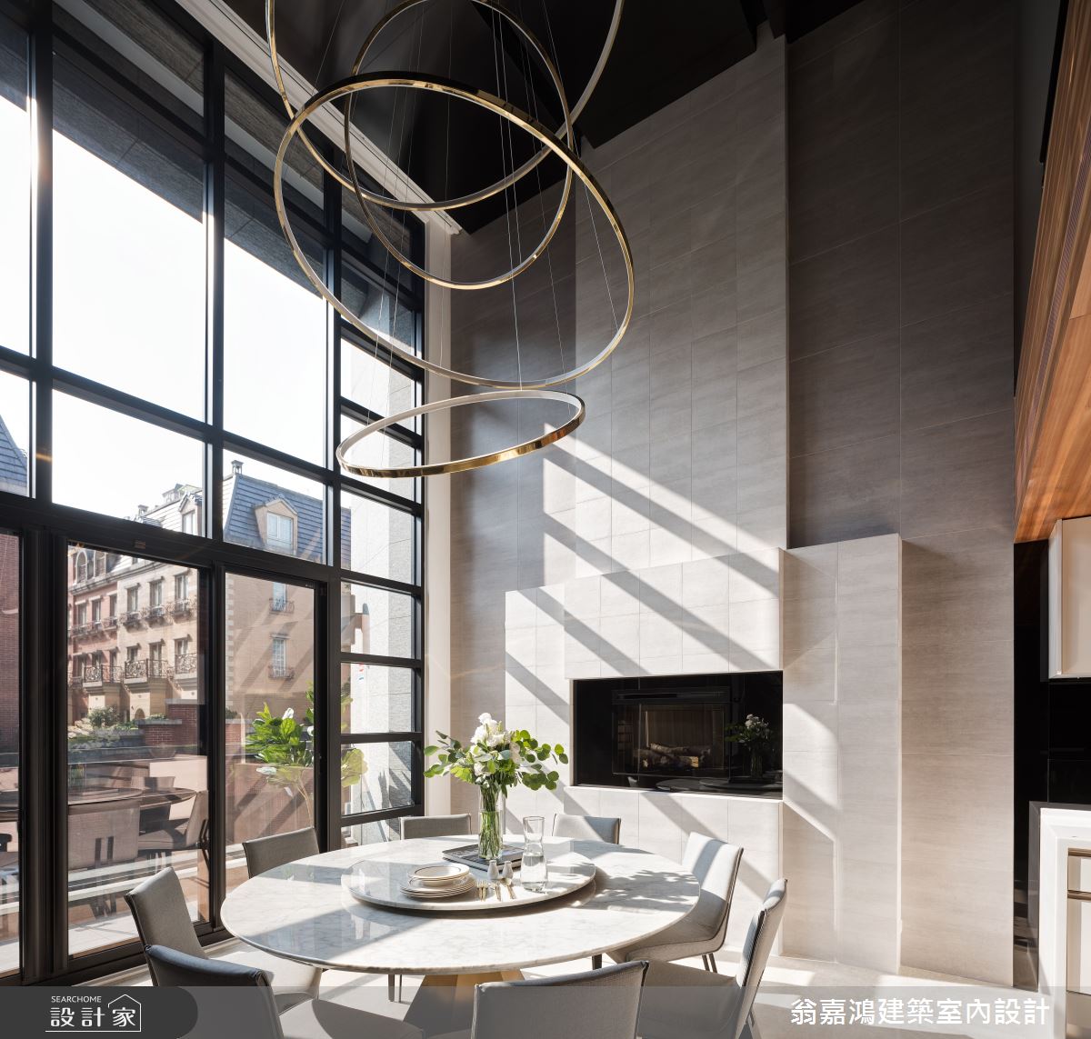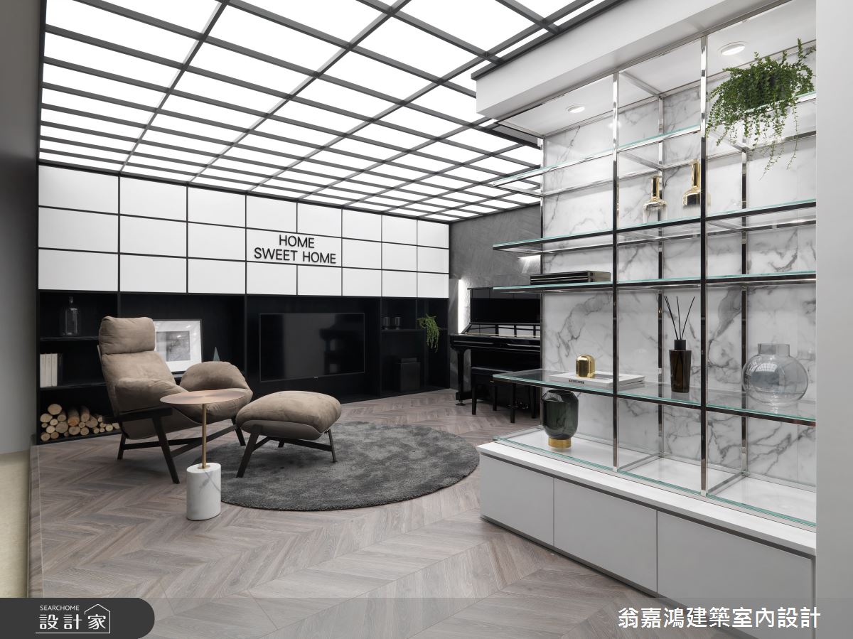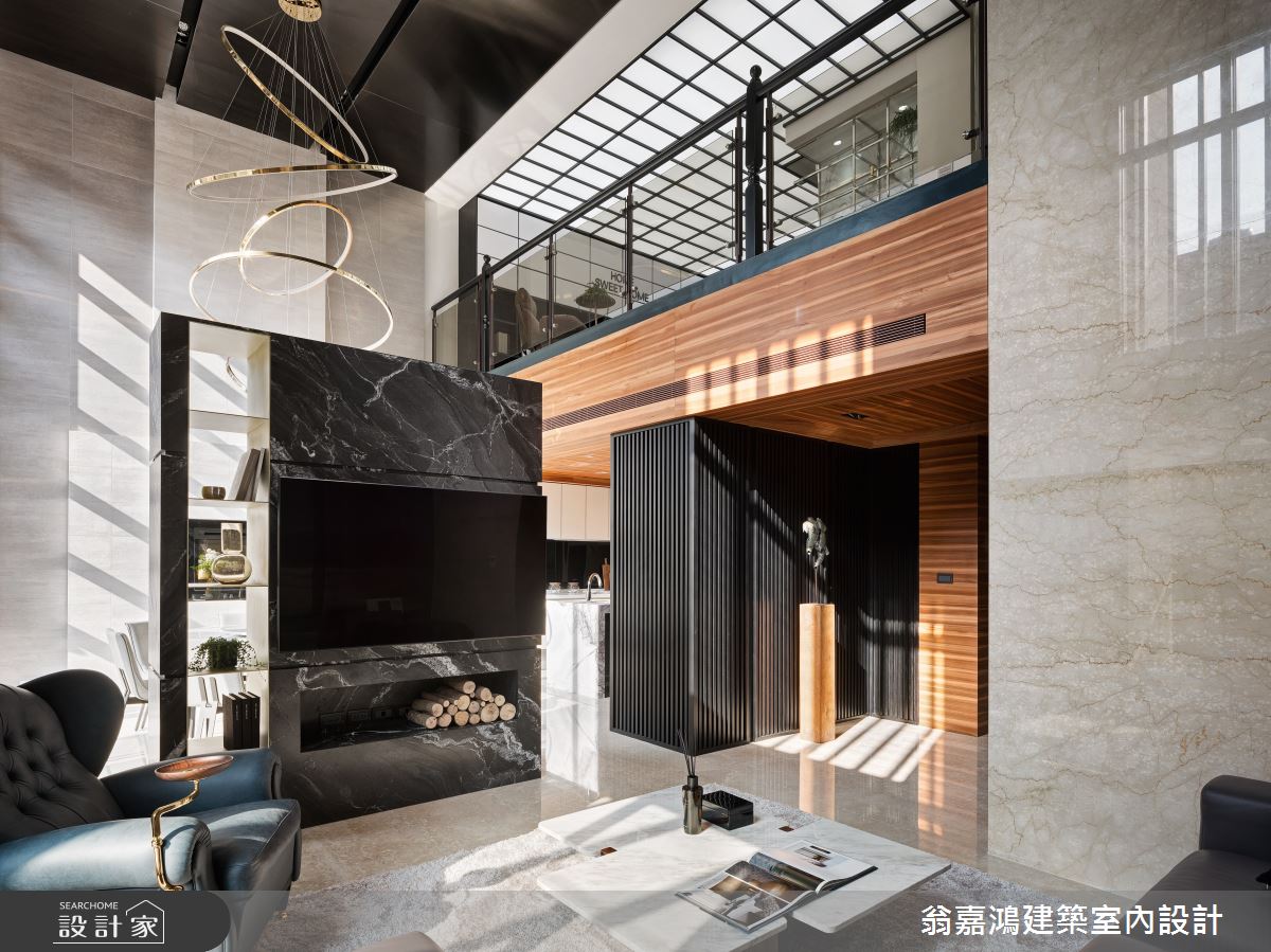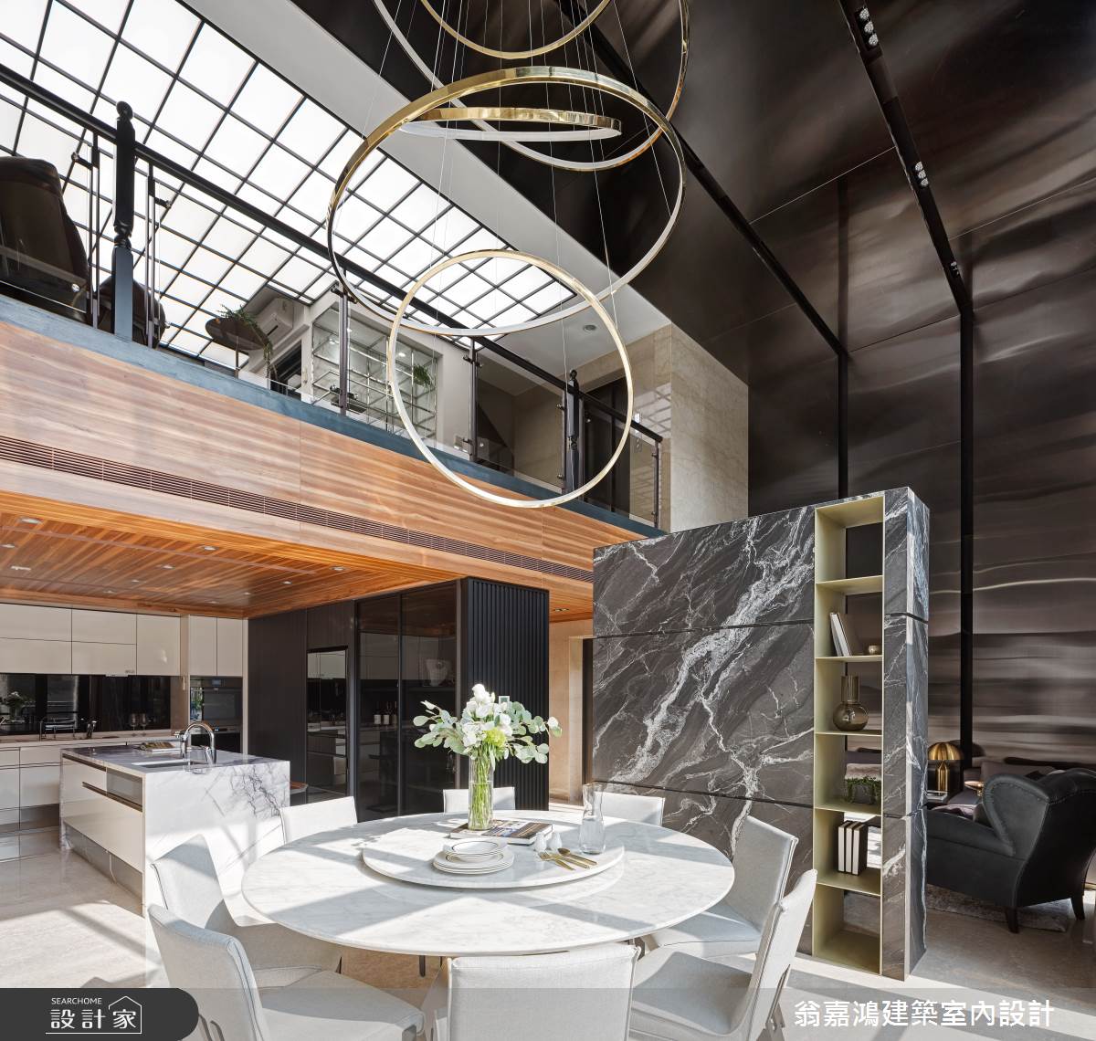 130 坪現代風透天別墅,屋主夫婦年輕有為,舉手投足間散發時尚氣息,不禁令人想起香奈兒經典語錄:「想要無可取代,就必須時刻與眾不同。」此次設計鬼才翁嘉鴻設計師,會如何打造與屋主氣質相投的時髦空間呢? 公領域全開放設計,並發揮透天別墅的格局,以一路延伸至二樓的落地窗、背牆造型、垂降簾幕、從天而降華麗的鍍金吊燈,發揮挑高格局優勢,彰顯恢弘氣度;客、餐之間以大理石電視牆劃分,潑墨山水意象的電視櫃紋理,為空間染上一絲內斂韻味,垂直鏤空的收納巧思,成為兩空間的端景造型,增加更多對話與視線交流機會;用餐區從天而降的鍍金吊燈,能立即抓住眾人視線,前衛又氣派,圓桌設定象徵凝聚一家人情感,也柔化了空間直角及未來感建材的俐落;二樓下方位置安排廚房機能,天花及立面以木質包覆,配合雪白的紐約紐約大理石中島及廚具設備,形塑溫潤而清新的形象,置中的中島檯面,平時作為備餐區,賓客人數較多時,能作為客、餐廳的延伸場所。二樓多功能娛樂室,是練琴房、親子互動園地或閱讀小天地,利用材質及線條表現,勾勒出黑白格紋時尚表情,半開放的穿透格局,讓悠揚樂聲飄揚整室。 小編的最愛 小孩房床頭背牆以世界地圖及水藍色海洋作為主軸,充滿幻想與冒險的活潑空間,跳脫公領域氣氛,提供小孩歡樂的成長環境。