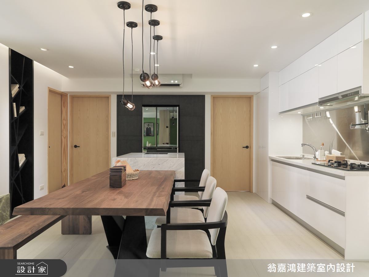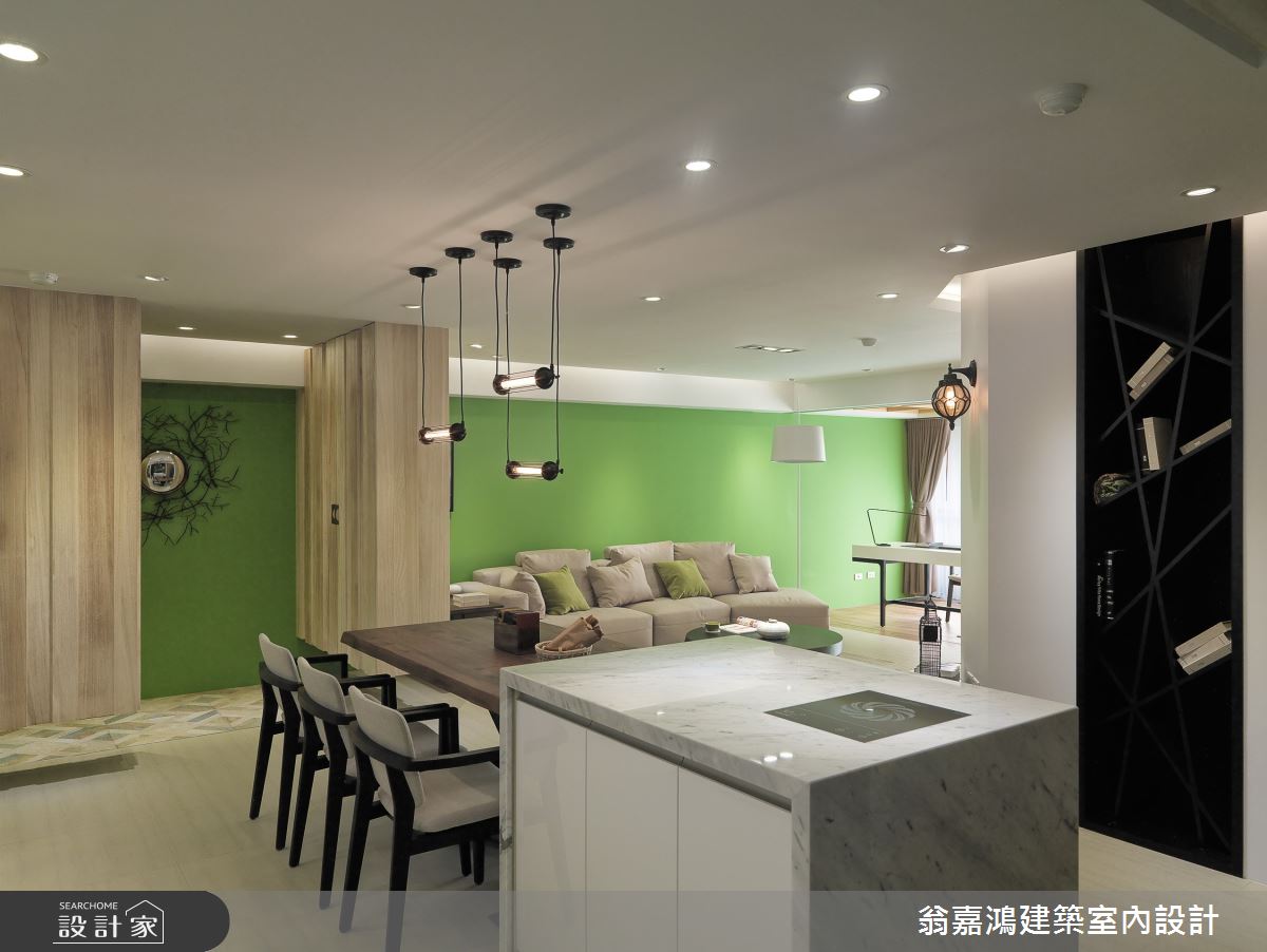 設計師微調本案新成屋原先格局,將 40 坪居家的公領域規劃為適合全家人相聚的開放空間,並善用挑高優勢設置夾層,使同一空間同時兼具獨處與歡聚的機能性! 巧妙援引光源,為開放餐廚空間設置大面積玻璃門片,並於牆面與地坪運用大量木質元素的客廳,進一步利用木作與日光營造療癒風的潤澤溫馨。更改原先的隔間牆,除了加上一面文化石牆外,更化身通往夾層的樓梯,並利用清新的蘋果綠色調點綴於牆面與餐廚空間的階梯,增添大量童趣與生機。位於木板條牆後方的純白餐廚空間,浸淫於自然明亮的光感中,透過大理石檯面與實木長桌的結合,佐以六角造型燈飾,創造時尚自然的氣息。利用金屬圓柱與擴張網,創造粗獷不造作的夾層空間,而特殊設計的斜角櫃體,兼具展示與收納功能;一旁的桌椅則提供了舒適的單人閱讀空間。 小編的最愛 善用挑高白牆並裝設投影機,即可擁有高規格影視效果,讓一家人彷彿坐在北歐綠地上,觀賞露天電影院般愜意自然。
