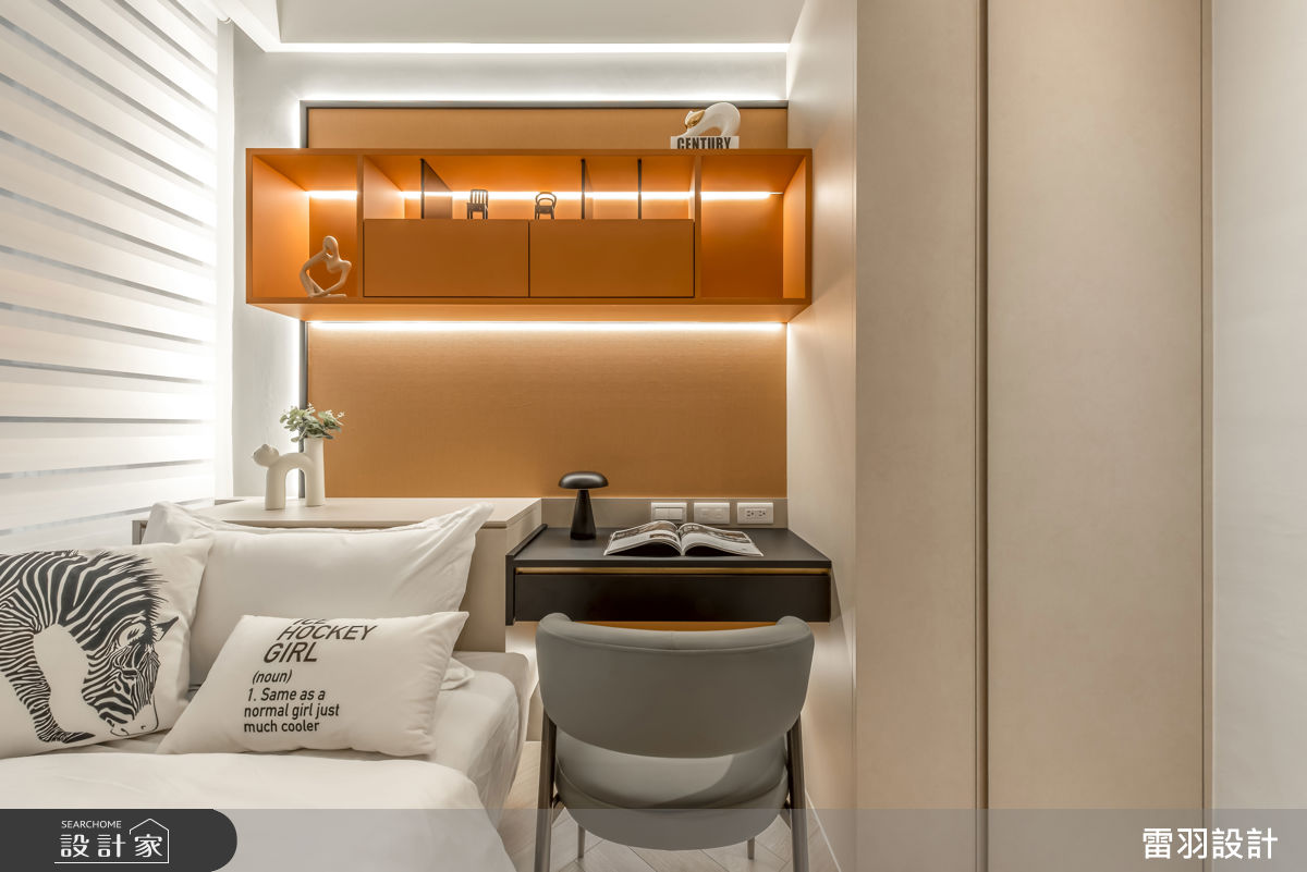 雷羽設計以茶鏡、人造石、金屬飾板、大理石、格柵的搭配應用,呈現輕奢風居家氛圍,將此間22坪、兩房、單層打造成舒適愜意的家庭空間,完成1位大人全家人的夢想之居。