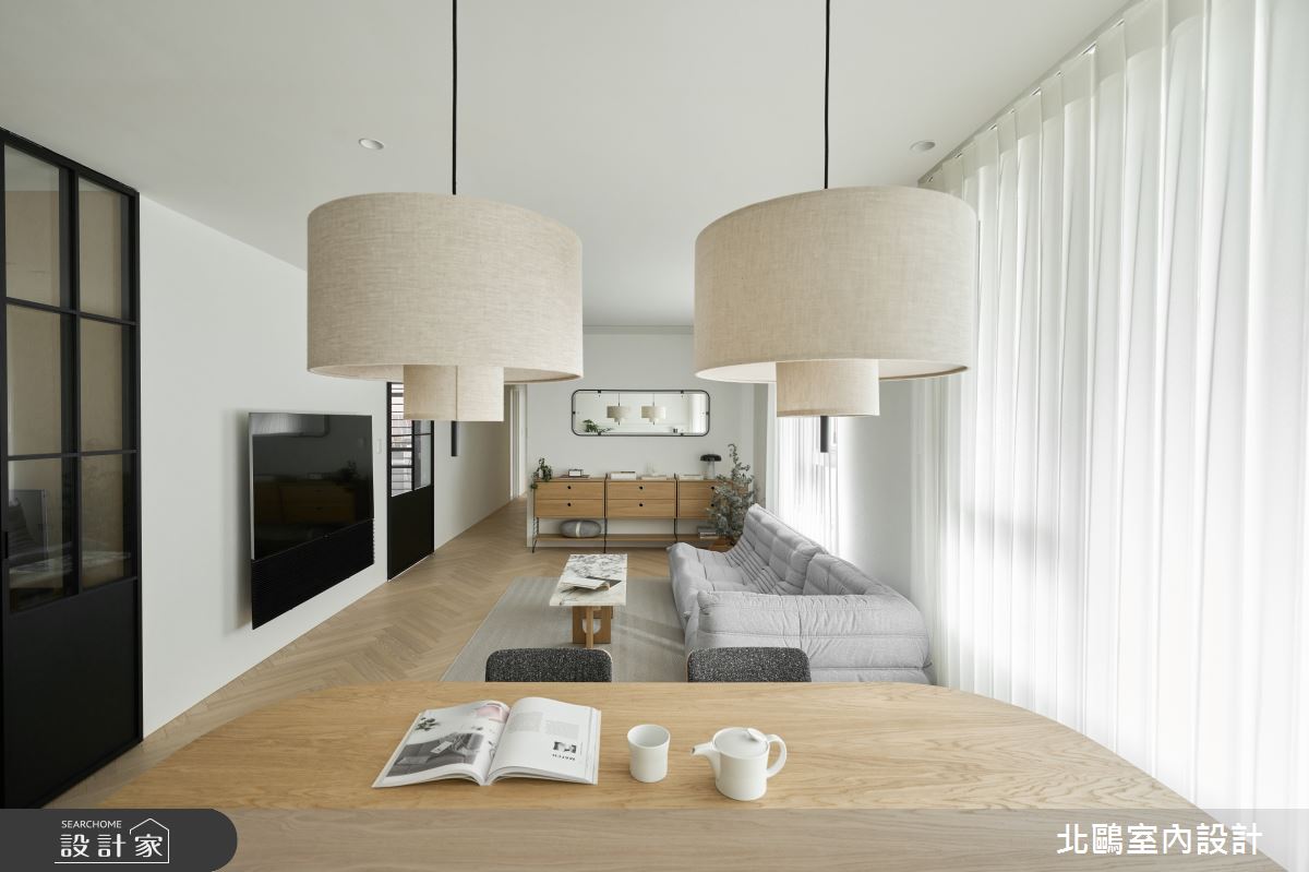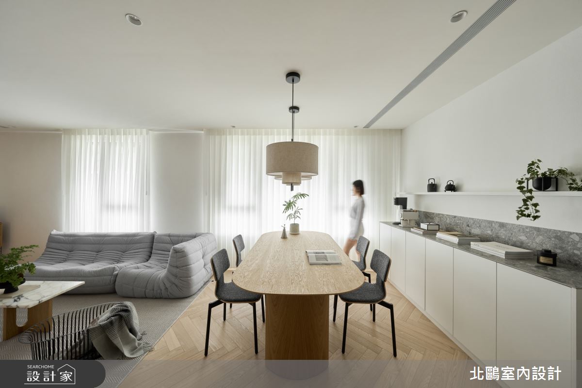 由北鷗室內設計精心規劃的34坪四房住宅空間,家庭成員一共有2位大人、2位小孩。因應屋主需求,設計師運用北歐風作為主軸,搭配乳膠漆、木作貼皮、系統板材、木百葉、木地板、磁磚,打造全家人的夢想家居。