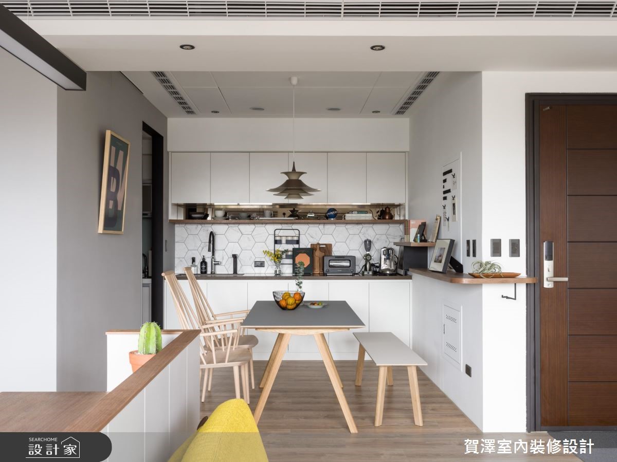 本案為賀澤室內設計的44坪北歐風新成屋(5年以下)設計作品,格局為單層四房的居住空間。居住成員包含1位大人、2位小孩。全室建材的搭配,應用油漆、乳膠漆、六角磚/蜂巢磚、超耐磨木地板、烤玻、木作貼皮、烤漆、磁磚、噴漆,展現溫馨的居家氛圍。