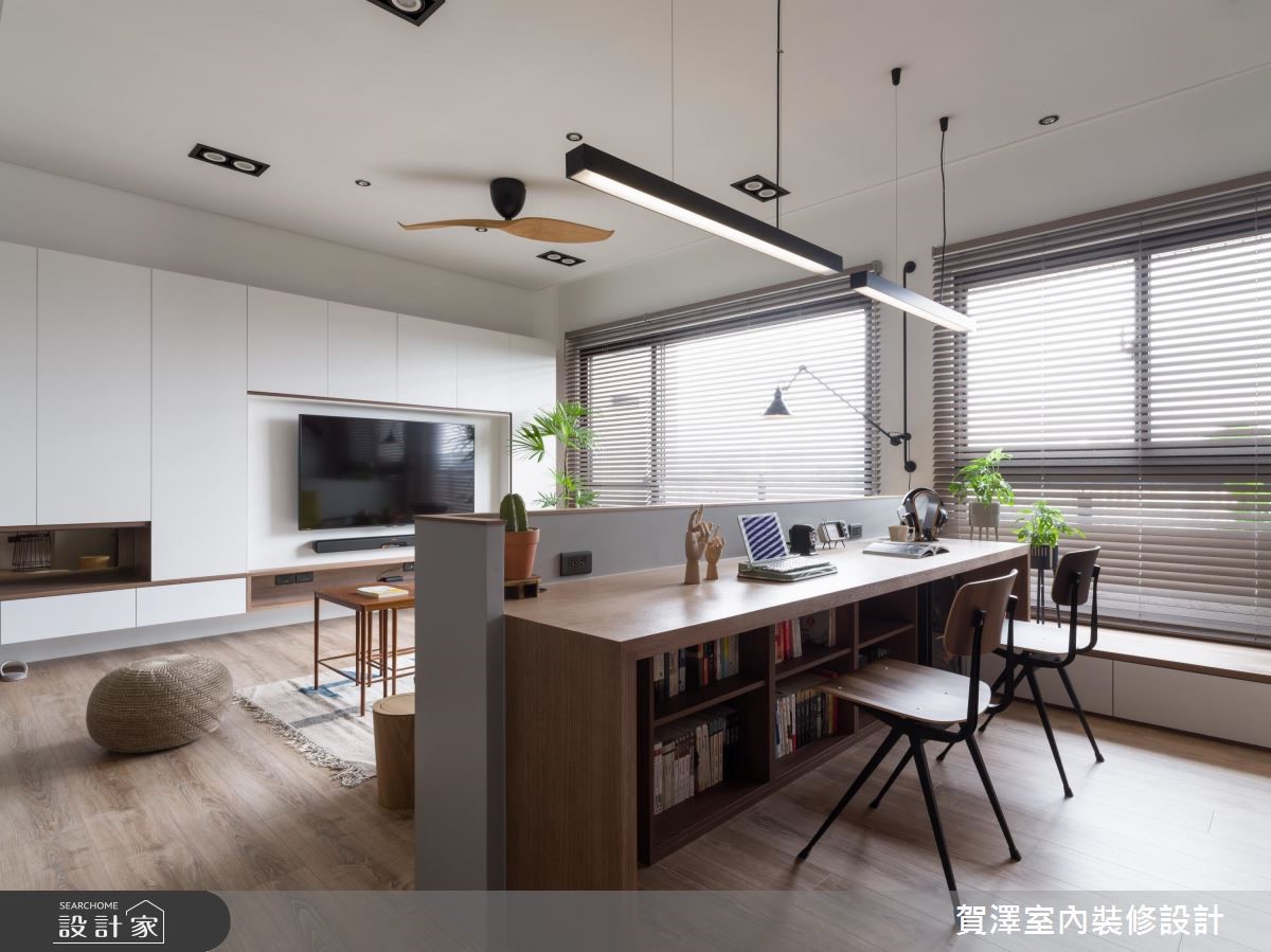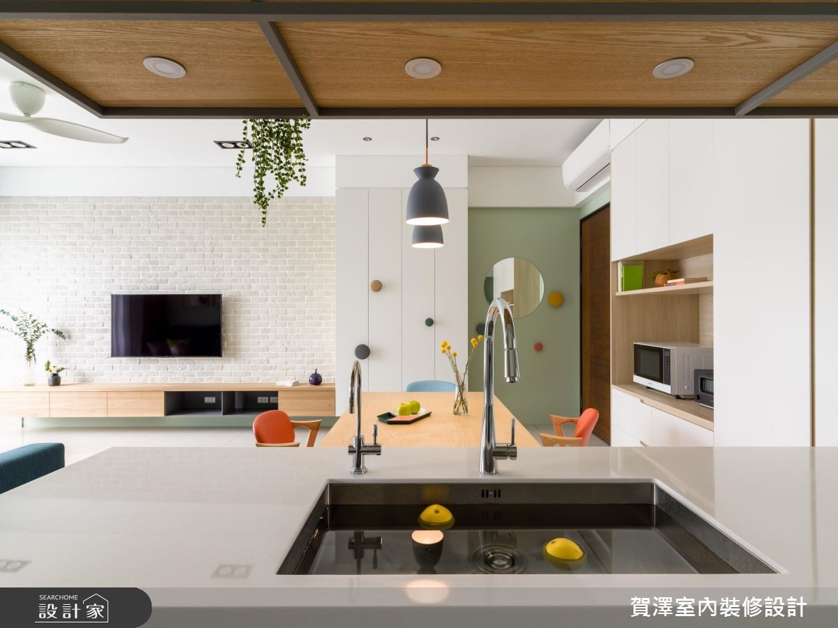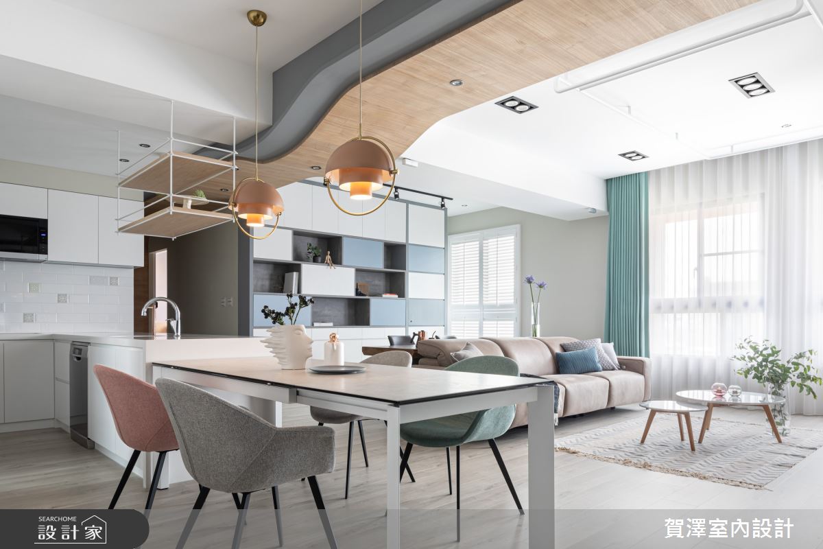 由賀澤室內設計精心規劃的60坪兩房住宅空間,家庭成員一共有2位大人、3位小孩。因應屋主需求,設計師運用北歐風作為主軸,搭配乳膠漆、壁紙、超耐磨木地板、鐵件、烤玻、鍍鈦金屬、木作貼皮、烤漆、鋼刷木皮、系統板材、大理石、木百葉、人造石、軌道燈、薄板磚、特殊漆、茶鏡,打造全家人的夢想家居。