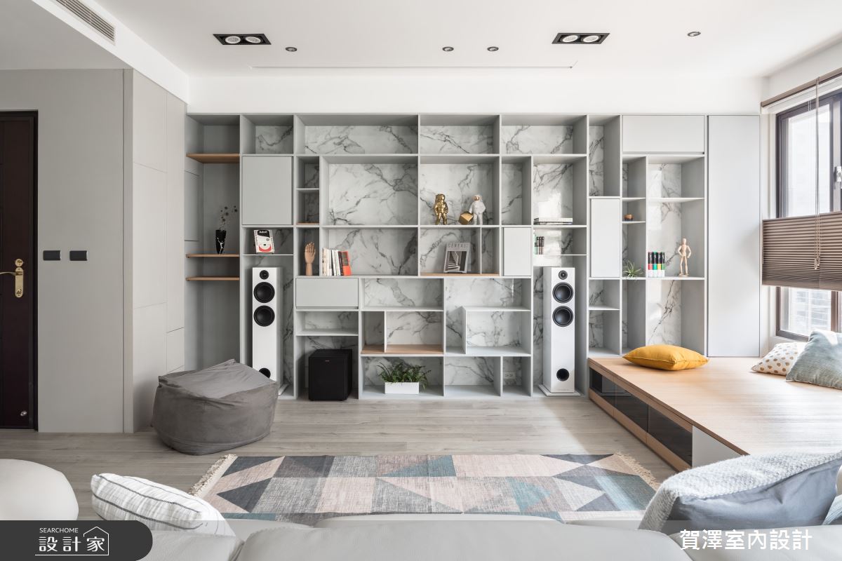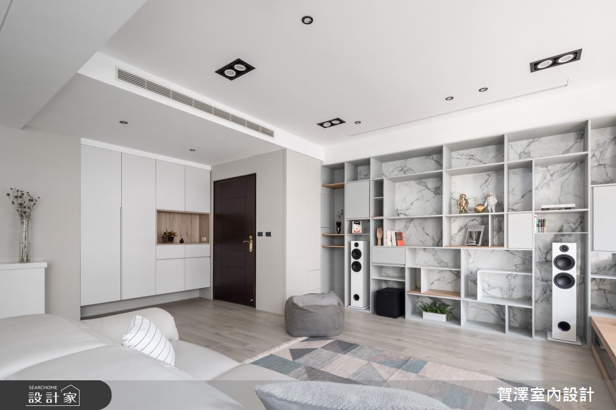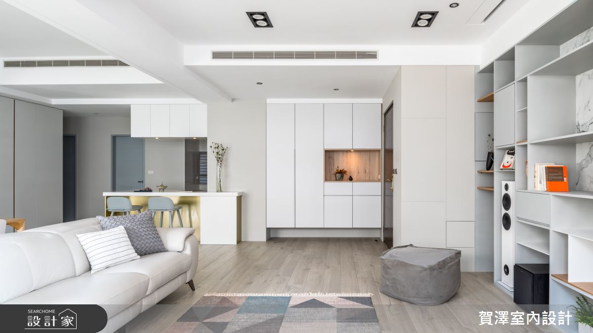 賀澤室內設計以油漆、乳膠漆、超耐磨木地板、石英磚/拋光石英磚、鐵件、灰鏡、茶玻、烤玻、鍍鈦金屬、木作貼皮、烤漆、系統板材、大理石、磁磚、賽麗石的搭配應用,呈現現代簡約風居家氛圍,將此間32坪、兩房、單層、新成屋(5年以下)打造成舒適愜意的家庭空間,完成2位大人、1位小孩全家人的夢想之居。