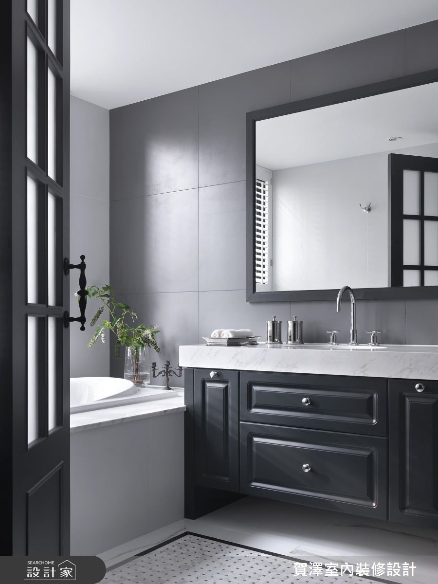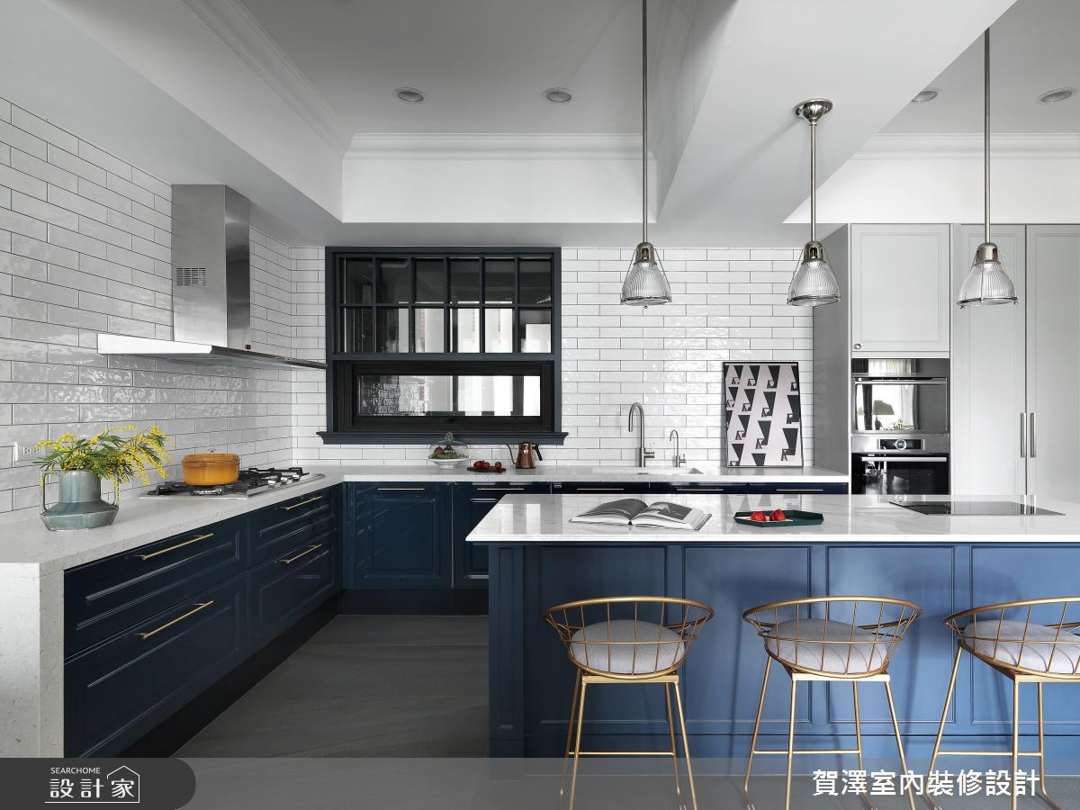 68 坪美式風大宅,設計師引用美式風格作為基底,並納入情境手法形塑空間,以英倫情韻的灰藍佐以黃銅元素點綴,同時針對格局調整,營造舒適的使用情境,打造出屋主心目中的夢想之居,快跟著小編一起來看看吧! 公領域以深色人字拼木地板鋪敘,並採用深淺不同的灰藍形塑輪廓,讓廚房吧檯、餐廳區域與軟裝家具等各顯分明層次,與淡雅灰階相得益彰,在自然光之下的陪襯之下,共同塑造獨一無二的場域美學,而餐廳更特製一座溫暖壁爐,將壁爐結合飾品書櫃,形塑美式風必備的經典元素;廚房,於牆面鋪陳白色磚面,並配置環繞式的工作動線,貼近屋主的使用習慣,再選用深藍包覆吧檯量體,搭配金屬櫃體把手與單椅椅腳,描繪優雅時尚的場景,旁側的房間門片則加入局部玻璃,讓光線可被順勢帶入,與廚房共享美好陽光! 小編的最愛 主臥衛浴引用精巧的工法與工藝,藉由馬賽克磚大面拼貼,創造如同飯店般的美型風格,搭襯深色浴櫃與雙洗手台配置,讓空間質感更為提升!