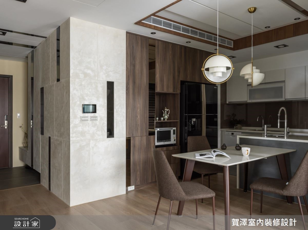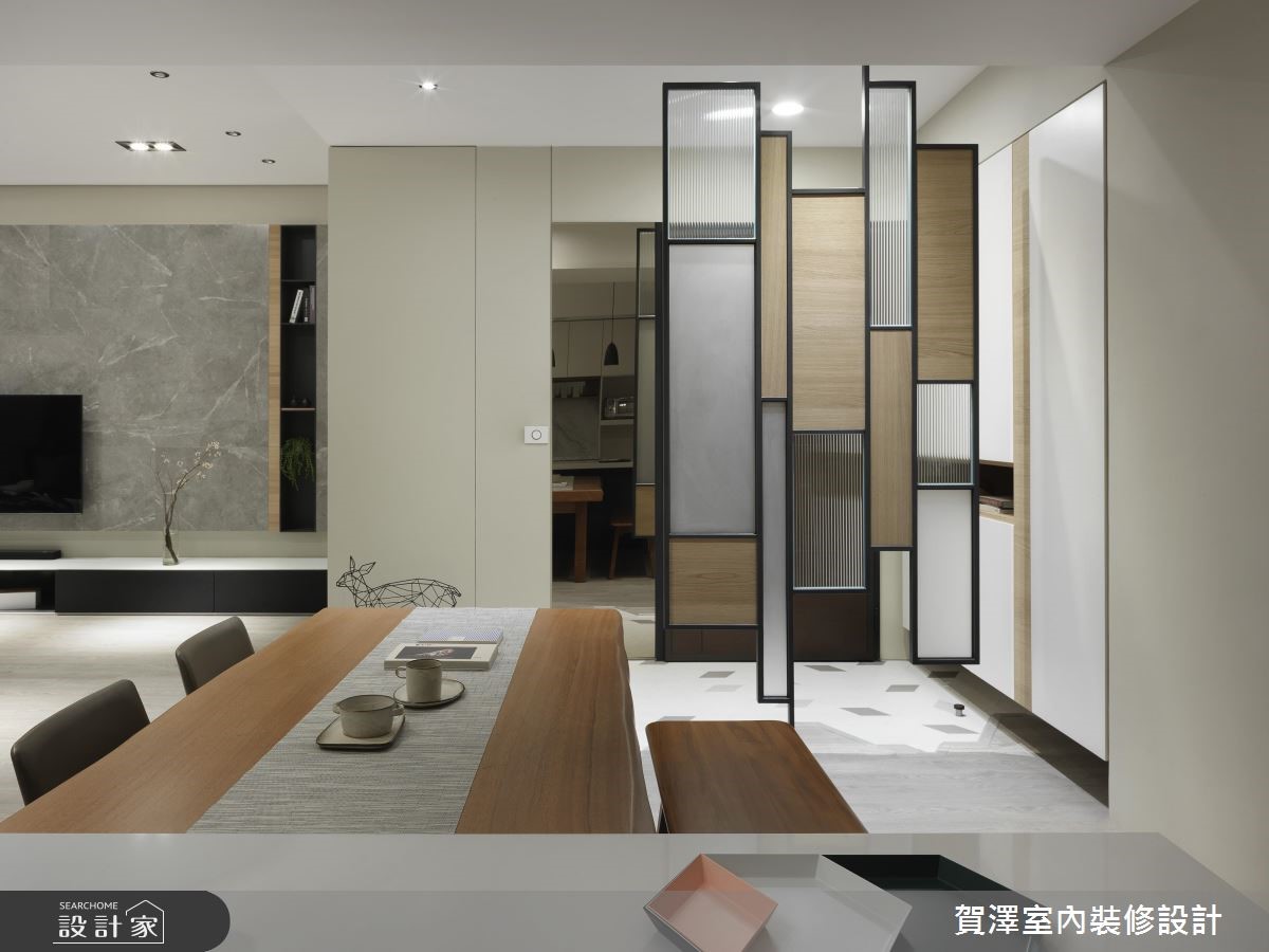 男屋主從事木雕相關的領域,女屋主則是身為插花教授,因此設計師調和兩人對美的觀點與興趣,融入家屋空間裡,形塑雅緻的新東方宅。 入口玄關以特殊漆結合鐵件並鑲嵌小銀波玻璃,兼具細膩與粗獷質感的屏風,可避免一進門就瞥見房門的窘況。整體公領域,以大量的白色為基底,乾淨、簡潔的視覺設計讓空間更為敞朗明亮,同時烘托實木家具的樸實、溫潤,並透過特殊漆紋理的壁面,與鍍鈦金屬材質的妝點,隨著光影的變化,傳遞出細膩質感與多變風情;從入口大門到客廳主牆,利用金屬光澤與砂紋理的特殊漆整合造型,結合中段結合古銅色鍍鈦金屬條,展現現代新意;天花板則利用弧形線條勾勒,修飾大樑、美化銳角線條,而開放式格局的室內規劃,也拉進家人間的距離,增加互動性;餐廚空間整併,復古味道的深色原木餐桌椅,搭配釉綠墨紋薄板磚與鍍鈦金屬條打造的現代中島,達到中西合併的美學展現。 小編的最愛 特別打造一處和室空間,以架高的深色木紋鋪陳地坪,搭佐花藝美學的靜謐空間裡,成為孫子來訪時的遊戲室。